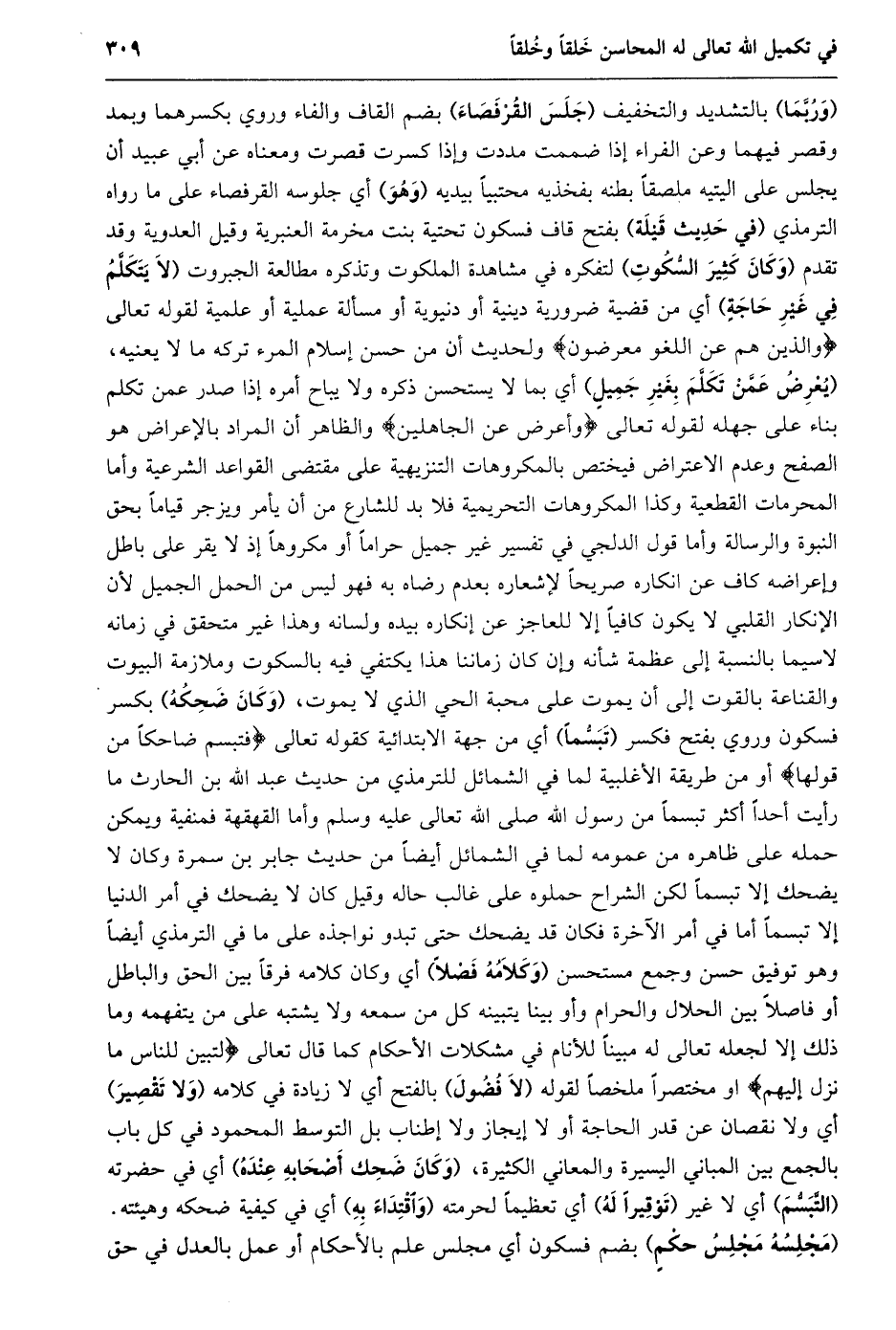 (وربّما) بالتشديد والتخفيف (جلس القرفصاء) بضم القاف والفاء وروي بكسرهما وبمد وقصر فيهما وعن الفراء إذا ضممت مددت وإذا كسرت قصرت ومعناه عن أبي عبيد أن يجلس على اليتيه ملصقا بطنه بفخذيه محتبيا بيديه (وهو) أي جلوسه القرفصاء على ما رواه الترمذي (في حديث قيلة) بفتح قاف فسكون تحتية بنت مخرمة العنبرية وقيل العدوية وقد تقدم (وكان كثير السّكوت) لتفكره في مشاهدة الملكوت وتذكره مطالعة الجبروت (لا يتكلّم في غير حاجة) أي من قضية ضرورية دينية أو دنيوية أو مسألة عملية أو علمية لقوله تعالى وَالَّذِينَ هُمْ عَنِ اللَّغْوِ مُعْرِضُونَ ولحديث أن من حسن إسلام المرء تركه ما لا يعنيه، (يعرض عمّن تكلّم بغير جميل) أي بما لا يستحسن ذكره ولا يباح أمره إذا صدر عمن تكلم بناء على جهله لقوله تعالى وَأَعْرِضْ عَنِ الْجاهِلِينَ والظاهر أن المراد بالإعراض هو الصفح وعدم الاعتراض فيختص بالمكروهات التنزيهية على مقتضى القواعد الشرعية وأما المحرمات القطعية وكذا المكروهات التحريمية فلا بد للشارع من أن يأمر ويزجر قياما بحق النبوة والرسالة وأما قول الدلجي في تفسير غير جميل حراما أو مكروها إذ لا يقر على باطل وإعراضه كاف عن انكاره صريحا لإشعاره بعدم رضاه به فهو ليس من الحمل الجميل لأن الإنكار القلبي لا يكون كافيا إلا للعاجز عن إنكاره بيده ولسانه وهذا غير متحقق في زمانه لا سيما بالنسبة إلى عظمة شأنه وإن كان زماننا هذا يكتفي فيه بالسكوت وملازمة البيوت والقناعة بالقوت إلى أن يموت على محبة الحي الذي لا يموت، (وكان ضحكه) بكسر فسكون وروي بفتح فكسر (تبسّما) أي من جهة الابتدائية كقوله تعالى فَتَبَسَّمَ ضاحِكاً مِنْ قَوْلِها أو من طريقة الأغلبية لما في الشمائل للترمذي من حديث عَبْدُ اللَّهِ بْنُ الْحَارِثِ مَا رَأَيْتُ أَحَدًا أَكْثَرَ تَبَسُّمًا مِنْ رَسُولِ اللَّهِ صَلَّى اللَّهُ تعالى عليه وسلم وأما القهقهة فمنفية ويمكن حمله على ظاهره من عمومه لما في الشمائل أيضا من حديث جابر بن سمرة وكان لا يضحك إلا تبسما لكن الشراح حملوه على غالب حاله وقيل كان لا يضحك في أمر الدنيا إلا تبسما أما في أمر الآخرة فكان قد يضحك حتى تبدو نواجذه على ما في الترمذي أيضا وهو توفيق حسن وجمع مستحسن (وكلامه فصلا) أي وكان كلامه فرقا بين الحق والباطل أو فاصلا بين الحلال والحرام وأو بينا يتبينه كل من سمعه ولا يشتبه على من يتفهمه وما ذلك إلا لجعله تعالى له مبينا للأنام في مشكلات الأحكام كَمَا قَالَ تَعَالَى لِتُبَيِّنَ لِلنَّاسِ مَا نُزِّلَ إِلَيْهِمْ او مختصرا ملخصا لقوله (لا فضول) بالفتح أي لا زيادة في كلامه (ولا تقصير) أي ولا نقصان عن قدر الحاجة أو لا إيجاز ولا إطناب بل التوسط المحمود في كل باب بالجمع بين المباني اليسيرة والمعاني الكثيرة، (وكان ضحك أصحابه عنده) أي في حضرته (التّبسّم) أي لا غير (توقيرا له) أي تعظيما لحرمته (واقتداء به) أي في كيفية ضحكه وهيئته.