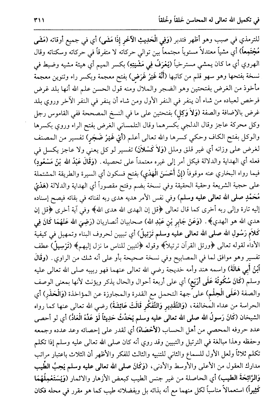 للترمذي في صبب وهو أظهر فتدبر (وفي الحديث الآخر إذا مشى) أي في جميع أوقاته (مشى مجتمعا) أي مشيا معتدلا مستويا مجتمعا بين توالي حركاته لا متفرقا في حركاته وسكناته وقال الهروي أي ما كان يمشي مسترخيا (يعرف في مشيته) بكسر الميم أي هيئة مشيه وضبط في نسخة بفتحها وهو سهو قلم من كاتبها (أنّه غير غرض) بفتح معجمة وبكسر راء وتنوين معجمة مأخوذ من الغرض بفتحتين وهو الضجر والملال ومنه قول الحسن علم الله أنها بلد غرض فرخص لعباده من شاء أن ينفر في النفر الأول ومن شاء أن ينفر في النفر الآخر وروي بلد غرض بالإضافة والصفة (ولا وكل) بفتحتين على ما في النسخ المصححة ففي القاموس رجل وكل محركة عاجز وقال الدلجي بكسرهما وقال التلمساني الغرض بفتح الراء وروي بكسرها والوكل بفتح الكاف وحكي كسرها والله تعالى أعلم (أي غير ضجر) تفسير من المصنف لغرض على وزانه أي غير قلق وملل (ولا كسلان) تفسير لو كل يعني ولا عاجز يكسل في فعله أي الهداية والدلالة فيكل أمر إلى غيره معتمدا على تحصيله. (وقال عبد الله بن مسعود) فيما رواه البخاري عنه موقوفا (إنّ أحسن الهدي) بفتح فسكون أي السيرة والطريقة المشتملة على حجية الشريعة وحقية الحقيقة وفي نسخة بضم وفتح مقصورا أي الهداية والدلالة (هدي محمّد صلى الله تعالى عليه وسلم) وفي نفس الأمر هديه هدى ربه لفنائه في بقائه فيصح إسناده إليه تارة وإلى ربه أخرى كما قال تعالى قُلْ إِنَّ الْهُدى هُدَى اللَّهِ وفي آية أخرى قُلْ إِنَّ هُدَى اللَّهِ هُوَ الْهُدى. (وعن جابر بن عبد الله) صحابيان أنصاريان (رَضِيَ اللَّهُ عَنْهُمَا كَانَ فِي كَلَامِ رَسُولِ الله صلى الله تعالى عليه وسلم ترتيل) أي تبيين لحروف البناء وتمهيل في كيفية الأداء لقوله تعالى وَرَتِّلِ الْقُرْآنَ تَرْتِيلًا وقوله لِتُبَيِّنَ لِلنَّاسِ ما نُزِّلَ إِلَيْهِمْ (ترسيل) عطف تفسير وهو موافق لما في المصابيح وفي نسخة صحيحة بأو على أنه شك من الراوي. (وقال ابن أبي هالة) واسمه هند وأمه خديجة رضي الله تعالى عنهما فهو ربيبه صلى الله تعالى عليه وسلم (كان سكوته على أربع) أي على أربعة أحوال والحال يذكر ويؤنث لأنها بمعنى الوصف والصفة (على الحلم) على جهة التحمل مع القدرة والمجاوزة عن المؤاخذة (والحذر) أي الحراسة من عداء المخالفة، (والتّقدير والتّفكّر قالت عائشة) رضي الله تعالى عنها كما رواه الشيخان (كان رسول الله صلى الله تعالى عَلَيْهِ وَسَلَّمَ يُحَدِّثُ حَدِيثًا لَوْ عَدَّهُ الْعَادُّ) أي لو أحصى عدد حروفه المحصي من أهل الحساب (لأحصاه) أي لقدر على إحصائه وعد عدده وجمعه وحفظه وهذا مبالغة في الترتيل والتبيين وقد روي أنه كان صلى الله تعالى عليه وسلم إذا تكلم تكلم ثلاثا ولعل الأول للسماع والثاني للتنبيه والثالث للفكر والأظهر أن الثلاث باعتبار مراتب مدارك العقول من الأعلى والأوسط والأدنى، (وكان صلى الله تعالى عليه وسلم يحبّ الطّيب والرّائحة الطيب) أي الحاصلة من غير جنس الطيب كبعض الأزهار والاثمار (ويستعملهما كثيرا) استعمالا مناسبا لكل منهما مع أنه بذاته بل وبفضلاته طيب كما هو مقرر في محله فكان