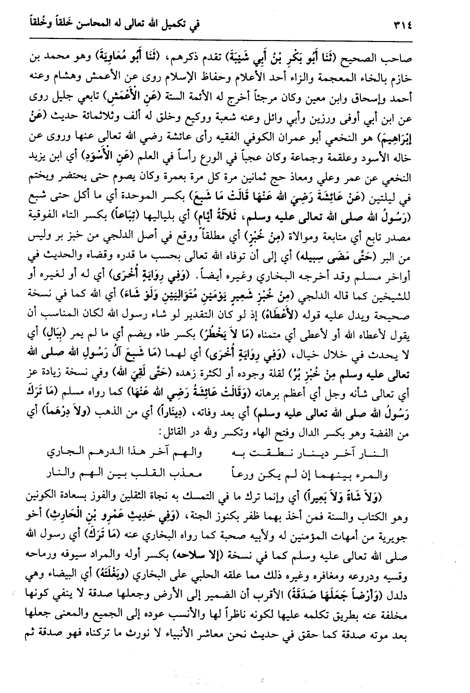 صاحب الصحيح (ثنا أبو بكر بن أبي شيبة) تقدم ذكرهم، (ثنا أبو معاوية) وهو محمد بن خازم بالخاء المعجمة والزاء أحد الأعلام وحفاظ الإسلام روى عن الأعمش وهشام وعنه أحمد وإسحاق وابن معين وكان مرجئا أخرج له الأئمة الستة (عن الأعمش) تابعي جليل روى عن ابن أبي أوفى ورزين وأبي وائل وعنه شعبة ووكيع وخلق له ألف وثلاثمائة حديث (عن إبراهيم) هو النخعي أبو عمران الكوفي الفقيه رأى عائشة رضي الله تعالى عنها وروى عن خاله الأسود وعلقمة وجماعة وكان عجبا في الورع رأسا في العلم (عن الأسود) أي ابن يزيد النخعي عن عمر وعلي ومعاذ حج ثمانين مرة كل مرة بعمرة وكان يصوم حتى يحتضر ويختم في ليلتين (عَنْ عَائِشَةَ رَضِيَ اللَّهُ عَنْهَا قَالَتْ مَا شبع) بكسر الموحدة أي ما أكل حتى شبع (رسول الله صلى الله تعالى عليه وسلم، ثلاثة أيّام) أي بلياليها (تباعا) بكسر التاء الفوقية مصدر تابع أي متابعة وموالاة (من خبز) أي مطلقا ووقع في أصل الدلجي من خبز بر وليس من البر (حتّى مضى سبيله) أي إلى أن توفاه الله تعالى بحسب ما قدره وقضاه والحديث في أواخر مسلم وقد أخرجه البخاري وغيره أيضا. (وفي رواية أخرى) أي له أو لغيره أو للشيخين كما قاله الدلجي (مِنْ خُبْزِ شَعِيرٍ يَوْمَيْنِ مُتَوَالِيَيْنِ وَلَوْ شَاءَ) أي الله كما في نسخة صحيحة ويدل عليه قوله (لأعطاه) إذ لو كان التقدير لو شاء رسول الله لكان المناسب أن يقول لأعطاه الله أو لأعطى أي متمناه (ما لا يخطر) بكسر طاء ويضم أي ما لم يمر (ببال) أي لا يحدث في خلال خيال، (وفي رواية أخرى) أي لهما (مَا شَبِعَ آلُ رَسُولِ اللَّهِ صَلَّى اللَّهُ تعالى عليه وسلم من خبز برّ) لقلة وجوده أو لكثرة زهده (حتّى لقي الله) وفي نسخة زيادة عز أي تعالى شأنه وجل أي أعظم برهانه (وقالت عائشة رضي الله عنها) كما رواه مسلم (ما ترك رسول الله صلى الله تعالى عليه وسلم) أي بعد وفاته، (دينارا) أي من الذهب (ولا درهما) أي من الفضة وهو بكسر الدال وفتح الهاء وتكسر ولله در القائل: