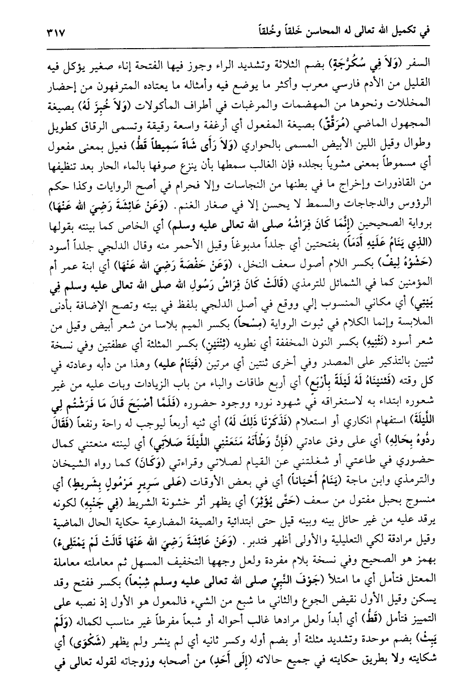 السفر (ولا في سكرّجة) بضم الثلاثة وتشديد الراء وجوز فيها الفتحة إناء صغير يؤكل فيه القليل من الأدم فارسي معرب وأكثر ما يوضع فيه وأمثاله ما يعتاده المترفهون من إحضار المخللات ونحوها من المهضمات والمرغبات في أطراف المأكولات (ولا خبز له) بصيغة المجهول الماضي (مرقّق) بصيغة المفعول أي أرغفة واسعة رقيقة وتسمى الرقاق كطويل وطوال وقيل اللين الأبيض المسمى بالحواري (ولا رأى شاة سميطا قطّ) فعيل بمعنى مفعول أي مسموطا بمعنى مشويا بجلده فإن الغالب سمطها بأن ينزع صوفها بالماء الحار بعد تنظيفها من القاذورات وإخراج ما في بطنها من النجاسات وإلا فحرام في أصح الروايات وكذا حكم الرؤوس والدجاجات والسمط لا يحسن إلا في صغار الغنم. (وعن عائشة رضي الله عنها) برواية الصحيحين (إنّما كان فراشه صلى الله تعالى عليه وسلم) أي الخاص كما بينته بقولها (الذي ينام عليه أدما) بفتحتين أي جلدا مدبوغا وقيل الأحمر منه وقال الدلجي جلدا أسود (حشوه ليف) بكسر اللام أصول سعف النخل، (وعن حفصة رضي الله عنها) أي ابنة عمر أم المؤمنين كما في الشمائل للترمذي (قَالَتْ كَانَ فِرَاشُ رَسُولِ اللَّهِ صَلَّى اللَّهُ تعالى عليه وسلم في بيتي) أي مكاني المنسوب إلي ووقع في أصل الدلجي بلفظ في بيته وتصح الإضافة بأدنى الملابسة وإنما الكلام في ثبوت الرواية (مسحا) بكسر الميم بلاسا من شعر أبيض وقيل من شعر أسود (نثنيه) بكسر النون المخففة أي نطويه (ثنتين) بكسر المثلثة أي عطفتين وفي نسخة ثنيين بالتذكير على المصدر وفي أخرى ثنتين أي مرتين (فينام عليه) وهذا من دأبه وعادته في كل وقته (فثنيناه له ليلة بأربع) أي أربع طاقات والباء من باب الزيادات وبات عليه من غير شعوره ابتداء به لاستغراقه في شهود نوره ووجود حضوره (فلمّا أصبح قال ما فرشتم لي اللّيلة) استفهام انكاري أو استعلام (فذكرنا ذلك له) أي ثنيه أربعا ليوجب له راحة ونفعا (فقال ردّوه بحاله) أي على وفق عادتي (فإنّ وطأته منعتني اللّيلة صلاتي) أي لينته منعتني كمال حضوري في طاعتي أو شغلتني عن القيام لصلاتي وقراءتي (وكان) كما رواه الشيخان والترمذي وابن ماجة (ينام أحيانا) أي في بعض الأوقات (على سرير مرمول بشريط) أي منسوج بحبل مفتول من سعف (حتّى يؤثر) أي يظهر أثر خشونة الشريط (في جنبه) لكونه يرقد عليه من غير حائل بينه وبينه قيل حتى ابتدائية والصيغة المضارعية حكاية الحال الماضية وقيل مرادقة لكي التعليلية والأولى أظهر فتدبر. (وَعَنْ عَائِشَةَ رَضِيَ اللَّهُ عَنْهَا قَالَتْ لَمْ يمتلىء) بهمز هو الصحيح وفي نسخة بلام مفردة ولعل وجهها التخفيف المسهل ثم معاملته معاملة المعتل فتأمل أي ما امتلأ (جوف النّبيّ صلى الله تعالى عليه وسلم شبعا) بكسر ففتح وقد يسكن وقيل الأول نقيض الجوع والثاني ما شبع من الشيء فالمعول هو الأول إذ نصبه على التمييز فتأمل (قطّ) أي أبدا ولعل مرادها غالب أحواله أو شبعا مفرطا غير مناسب لكماله (ولم يبث) بضم موحدة وتشديد مثلثة أو بضم أوله وكسر ثانيه أي لم ينشر ولم يظهر (شكوى) أي شكايته ولا بطريق حكايته في جميع حالاته (إلى أحد) من أصحابه وزوجاته لقوله تعالى في