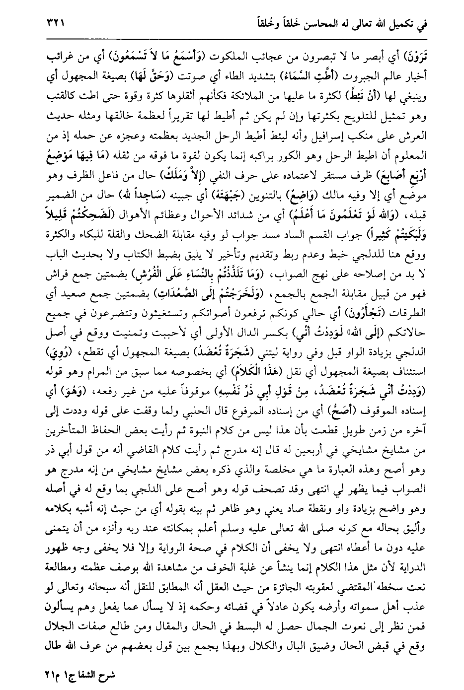 ترون) أي أبصر ما لا تبصرون من عجائب الملكوت (وأسمع ما لا تسمعون) أي من غرائب أخبار عالم الجبروت (أطّت السّماء) بتشديد الطاء أي صوتت (وحقّ لها) بصيغة المجهول أي وينبغي لها (أن تئطّ) لكثرة ما عليها من الملائكة فكأنهم أثقلوها كثرة وقوة حتى اطت كالقتب وهو تمثيل للتلويح بكثرتها وإن لم يكن ثم أطيط لها تقريرا لعظمة خالقها ومثله حديث العرش على منكب إسرافيل وأنه ليئط أطيط الرحل الجديد بعظمته وعجزه عن حمله إذ من المعلوم أن اطيط الرحل وهو الكور براكبه إنما يكون لقوة ما فوقه من ثقله (ما فيها موضع أربع أصابع) ظرف مستقر لاعتماده على حرف النفي (إلّا وملك) حال من فاعل الظرف وهو موضع أي إلا وفيه مالك (واضع) بالتنوين (جبهته) أي جبينه (ساجدا لله) حال من الضمير قبله، (والله لو تعلمون ما أعلم) أي من شدائد الأحوال وعظائم الأهوال (لضحكتم قليلا ولبكيتم كثيرا) جواب القسم الساد مسد جواب لو وفيه مقابلة الضحك والقلة للبكاء والكثرة ووقع هنا للدلجي خبط وعدم ربط وتقديم وتأخير لا يليق بضبط الكتاب ولا بحديث الباب لا بد من إصلاحه على نهج الصواب، (وما تلذّذتم بالنّساء على الفرش) بضمتين جمع فراش فهو من قبيل مقابلة الجمع بالجمع، (ولخرجتم إلى الصّعدات) بضمتين جمع صعيد أي الطرقات (تجأرون) أي حالي كونكم ترفعون أصواتكم وتستغيثون وتتضرعون في جميع حالاتكم (إلى الله» لوددت أنّي) بكسر الدال الأولى أي لأحببت وتمنيت ووقع في أصل الدلجي بزيادة الواو قبل وفي رواية ليتني (شجرة تعضد) بصيغة المجهول أي تقطع، (روي) استئناف بصيغة المجهول أي نقل (هذا الكلام) أي بخصوصه مما سبق من المرام وهو قوله (وَدِدْتُ أَنِّي شَجَرَةٌ تُعْضَدُ، مِنْ قَوْلِ أَبِي ذرّ نفسه) موقوفا عليه من غير رفعه، (وهو) أي إسناده الموقوف (أصحّ) أي من إسناده المرفوع قال الحلبي ولما وقفت على قوله وددت إلى آخره من زمن طويل قطعت بأن هذا ليس من كلام النبوة ثم رأيت بعض الحفاظ المتأخرين من مشايخ مشايخي في أربعين له قال إنه مدرج ثم رأيت كلام القاضي أنه من قول أبي ذر وهو أصح وهذه العبارة ما هي مخلصة والذي ذكره بعض مشايخ مشايخي من إنه مدرج هو الصواب فيما يظهر لي انتهى وقد تصحف قوله وهو أصح على الدلجي بما وقع له في أصله وهو واضح بزيادة واو ونقطة صاد يعني وهو ظاهر ثم بينه بقوله أي من حيث إنه أشبه بكلامه وأليق بحاله مع كونه صلى الله تعالى عليه وسلم أعلم بمكانته عند ربه وأنزه من أن يتمنى عليه دون ما أعطاه انتهى ولا يخفى أن الكلام في صحة الرواية وإلا فلا يخفى وجه ظهور الدراية لأن مثل هذا الكلام إنما ينشأ عن غلبة الخوف من مشاهدة الله بوصف عظمته ومطالعة نعت سخطه المقتضي لعقوبته الجائزة من حيث العقل أنه المطابق للنقل أنه سبحانه وتعالى لو عذب أهل سمواته وأرضه يكون عادلا في قضائه وحكمه إذ لا يسأل عما يفعل وهم يسألون فمن نظر إلى نعوت الجمال حصل له البسط في الحال والمقال ومن طالع صفات الجلال وقع في قبض الحال وضيق البال والكلال وبهذا يجمع بين قول بعضهم من عرف الله طال