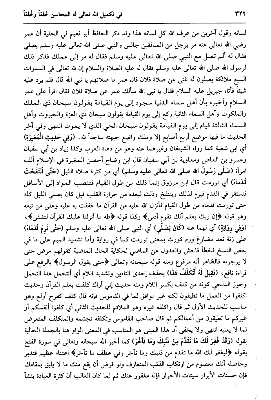 لسانه وقول آخرين من عرف الله كل لسانه هذا وقد ذكر الحافظ أبو نعيم في الحلية أن عمر رضي الله تعالى عنه مر برجل من المنافقين جالس والنبي صلى الله تعالى عليه وسلم يصلي فقال له ألم تصل مع النبي صلى الله تعالى عليه وسلم فقال له مر إلى عملك فذكر ذلك لرسول الله صلى الله تعالى عليه وسلم فقال له عليه الصلاة والسلام إن لله تعالى في السموات السبع ملائكة يصلون له غنى عن صلاة فلان قال عمر ما صلاتهم يا نبي الله قال فلم يرد عليه شيئا فأتاه جبريل عليه السلام فقال يا نبي الله سألك عمر عن صلاة فلان فقال اقرأ على عمر السلام وأخبره بأن أهل سماء الدنيا سجود إلى يوم القيامة يقولون سبحان ذي الملك والملكوت وأهل السماء الثانية ركع إلى يوم القيامة يقولون سبحان ذي العزة والجبروت وأهل السماء الثالثة قيام إلى يوم القيامة يقولون سبحان الحي الذي لا يموت انتهى وفي آخر الحديث ما فيها موضع أربع أَصَابِعَ إِلَّا وَمَلَكٌ وَاضِعٌ جَبْهَتَهُ سَاجِدًا لِلَّهِ. (وفي حديث المغيرة) أي ابن شعبة كما رواه الشيخان وغيرهما عنه وهو من دهاة العرب وكذا زياد بن أبي سفيان وعمرو بن العاص ومعاوية بن أبي سفيان قال ابن وضاح أحصن المغيرة في الإسلام ألف امرأة (صلّى رسول الله صلى الله تعالى عليه وسلم) أي من كثرة صلاة الليل (حتّى انتفخت قدماه) أي تورمت قال ابن مرزوق إنما ذلك من طول القيام فتنصب المواد إلى الأسافل فتستقر في القدم فيرم لذلك وينتفخ وذلك لبعده من حرارة القلب قيل كان يصلي الليل كله حتى تورمت قدماه من طول القيام فأنزل الله عليه من القرآن ما خففت به عليه وعلى من تبعه وهو قوله إِنَّ رَبَّكَ يَعْلَمُ أَنَّكَ تَقُومُ أَدْنى وكذا قوله طه ما أَنْزَلْنا عَلَيْكَ الْقُرْآنَ لِتَشْقى، (وفي رواية) أي لهما عنه (كان يصلّي) أي النبي صلى الله تعالى عليه وسلم (حتّى ترم قدماه) على زنة تعد مضارغ ورم كورث بمعنى تورمت كما في رواية وأما تشديد الميم على ما في بعض النسخ فخطأ فاحش والعدول عن الماضي لحكاية الحال الماضية كقولهم مرض حتى لا يرجونه فالظاهر أنه مرفوع ومنه قوله سبحانه وتعالى حَتَّى يَقُولَ الرَّسُولُ بالرفع على قراءة نافع، (فقيل له أتكلّف هذا) بحذف إحدى التاءين وتشديد اللام أي أتتحمل هذا التحمل وجوز الدلجي كونه من كلف بكسر اللام ومنه حديث إني أراك كلفت بعلم القرآن وحديث اكلفوا من العمل ما تطيقون لكنه غير موافق لما في القاموس فإنه قال كلف كفرح أولع وهو مناسب للحديث الأول ثم قال واكلفه غيره وهو الملائم للحديث الثاني أي كلفوا أنفسكم أو غيركم ما تطيقون من أعمالكم ثم قال صاحب القاموس وتكلفه تجشمه والمتكلف المتعرض لما لا يعنيه انتهى ولا يخفى أن هذا المبنى هو المناسب في المعنى الواو هنا بالجملة الحالية بقوله (وَقَدْ غُفِرَ لَكَ مَا تَقَدَّمَ مِنْ ذَنْبِكَ وما تأخّر) كما أخبر الله سبحانه وتعالى في سورة الفتح بِقَوْلِهِ لِيَغْفِرَ لَكَ اللَّهُ مَا تَقَدَّمَ مِنْ ذَنْبِكَ وَما تَأَخَّرَ وفي عطف ما تأخر اعتناء عظيم فتدبر وحاصله أنك معصوم من ارتكاب الذنب المتعارف ولو فرض أن يقع منك ما لا يليق بمقامك فإن حسنات الأبرار سيئات الأحرار فإنه مغفور عنك ثم لما كان الغالب أن كثرة العبادة ينشأ
