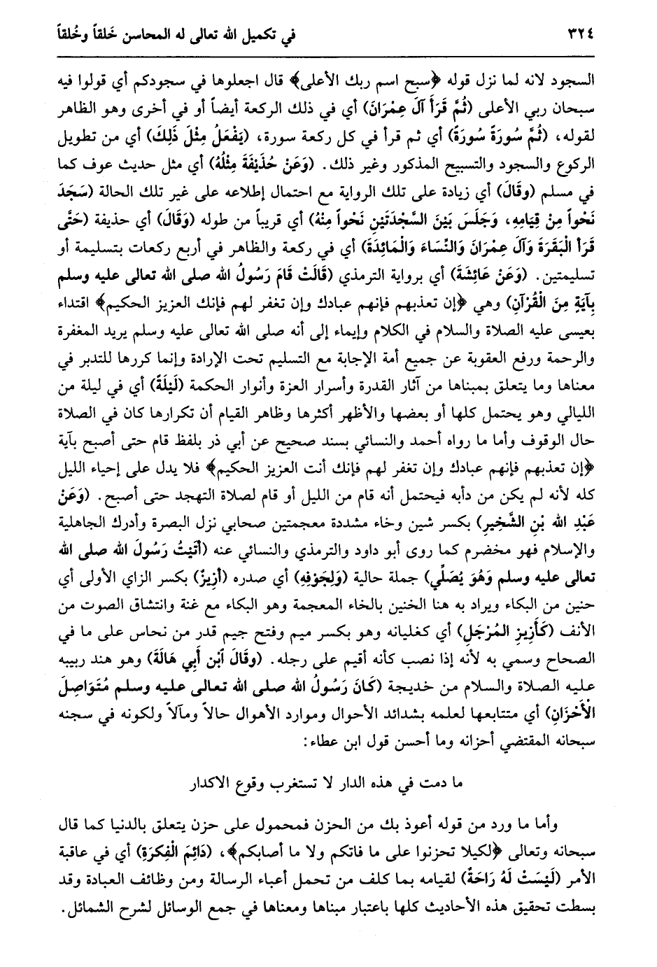 السجود لانه لما نزل قوله سَبِّحِ اسْمَ رَبِّكَ الْأَعْلَى قال اجعلوها في سجودكم أي قولوا فيه سبحان ربي الأعلى (ثمّ قرأ آل عمران) أي في ذلك الركعة أيضا أو في أخرى وهو الظاهر لقوله، (ثمّ سورة سورة) أي ثم قرأ في كل ركعة سورة، (يفعل مثل ذلك) أي من تطويل الركوع والسجود والتسبيح المذكور وغير ذلك. (وعن حذيفة مثله) أي مثل حديث عوف كما في مسلم (وقال) أي زيادة على تلك الرواية مع احتمال إطلاعه على غير تلك الحالة (سَجَدَ نَحْوًا مِنْ قِيَامِهِ، وَجَلَسَ بَيْنَ السَّجْدَتَيْنِ نحوا منه) أي قريبا من طوله (وقال) أي حذيفة (حَتَّى قَرَأَ الْبَقَرَةَ وَآلَ عِمْرَانَ وَالنِّسَاءَ وَالْمَائِدَةَ) أي في ركعة والظاهر في أربع ركعات بتسليمة أو تسليمتين. (وعن عائشة) أي برواية الترمذي (قالت قام رسول الله صلى الله تعالى عليه وسلم بآية من القرآن) وهي إِنْ تُعَذِّبْهُمْ فَإِنَّهُمْ عِبادُكَ وَإِنْ تَغْفِرْ لَهُمْ فَإِنَّكَ أَنْتَ الْعَزِيزُ الْحَكِيمُ اقتداء بعيسى عليه الصلاة والسلام في الكلام وإيماء إلى أنه صلى الله تعالى عليه وسلم يريد المغفرة والرحمة ورفع العقوبة عن جميع أمة الإجابة مع التسليم تحت الإرادة وإنما كررها للتدبر في معناها وما يتعلق بمبناها من آثار القدرة وأسرار العزة وأنوار الحكمة (ليلة) أي في ليلة من الليالي وهو يحتمل كلها أو بعضها والأظهر أكثرها وظاهر القيام أن تكرارها كان في الصلاة حال الوقوف وأما ما رواه أحمد والنسائي بسند صحيح عن أبي ذر بلفظ قام حتى أصبح بآية إِنْ تُعَذِّبْهُمْ فَإِنَّهُمْ عِبادُكَ وَإِنْ تَغْفِرْ لَهُمْ فَإِنَّكَ أَنْتَ الْعَزِيزُ الْحَكِيمُ فلا يدل على إحياء الليل كله لأنه لم يكن من دأبه فيحتمل أنه قام من الليل أو قام لصلاة التهجد حتى أصبح. (وعن عبد الله بن الشّخير) بكسر شين وخاء مشددة معجمتين صحابي نزل البصرة وأدرك الجاهلية والإسلام فهو مخضرم كما روى أبو داود والترمذي والنسائي عنه (أتيت رسول الله صلى الله تعالى عليه وسلم وهو يصلّي) جملة حالية (ولجوفه) أي صدره (أزيز) بكسر الزاي الأولى أي حنين من البكاء ويراد به هنا الخنين بالخاء المعجمة وهو البكاء مع غنة وانتشاق الصوت من الأنف (كأزيز المرجل) أي كغليانه وهو بكسر ميم وفتح جيم قدر من نحاس على ما في الصحاح وسمي به لأنه إذا نصب كأنه أقيم على رجله. (وقال ابن أبي هالة) وهو هند ربيبه عليه الصلاة والسلام من خديجة (كان رسول الله صلى الله تعالى عليه وسلم متواصل الأحزان) أي متتابعها لعلمه بشدائد الأحوال وموارد الأهوال حالا ومآلا ولكونه في سجنه سبحانه المقتضي أحزانه وما أحسن قول ابن عطاء: