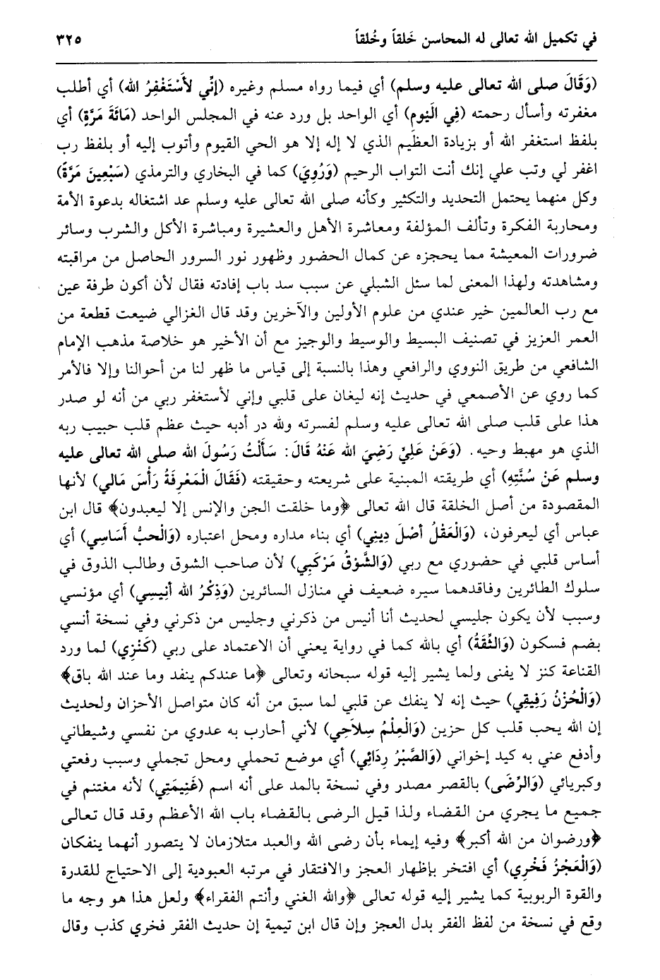 (وقال صلى الله تعالى عليه وسلم) أي فيما رواه مسلم وغيره (إنّي لأستغفر الله) أي أطلب مغفرته وأسأل رحمته (في اليوم) أي الواحد بل ورد عنه في المجلس الواحد (مائة مرّة) أي بلفظ استغفر الله أو بزيادة العظيم الذي لا إله إلا هو الحي القيوم وأتوب إليه أو بلفظ رب اغفر لي وتب علي إنك أنت التواب الرحيم (وروي) كما في البخاري والترمذي (سبعين مرّة) وكل منهما يحتمل التحديد والتكثير وكأنه صلى الله تعالى عليه وسلم عد اشتغاله بدعوة الأمة ومحاربة الفكرة وتألف المؤلفة ومعاشرة الأهل والعشيرة ومباشرة الأكل والشرب وسائر ضرورات المعيشة مما يحجزه عن كمال الحضور وظهور نور السرور الحاصل من مراقبته ومشاهدته ولهذا المعنى لما سئل الشبلي عن سبب سد باب إفادته فقال لأن أكون طرفة عين مع رب العالمين خير عندي من علوم الأولين والآخرين وقد قال الغزالي ضيعت قطعة من العمر العزيز في تصنيف البسيط والوسيط والوجيز مع أن الأخير هو خلاصة مذهب الإمام الشافعي من طريق النووي والرافعي وهذا بالنسبة إلى قياس ما ظهر لنا من أحوالنا وإلا فالأمر كما روي عن الأصمعي في حديث إنه ليغان على قلبي وإني لأستغفر ربي من أنه لو صدر هذا على قلب صلى الله تعالى عليه وسلم لفسرته ولله در أدبه حيث عظم قلب حبيب ربه الذي هو مهبط وحيه. (وَعَنْ عَلِيٍّ رَضِيَ اللَّهُ عَنْهُ قَالَ: سَأَلْتُ رسول الله صلى الله تعالى عليه وسلم عن سنّته) أي طريقته المبنية على شريعته وحقيقته (فقال المعرفة رأس مالي) لأنها المقصودة من أصل الخلقة قال الله تعالى وَما خَلَقْتُ الْجِنَّ وَالْإِنْسَ إِلَّا لِيَعْبُدُونِ قال ابن عباس أي ليعرفون، (والعقل أصل ديني) أي بناء مداره ومحل اعتباره (والحبّ أساسي) أي أساس قلبي في حضوري مع ربي (والشّوق مركبي) لأن صاحب الشوق وطالب الذوق في سلوك الطائرين وفاقدهما سيره ضعيف في منازل السائرين (وذكر الله أنيسي) أي مؤنسي وسبب لأن يكون جليسي لحديث أنا أنيس من ذكرني وجليس من ذكرني وفي نسخة أنسي بضم فسكون (والثّقة) أي بالله كما في رواية يعني أن الاعتماد على ربي (كنزي) لما ورد القناعة كنز لا يفنى ولما يشير إليه قوله سبحانه وتعالى ما عِنْدَكُمْ يَنْفَدُ وَما عِنْدَ اللَّهِ باقٍ (والحزن رفيقي) حيث إنه لا ينفك عن قلبي لما سبق من أنه كان متواصل الأحزان ولحديث إن الله يحب قلب كل حزين (والعلم سلاحي) لأني أحارب به عدوي من نفسي وشيطاني وأدفع عني به كيد إخواني (والصّبر ردائي) أي موضع تحملي ومحل تجملي وسبب رفعتي وكبريائي (والرّضى) بالقصر مصدر وفي نسخة بالمد على أنه اسم (غنيمتي) لأنه مغتنم في جميع ما يجري من القضاء ولذا قيل الرضى بالقضاء باب الله الأعظم وقد قال تعالى وَرِضْوانٌ مِنَ اللَّهِ أَكْبَرُ وفيه إيماء بأن رضى الله والعبد متلازمان لا يتصور أنهما ينفكان (والعجز فخري) أي افتخر بإظهار العجز والافتقار في مرتبه العبودية إلى الاحتياج للقدرة والقوة الربوبية كما يشير إليه قوله تعالى وَاللَّهُ الْغَنِيُّ وَأَنْتُمُ الْفُقَراءُ ولعل هذا هو وجه ما وقع في نسخة من لفظ الفقر بدل العجز وإن قال ابن تيمية إن حديث الفقر فخري كذب وقال