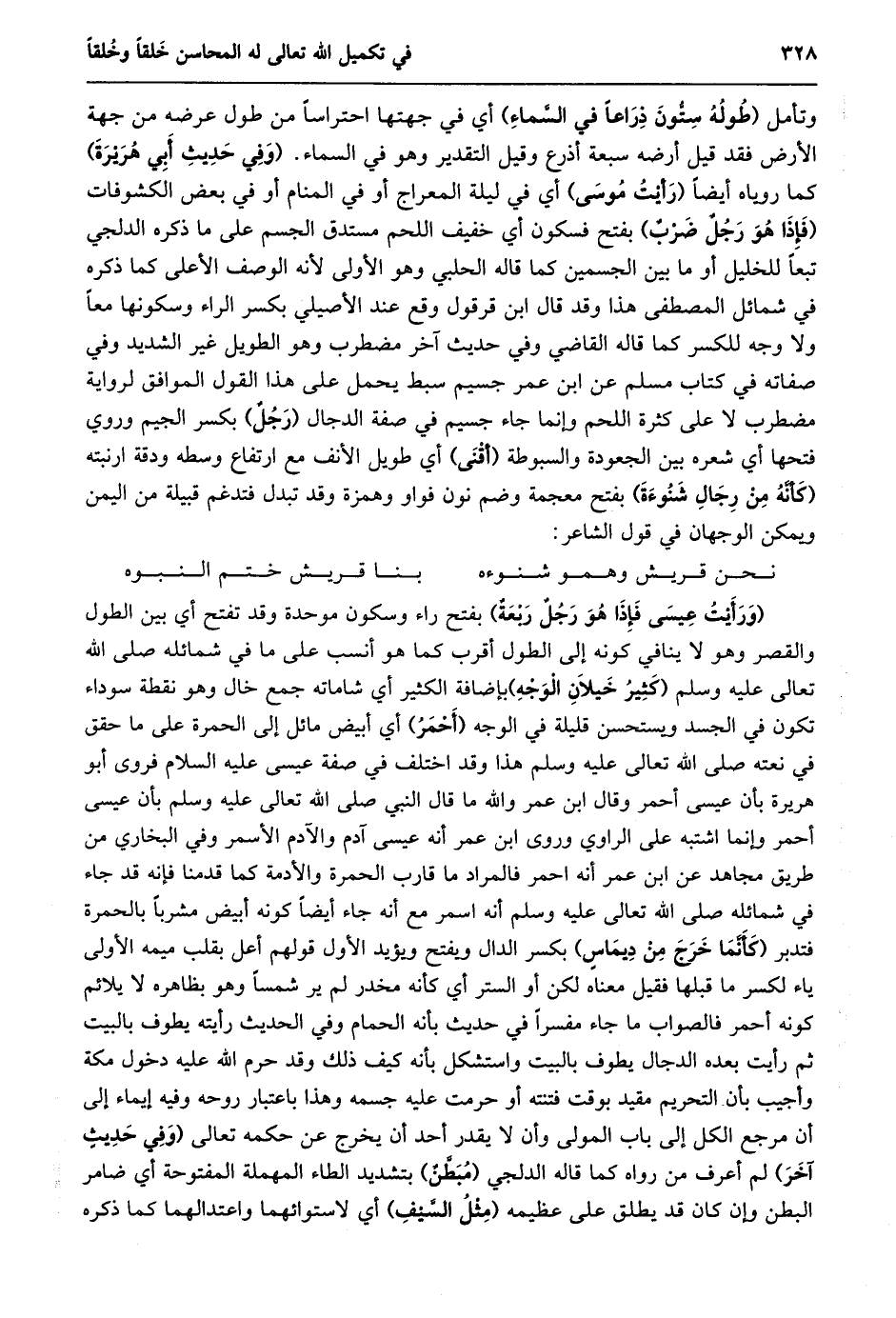 وتأمل (طوله ستّون ذراعا في السّماء) أي في جهتها احتراسا من طول عرضه من جهة الأرض فقد قيل أرضه سبعة أذرع وقيل التقدير وهو في السماء. (وفي حديث أبي هريرة) كما روياه أيضا (رأيت موسى) أي في ليلة المعراج أو في المنام أو في بعض الكشوفات (فإذا هو رجل ضرب) بفتح فسكون أي خفيف اللحم مستدق الجسم على ما ذكره الدلجي تبعا للخليل أو ما بين الجسمين كما قاله الحلبي وهو الأولى لأنه الوصف الأعلى كما ذكره في شمائل المصطفى هذا وقد قال ابن قرقول وقع عند الأصيلي بكسر الراء وسكونها معا ولا وجه للكسر كما قاله القاضي وفي حديث آخر مضطرب وهو الطويل غير الشديد وفي صفاته في كتاب مسلم عن ابن عمر جسيم سبط يحمل على هذا القول الموافق لرواية مضطرب لا على كثرة اللحم وإنما جاء جسيم في صفة الدجال (رجل) بكسر الجيم وروي فتحها أي شعره بين الجعودة والسبوطة (أقنى) أي طويل الأنف مع ارتفاع وسطه ودقة ارنبته (كأنّه من رجال شنوءة) بفتح معجمة وضم نون فواو وهمزة وقد تبدل فتدغم قبيلة من اليمن ويمكن الوجهان في قول الشاعر: