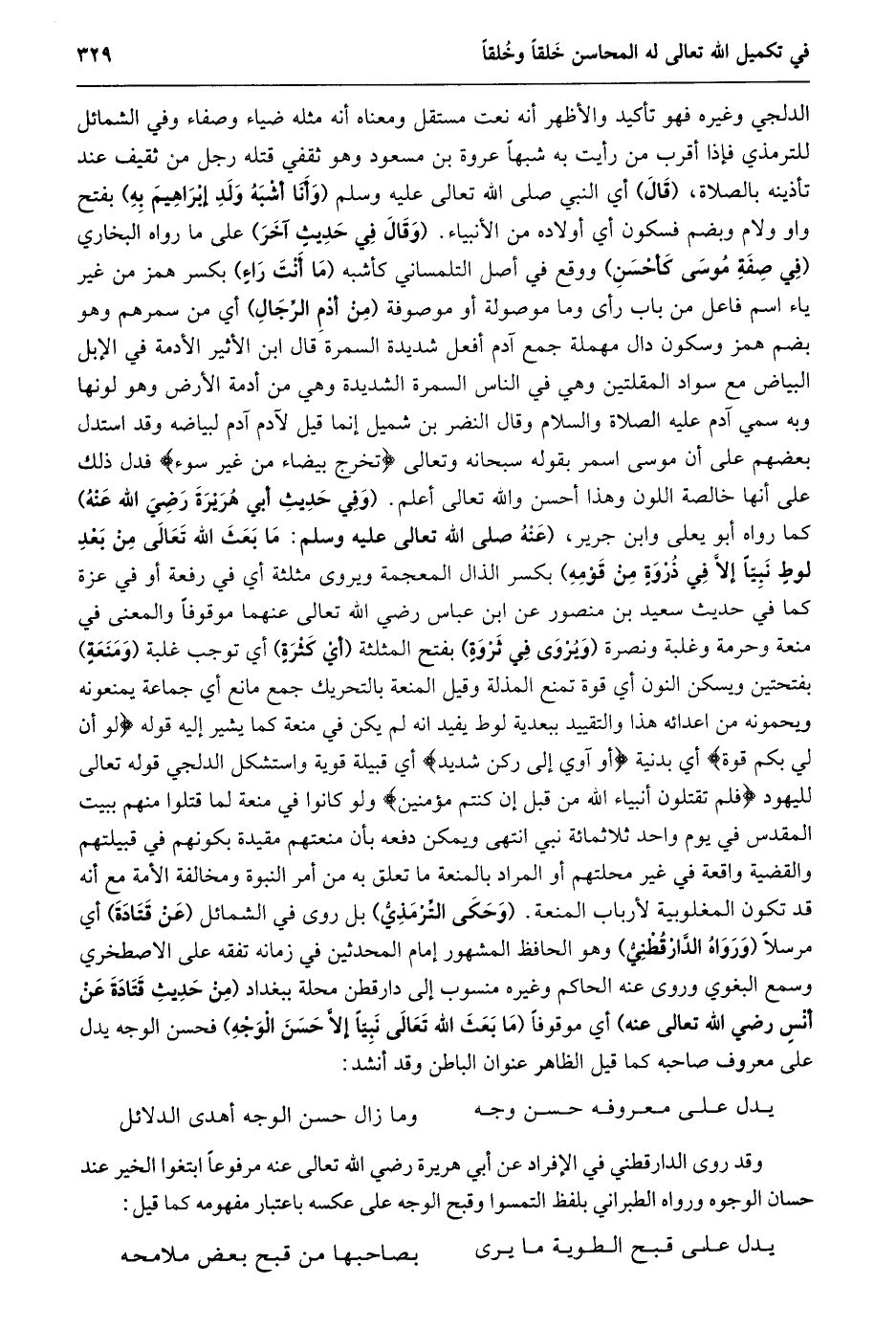 الدلجي وغيره فهو تأكيد والأظهر أنه نعت مستقل ومعناه أنه مثله ضياء وصفاء وفي الشمائل للترمذي فإذا أقرب من رأيت به شبها عروة بن مسعود وهو ثقفي قتله رجل من ثقيف عند تأذينه بالصلاة، (قال) أي النبي صلى الله تعالى عليه وسلم (وأنا أشبه ولد إبراهيم به) بفتح واو ولام وبضم فسكون أي أولاده من الأنبياء. (وقال في حديث آخر) على ما رواه البخاري (في صفة موسى كأحسن) ووقع في أصل التلمساني كأشبه (ما أنت راء) بكسر همز من غير ياء اسم فاعل من باب رأى وما موصولة أو موصوفة (من أدم الرّجال) أي من سمرهم وهو بضم همز وسكون دال مهملة جمع آدم أفعل شديدة السمرة قال ابن الأثير الأدمة في الإبل البياض مع سواد المقلتين وهي في الناس السمرة الشديدة وهي من أدمة الأرض وهو لونها وبه سمي آدم عليه الصلاة والسلام وقال النضر بن شميل إنما قيل لآدم آدم لبياضه وقد استدل بعضهم على أن موسى اسمر بقوله سبحانه وتعالى تَخْرُجْ بَيْضاءَ مِنْ غَيْرِ سُوءٍ فدل ذلك على أنها خالصة اللون وهذا أحسن والله تعالى أعلم. (وَفِي حَدِيثِ أَبِي هُرَيْرَةَ رَضِيَ اللَّهُ عَنْهُ) كما رواه أبو يعلى وابن جرير، (عنه صلى الله تعالى عَلَيْهِ وَسَلَّمَ: مَا بَعَثَ اللَّهُ تَعَالَى مِنْ بَعْدِ لُوطٍ نَبِيًّا إِلَّا فِي ذُرْوَةٍ مِنْ قومه) بكسر الذال المعجمة ويروى مثلثة أي في رفعة أو في عزة كما في حديث سعيد بن منصور عن ابن عباس رضي الله تعالى عنهما موقوفا والمعنى في منعة وحرمة وغلبة ونصرة (ويروى في ثروة) بفتح المثلثة (أي كثرة) أي توجب غلبة (ومنعة) بفتحتين ويسكن النون أي قوة تمنع المذلة وقيل المنعة بالتحريك جمع مانع أي جماعة يمنعونه ويحمونه من اعدائه هذا والتقييد ببعدية لوط يفيد انه لم يكن في منعة كما يشير إليه قوله لَوْ أَنَّ لِي بِكُمْ قُوَّةً أي بدنية أَوْ آوِي إِلى رُكْنٍ شَدِيدٍ أي قبيلة قوية واستشكل الدلجي قوله تعالى لليهود فَلِمَ تَقْتُلُونَ أَنْبِياءَ اللَّهِ مِنْ قَبْلُ إِنْ كُنْتُمْ مُؤْمِنِينَ ولو كانوا في منعة لما قتلوا منهم ببيت المقدس في يوم واحد ثلاثمائة نبي انتهى ويمكن دفعه بأن منعتهم مقيدة بكونهم في قبيلتهم والقضية واقعة في غير محلتهم أو المراد بالمنعة ما تعلق به من أمر النبوة ومخالفة الأمة مع أنه قد تكون المغلوبية لأرباب المنعة. (وحكى التّرمذيّ) بل روى في الشمائل (عن قتادة) أي مرسلا (ورواه الدّارقطنيّ) وهو الحافظ المشهور إمام المحدثين في زمانه تفقه على الاصطخري وسمع البغوي وروى عنه الحاكم وغيره منسوب إلى دار قطن محلة ببغداد (من حديث قتادة عن أنس رضي الله تعالى عنه) أي موقوفا (ما بعث الله تعالى نبيّا إلّا حسن الوجه) فحسن الوجه يدل على معروف صاحبه كما قيل الظاهر عنوان الباطن وقد أنشد: