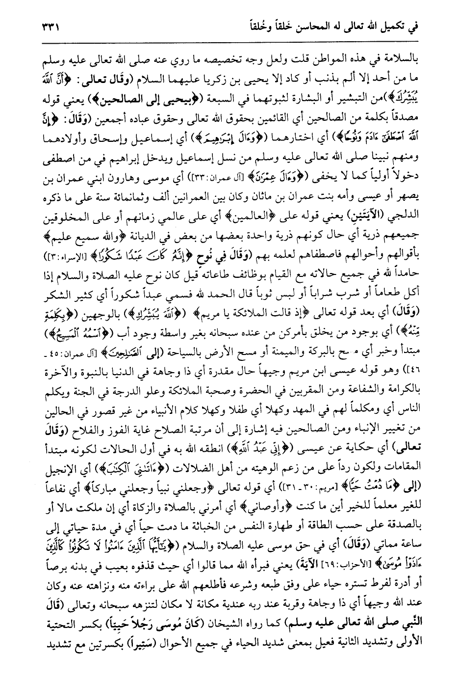 بالسلامة في هذه المواطن قلت ولعل وجه تخصيصه ما روي عنه صلى الله تعالى عليه وسلم مَا مِنْ أَحَدٍ إِلَّا أَلَمَّ بِذَنْبٍ أَوْ كاد إلا يحيى بن زكريا عليهما السلام (وقال تعالى: أَنَّ اللَّهَ يُبَشِّرُكَ) من التبشير أو البشارة لثبوتهما في السبعة (بِيَحْيى إلى الصَّالِحِينَ) يعني قوله مصدقا بكلمة من الصالحين أي القائمين بحقوق الله تعالى وحقوق عباده أجمعين (وقال: إِنَّ اللَّهَ اصْطَفى آدَمَ وَنُوحاً) أي اختارهما (وَآلَ إِبْراهِيمَ) أي إسماعيل وإسحاق وأولادهما ومنهم نبينا صلى الله تعالى عليه وسلم من نسل إسماعيل ويدخل إبراهيم في من اصطفى دخولا أوليا كما لا يخفى (وَآلَ عِمْرانَ [آل عمران: 33] ) أي موسى وهارون ابني عمران بن يصهر أو عيسى وأمه بنت عمران بن ماثان وكان بين العمرانين ألف وثمانمائة سنة على ما ذكره الدلجي (الآيتين) يعني قوله عَلَى الْعالَمِينَ أي على عالمي زمانهم أو على المخلوقين جميعهم ذرية أي حال كونهم ذرية واحدة بعضها من بعض في الديانة وَاللَّهُ سَمِيعٌ عَلِيمٌ بأقوالهم وأحوالهم فاصطفاهم لعلمه بهم (وَقَالَ فِي نُوحٍ إِنَّهُ كانَ عَبْداً شَكُوراً [الإسراء: 3] ) حامدا لله في جميع حالاته مع القيام بوظائف طاعاته قيل كان نوح عليه الصلاة والسلام إذا أكل طعاما أو شرب شرابا أو لبس ثوبا قال الحمد لله فسمي عبدا شكورا أي كثير الشكر (وقال) أي بعد قوله تعالى إِذْ قالَتِ الْمَلائِكَةُ يا مَرْيَمُ (اللَّهَ يُبَشِّرُكِ) بالوجهين (بِكَلِمَةٍ مِنْهُ) أي بوجود من يخلق بأمركن من عنده سبحانه بغير واسطة وجود أب (اسْمُهُ الْمَسِيحُ) مبتدأ وخبر أي مسح بالبركة والميمنة أو مسح الأرض بالسياحة (إلى الصَّالِحِينَ [آل عمران: 45- 46] ) وهو قوله عيسى ابن مريم وجيها حال مقدرة أي ذا وجاهة في الدنيا بالنبوة والآخرة بالكرامة والشفاعة ومن المقربين في الحضرة وصحبة الملائكة وعلو الدرجة في الجنة ويكلم الناس أي ومكلما لهم في المهد وكهلا أي طفلا وكهلا كلام الأنبياء من غير قصور في الحالين من تغيير الإنباء ومن الصالحين فيه إشارة إلى أن مرتبة الصلاح غاية الفوز والفلاح (وقال تعالى) أي حكاية عن عيسى (إِنِّي عَبْدُ اللَّهِ) انطقه الله به في أول الحالات لكونه مبتدأ المقامات ولكون ردا على من زعم الوهيته من أهل الضلالات (آتانِيَ الْكِتابَ) أي الإنجيل (إلى ما دُمْتُ حَيًّا [مريم: 30- 31] ) أي قوله تعالى وَجَعَلَنِي نَبِيًّا وَجَعَلَنِي مُبارَكاً أي نفاعا للغير معلما للخير أين ما كنت وَأَوْصانِي أي أمرني بالصلاة والزكاة أي إن ملكت مالا أو بالصدقة على حسب الطاقة أو طهارة النفس من الخباثة ما دمت حيا أي في مدة حياتي إلى ساعة مماتي (وقال) أي في حق موسى عليه الصلاة والسلام (يا أَيُّهَا الَّذِينَ آمَنُوا لَا تَكُونُوا كَالَّذِينَ آذَوْا مُوسى [الأحزاب: 69] الآية) يعني فبرأه الله مما قالوا أي حيث قذفوه بعيب في بدنه برصا أو أدرة لفرط تستره حياء على وفق طبعه وشرعه فأطلعهم الله على براءته منه ونزاهته عنه وكان عند الله وجيها أي ذا وجاهة وقربة عند ربه عندية مكانة لا مكان لتنزهه سبحانه وتعالى (قال النّبي صلى الله تعالى عليه وسلم) كما رواه الشيخان (كان موسى رجلا حييّا) بكسر التحتية الأولى وتشديد الثانية فعيل بمعنى شديد الحياء في جميع الأحوال (ستيرا) بكسرتين مع تشديد