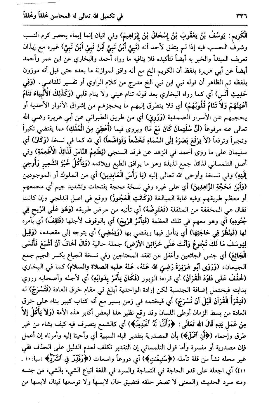 الْكَرِيمِ: يُوسُفُ بْنُ يَعْقُوبَ بْنِ إِسْحَاقَ بْنِ إبراهيم) وفي اتيان إنما إيماء بحصر كرم النسب وشرف الحسب فيه إذا لم يتفق لأحد أنه (نَبِيٌّ ابْنُ نَبِيٍّ ابْنُ نَبِيٍّ ابْنُ نَبِيٍّ) غيره مع إيذان تعريف المبتدأ والخبر به أيضا لتأكيده فلا ينافيه ما رواه أحمد والبخاري عن ابن عمر وأحمد أيضا عن أبي هريرة بلفظ أن الكريم الخ مع أنه وافق لموازنة ما بعده حتى قيل أنه موزون بلفظه ثم الظاهر أن قوله نبي ابن نبي الخ مدرج من كلام الراوي أو تفسير للقاضي. (وفي حديث أنس) أي كما رواه البخاري بعد قوله تنام عيني ولا ينام قلبي (وَكَذَلِكَ الْأَنْبِيَاءُ تَنَامُ أَعْيُنُهُمْ وَلَا تَنَامُ قُلُوبُهُمْ) أي فلا يتطرق إليهم ما يحجزهم من إشراق الأنوار الأحدية أو يحجبهم عن الأسرار الصمدية (وروي) أي من طريق الطبراني عن أبي هريرة رضي الله تعالى عنه مرفوعا (أنّ سليمان كان مع ما) ويروى فيما (أعطي من الملك) مما يقتضي تكبرا وتجبرا وترفعا (لَا يَرْفَعُ بَصَرَهُ إِلَى السَّمَاءِ تَخَشُّعًا وَتَوَاضُعًا) أي لله كما في نسخة (وكان) أي سليمان على ما روى أحمد في الزهد عن فرقد السنجي (يطعم النّاس لذائذ الأطعمة) وفي أصل التلمساني لذائذ جمع لذيذة وهو ما يوافق الطبع ويلائمه (ويأكل خبز الشّعير وأوحي إليه) وفي نسخة وأوحى الله تعالى إليه (يا رأس العابدين) أي من الملوك أو الموجودين (وابن محجّة الزّاهدين) أي على غيره وفي نسخة محجة بفتحات وتشديد جيم أي مجمعهم أو معظم طريقهم وفيه غاية المبالغة (وكانت العجوز) ووقع في اصل الدلجي وإن كانت فقال هي المخففة من المثقلة (تعترضه) أي تأتيه من عرض طريقه (وهو على الرّيح في جنوده) أي وهو معهم في تلك العظمة (فيأمر الرّيح) أي بالوقوف لأجلها (فتقف) أي بأمره لها (فينظر في حاجتها) أي يتأمل فيها ويقضي بها (ويمضي) أي يتوجه إلى مقصده، (وَقِيلَ لِيُوسُفَ مَا لَكَ تَجُوعُ وَأَنْتَ عَلَى خزائن الأرض) جملة حالية (قال أخاف أن أشبع فأنسى الجائع) أي جنس الجائعين وأغفل عن تفقد المحتاجين وفي نسخة الجياع بكسر الجيم جمع الجيعان، (وَرَوَى أَبُو هُرَيْرَةَ رَضِيَ اللَّهُ عَنْهُ، عَنْهُ عليه الصلاة والسلام) كما في البخاري (خفّف على داود القرآن) أي قراءة الزبور (فكان يأمر بدوابّه) أي لأجله وأصحابه وروي بدابته فيحتمل إضافة الجنسية لكن إرادة الواحدية أبلغ في مقام خرق العادة (فتسرج) له (فيقرأ القرآن قبل أن تسرج) أي فيختمه في زمن يسير مع أنه كتاب كبير بناء على خرق العادة من بسط الزمان أوطى اللسان وقد وقع نظير هذا لبعض أكابر هذه الأمة (وَلَا يَأْكُلُ إِلَّا مِنْ عَمَلِ يَدِهِ قَالَ الله تعالى: وَأَلَنَّا لَهُ الْحَدِيدَ) أي كالشمع يتصرف فيه كيف يشاء من غير طرق وإحماء (أَنِ اعْمَلْ) بأن المصدرية بتقدير الباء السببية أي وأحينا إليه وأمرناه إن أعمل فإن مصدرية أو مفسرة وأما قول التلمساني إن التقدير تكلف لعدم الدليل على الحذف ففي غير محله نشأ من قلة تأمله (سابِغاتٍ) أي دروعا واسعات (وَقَدِّرْ فِي السَّرْدِ) [سبأ: 10- 11] ) أي اجعله على قدر الحاجة في النساجة والسرد في اللغة اتباع الشيء بالشيء من جنسه ومنه سرد الحديث والمعنى لا تصغر حلقه فتضيق حال لابسها ولا توسعها فينال لابسها من
