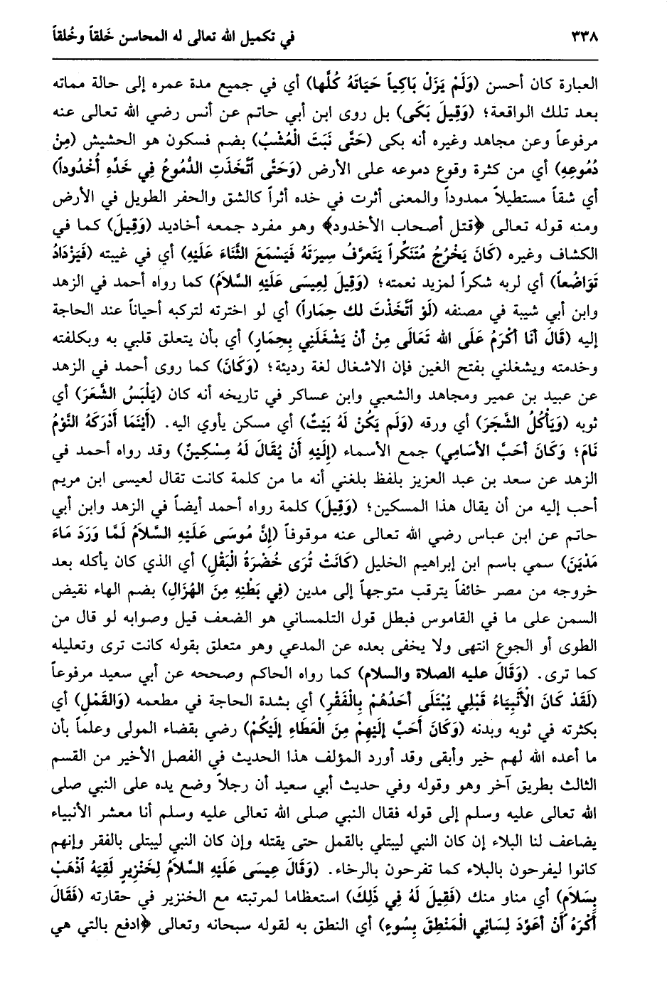 العبارة كان أحسن (ولم يزل باكيا حياته كلّها) أي في جميع مدة عمره إلى حالة مماته بعد تلك الواقعة؛ (وقيل بكى) بل روى ابن أبي حاتم عن أنس رضي الله تعالى عنه مرفوعا وعن مجاهد وغيره أنه بكى (حتّى نبت العشب) بضم فسكون هو الحشيش (من دموعه) أي من كثرة وقوع دموعه على الأرض (وحتّى اتّخذت الدّموع في خدّه أخدودا) أي شقا مستطيلا ممدودا والمعنى أثرت في خده أثرا كالشق والحفر الطويل في الأرض ومنه قوله تعالى قُتِلَ أَصْحابُ الْأُخْدُودِ وهو مفرد جمعه أخاديد (وقيل) كما في الكشاف وغيره (كان يخرج متنكّرا يتعرّف سيرته فيسمع الثّناء عليه) أي في غيبته (فيزداد تواضعا) أي لربه شكرا لمزيد نعمته؛ (وقيل لعيسى عليه السّلام) كما رواه أحمد في الزهد وابن أبي شيبة في مصنفه (لو اتّخذت لك حمارا) أي لو اخترته لتركبه أحيانا عند الحاجة إليه (قال أنا أكرم على الله تعالى من أن يشغلني بحمار) أي بأن يتعلق قلبي به وبكلفته وخدمته ويشغلني بفتح الغين فإن الاشغال لغة رديئة؛ (وكان) كما روى أحمد في الزهد عن عبيد بن عمير ومجاهد والشعبي وابن عساكر في تاريخه أنه كان (يلبس الشّعر) أي ثوبه (ويأكل الشّجر) أي ورقه (ولم يكن له بيت) أي مسكن يأوي اليه. (أَيْنَمَا أَدْرَكَهُ النَّوْمُ نَامَ؛ وَكَانَ أَحَبُّ الْأَسَامِي) جمع الأسماء (إليه أن يقال له مسكين) وقد رواه أحمد في الزهد عن سعد بن عبد العزيز بلفظ بلغني أنه ما من كلمة كانت تقال لعيسى ابن مريم أحب إليه من أن يقال هذا المسكين؛ (وقيل) كلمة رواه أحمد أيضا في الزهد وابن أبي حاتم عن ابن عباس رضي الله تعالى عنه موقوفا (إِنَّ مُوسَى عَلَيْهِ السَّلَامُ لَمَّا وَرَدَ مَاءَ مدين) سمي باسم ابن إبراهيم الخليل (كانت ترى خضرة البقل) أي الذي كان يأكله بعد خروجه من مصر خائفا يترقب متوجها إلى مدين (في بطنه من الهزال) بضم الهاء نقيض السمن على ما في القاموس فبطل قول التلمساني هو الضعف قيل وصوابه لو قال من الطوى أو الجوع انتهى ولا يخفى بعده عن المدعي وهو متعلق بقوله كانت ترى وتعليله كما ترى. (وقال عليه الصلاة والسلام) كما رواه الحاكم وصححه عن أبي سعيد مرفوعا (لَقَدْ كَانَ الْأَنْبِيَاءُ قَبْلِي يُبْتَلَى أَحَدُهُمْ بِالْفَقْرِ) أي بشدة الحاجة في مطعمه (والقمل) أي بكثرته في ثوبه وبدنه (وكان أحبّ إليهم من العطاء إليكم) رضي بقضاء المولى وعلما بأن ما أعده الله لهم خير وأبقى وقد أورد المؤلف هذا الحديث في الفصل الأخير من القسم الثالث بطريق آخر وهو وقوله وَفِي حَدِيثِ أَبِي سَعِيدٍ أَنَّ رَجُلًا وَضَعَ يده على النبي صلى الله تعالى عليه وسلم إلى قوله فقال النبي صلى الله تعالى عَلَيْهِ وَسَلَّمَ إِنَّا مَعْشَرَ الْأَنْبِيَاءِ يُضَاعَفُ لَنَا الْبَلَاءُ إِنْ كَانَ النَّبِيُّ لَيُبْتَلَى بِالْقَمْلِ حَتَّى يقتله وإن كان النبي ليبتلى بالفقر وإنهم كانوا ليفرحون بالبلاء كما تفرحون بالرخاء. (وَقَالَ عِيسَى عَلَيْهِ السَّلَامُ لِخِنْزِيرٍ لَقِيَهُ اذْهَبْ بسلام) أي مناو منك (فقيل له في ذلك) استعظاما لمرتبته مع الخنزير في حقارته (فَقَالَ أَكْرَهُ أَنْ أُعَوِّدَ لِسَانَيِ الْمَنْطِقَ بِسُوءٍ) أي النطق به لقوله سبحانه وتعالى ادْفَعْ بِالَّتِي هِيَ