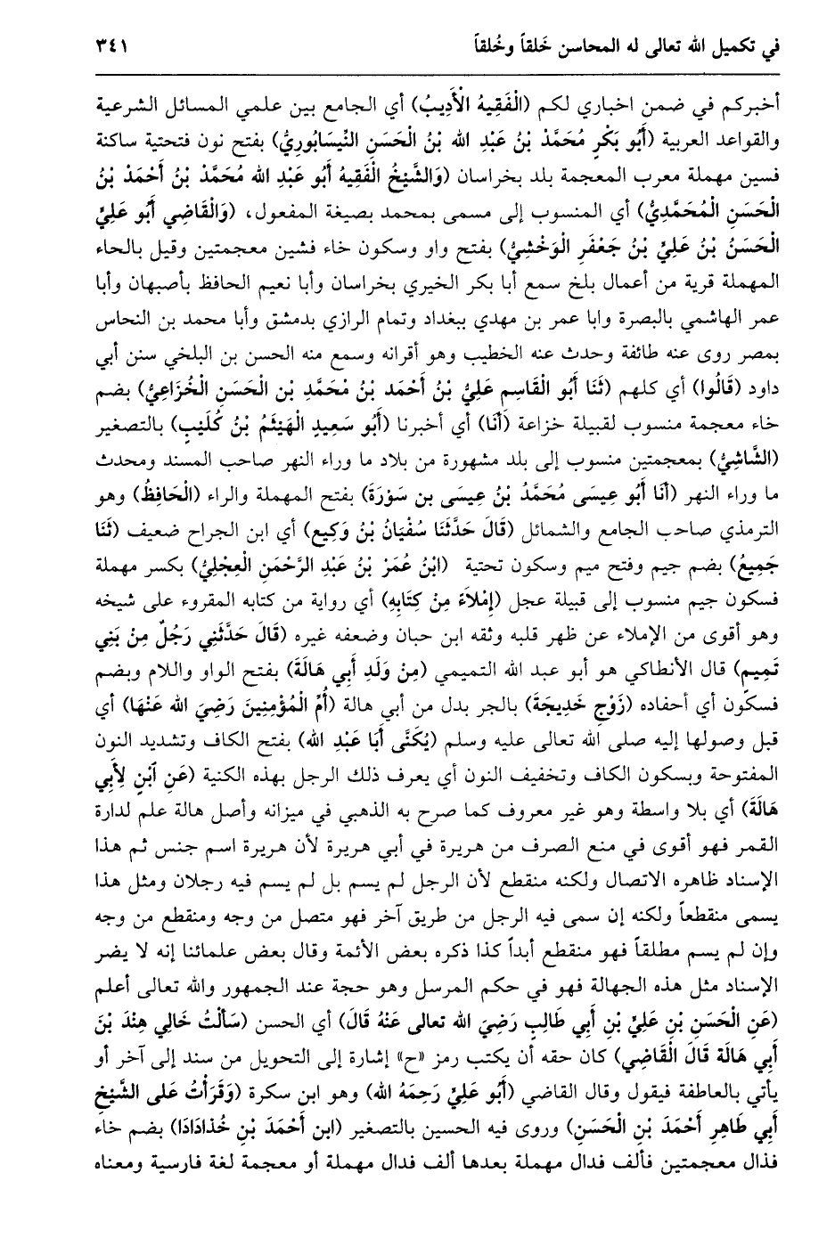 أخبركم في ضمن اخباري لكم (الفقيه الأديب) أي الجامع بين علمي المسائل الشرعية والقواعد العربية (أَبُو بَكْرٍ مُحَمَّدُ بْنُ عَبْدِ اللَّهِ بْنِ الحسن النّيسابوريّ) بفتح نون فتحتية ساكنة فسين مهملة معرب المعجمة بلد بخراسان (وَالشَّيْخُ الْفَقِيهُ أَبُو عَبْدِ اللَّهِ مُحَمَّدُ بْنُ أحمد بن الحسن المحمّديّ) أي المنسوب إلى مسمى بمحمد بصيغة المفعول، (وَالْقَاضِي أَبُو عَلِيٍّ الْحَسَنُ بْنُ عَلِيِّ بْنِ جعفر الوخشيّ) بفتح واو وسكون خاء فشين معجمتين وقيل بالحاء المهملة قرية من أعمال بلخ سمع أبا بكر الخيري بخراسان وأبا نعيم الحافظ بأصبهان وأبا عمر الهاشمي بالبصرة وابا عمر بن مهدي ببغداد وتمام الرازي بدمشق وأبا محمد بن النحاس بمصر روى عنه طائفة وحدث عنه الخطيب وهو أقرانه وسمع منه الحسن بن البلخي سنن أبي داود (قالوا) أي كلهم (ثنا أَبُو الْقَاسِمِ عَلِيُّ بْنُ أَحْمَدَ بْنِ مُحَمَّدِ بن الحسن الخزاعيّ) بضم خاء معجمة منسوب لقبيلة خزاعة (أنا) أي أخبرنا (أبو سعيد الهيثم بن كليب) بالتصغير (الشّاشيّ) بمعجمتين منسوب إلى بلد مشهورة من بلاد ما وراء النهر صاحب المسند ومحدث ما وراء النهر (أنا أبو عيسى محمّد بن عيسى بن سورة) بفتح المهملة والراء (الحافظ) وهو الترمذي صاحب الجامع والشمائل (قال حدّثنا سفيان بن وكيع) أي ابن الجراح ضعيف (ثنا جميع) بضم جيم وفتح ميم وسكون تحتية (ابن عمر بن عبد الرّحمن العجليّ) بكسر مهملة فسكون جيم منسوب إلى قبيلة عجل (إملاء من كتابه) أي رواية من كتابه المقروء على شيخه وهو أقوى من الإملاء عن ظهر قلبه وثقه ابن حبان وضعفه غيره (قال حدّثني رجل من بني تميم) قال الأنطاكي هو أبو عبد الله التميمي (من ولد أبي هالة) بفتح الواو واللام وبضم فسكون أي أحفاده (زوج خديجة) بالجر بدل من أبي هالة (أمّ المؤمنين رضي الله عنها) أي قبل وصولها إليه صلى الله تعالى عليه وسلم (يكنّى أبا عبد الله) بفتح الكاف وتشديد النون المفتوحة وبسكون الكاف وتخفيف النون أي يعرف ذلك الرجل بهذه الكنية (عن ابن لأبي هالة) أي بلا واسطة وهو غير معروف كما صرح به الذهبي في ميزانه وأصل هالة علم لدارة القمر فهو أقوى في منع الصرف من هريرة في أبي هريرة لأن هريرة اسم جنس ثم هذا الإسناد ظاهره الاتصال ولكنه منقطع لأن الرجل لم يسم بل لم يسم فيه رجلان ومثل هذا يسمى منقطعا ولكنه إن سمى فيه الرجل من طريق آخر فهو متصل من وجه ومنقطع من وجه وإن لم يسم مطلقا فهو منقطع أبدا كذا ذكره بعض الأئمة وقال بعض علمائنا إنه لا يضر الإسناد مثل هذه الجهالة فهو في حكم المرسل وهو حجة عند الجمهور والله تعالى أعلم (عَنِ الْحَسَنِ بْنِ عَلِيِّ بْنِ أَبِي طَالِبٍ رضي الله تعالى عنه قال) أي الحسن (سَأَلْتُ خَالِيَ هِنْدَ بْنَ أَبِي هَالَةَ قَالَ القاضي) كان حقه أن يكتب رمز «ح» إشارة إلى التحويل من سند إلى آخر أو يأتي بالعاطفة فيقول وقال القاضي (أبو عليّ رحمه الله) وهو ابن سكرة (وَقَرَأْتُ عَلَى الشَّيْخِ أَبِي طَاهِرٍ أَحْمَدَ بْنِ الحسن) وروى فيه الحسين بالتصغير (ابن أحمد بن خذادادا) بضم خاء فذال معجمتين فألف فدال مهملة بعدها ألف فدال مهملة أو معجمة لغة فارسية ومعناه