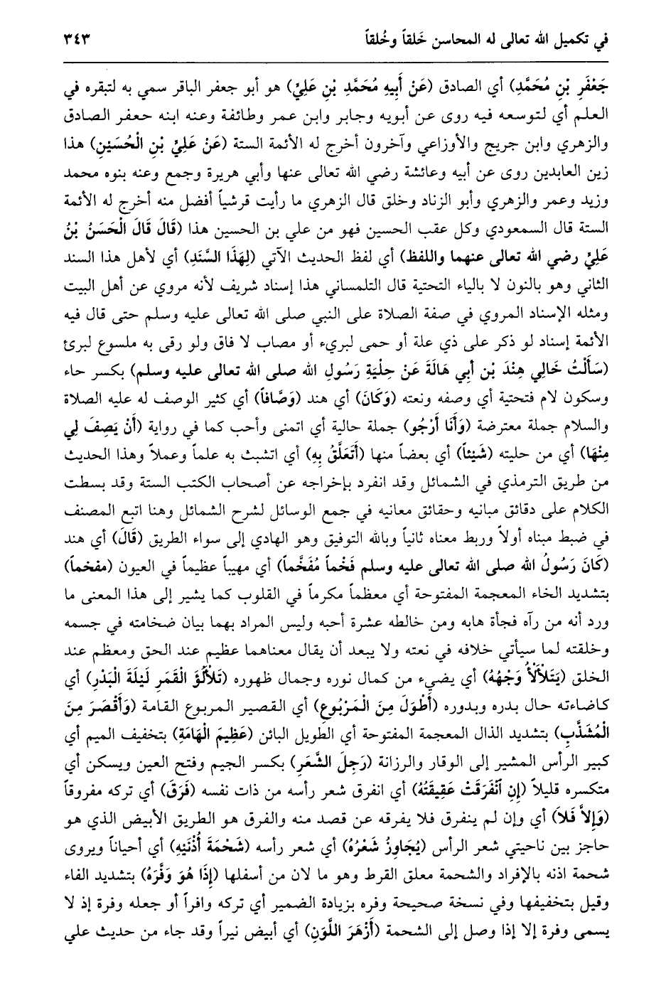 جعفر بن محمّد) أي الصادق (عن أبيه محمّد بن عليّ) هو أبو جعفر الباقر سمي به لتبقره في العلم أي لتوسعه فيه روى عن أبويه وجابر وابن عمر وطائفة وعنه ابنه جعفر الصادق والزهري وابن جريج والأوزاعي وآخرون أخرج له الأئمة الستة (عن عليّ بن الحسين) هذا زين العابدين روى عن أبيه وعائشة رضي الله تعالى عنها وأبي هريرة وجمع وعنه بنوه محمد وزيد وعمر والزهري وأبو الزناد وخلق قال الزهري ما رأيت قرشيا أفضل منه أخرج له الأئمة الستة قال المسعودي وكل عقب الحسين فهو من علي بن الحسين هذا (قال قال الحسن بن عليّ رضي الله تعالى عنهما واللفظ) أي لفظ الحديث الآتي (لهذا السّند) أي لأهل هذا السند الثاني وهو بالنون لا بالياء التحتية قال التلمساني هذا إسناد شريف لأنه مروي عن أهل البيت ومثله الإسناد المروي في صفة الصلاة على النبي صلى الله تعالى عليه وسلم حتى قال فيه الأئمة إسناد لو ذكر على ذي علة أو حمى لبريء أو مصاب لا فاق ولو رقى به ملسوع لبرئ (سَأَلْتُ خَالِي هِنْدَ بْنَ أَبِي هَالَةَ عَنْ حلية رسول الله صلى الله تعالى عليه وسلم) بكسر حاء وسكون لام فتحتية أي وصفه ونعته (وكان) أي هند (وصّافا) أي كثير الوصف له عليه الصلاة والسلام جملة معترضة (وأنا أرجو) جملة حالية أي اتمنى وأحب كما في رواية (أن يصف لي منها) أي من حليته (شيئا) أي بعضا منها (أتعلّق به) أي اتشبث به علما وعملا وهذا الحديث من طريق الترمذي في الشمائل وقد انفرد بإخراجه عن أصحاب الكتب الستة وقد بسطت الكلام على دقائق مبانيه وحقائق معانيه في جمع الوسائل لشرح الشمائل وهنا اتبع المصنف في ضبط مبناه أولا وربط معناه ثانيا وبالله التوفيق وهو الهادي إلى سواء الطريق (قال) أي هند (كان رسول الله صلى الله تعالى عليه وسلم فخما مفخّما) أي مهيبا عظيما في العيون (مفخما) بتشديد الخاء المعجمة المفتوحة أي معظما مكرما في القلوب كما يشير إلى هذا المعنى ما ورد أنه من رآه فجأة هابه ومن خالطه عشرة أحبه وليس المراد بهما بيان ضخامته في جسمه وخلقته لما سيأتي خلافه في نعته ولا يبعد أن يقال معناهما عظيم عند الحق ومعظم عند الخلق (يتلألأ وجهه) أي يضيء من كمال نوره وجمال ظهوره (تلألؤ القمر ليلة البدر) أي كاضاءته حال بدره وبدوره (أطول من المربوع) أي القصير المربوع القامة (وأقصر من المشذّب) بتشديد الذال المعجمة المفتوحة أي الطويل البائن (عظيم الهامة) بتخفيف الميم أي كبير الرأس المشير إلى الوقار والرزانة (رجل الشّعر) بكسر الجيم وفتح العين ويسكن أي متكسره قليلا (إن انفرقت عقيقته) أي انفرق شعر رأسه من ذات نفسه (فرق) أي تركه مفروقا (وإلّا فلا) أي وإن لم ينفرق فلا يفرقه عن قصد منه والفرق هو الطريق الأبيض الذي هو حاجز بين ناحيتي شعر الرأس (يجاوز شعره) أي شعر رأسه (شحمة أذنيه) أي أحيانا ويروى شحمة اذنه بالإفراد والشحمة معلق القرط وهو ما لان من أسفلها (إذا هو وفّره) بتشديد الفاء وقيل بتخفيفها وفي نسخة صحيحة وفره بزيادة الضمير أي تركه وافرا أو جعله وفرة إذ لا يسمى وفرة إلا إذا وصل إلى الشحمة (أزهر اللّون) أي أبيض نيرا وقد جاء من حديث علي