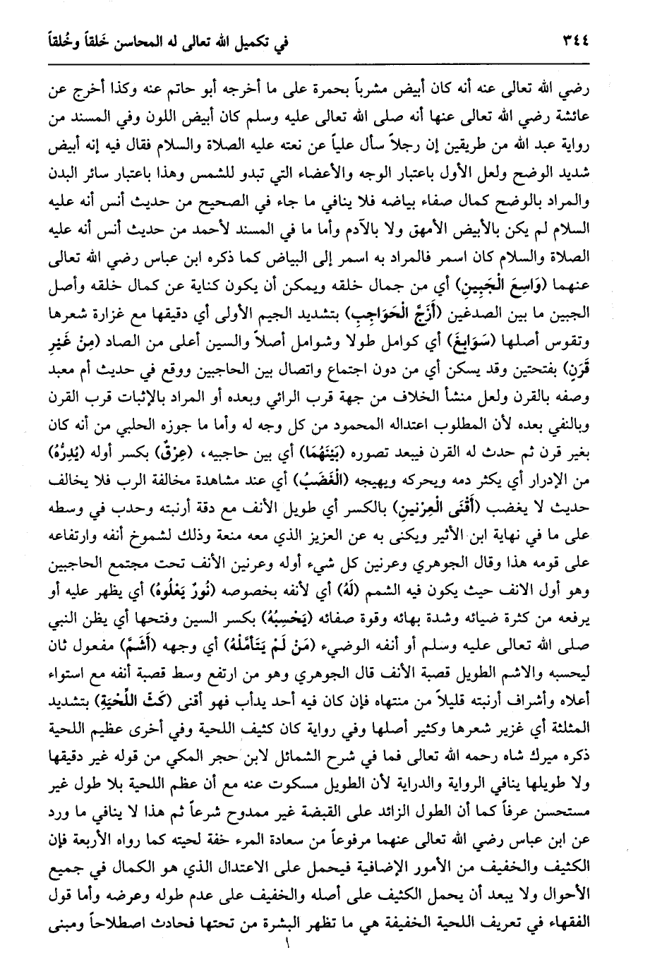 رضي الله تعالى عنه أنه كان أبيض مشربا بحمرة على ما أخرجه أبو حاتم عنه وكذا أخرج عن عائشة رضي الله تعالى عنها أنه صلى الله تعالى عليه وسلم كان أبيض اللون وفي المسند من رواية عبد الله من طريقين إن رجلا سأل عليا عن نعته عليه الصلاة والسلام فقال فيه إنه أبيض شديد الوضح ولعل الأول باعتبار الوجه والأعضاء التي تبدو للشمس وهذا باعتبار سائر البدن والمراد بالوضح كمال صفاء بياضه فلا ينافي ما جاء في الصحيح من حديث أنس أنه عليه السلام لم يكن بالأبيض الأمهق ولا بالآدم وأما ما في المسند لأحمد من حديث أنس أنه عليه الصلاة والسلام كان اسمر فالمراد به اسمر إلى البياض كما ذكره ابن عباس رضي الله تعالى عنهما (واسع الجبين) أي من جمال خلقه ويمكن أن يكون كناية عن كمال خلقه وأصل الجبين ما بين الصدغين (أزجّ الحواجب) بتشديد الجيم الأولى أي دقيقها مع غزارة شعرها وتقوس أصلها (سوابغ) أي كوامل طولا وشوامل أصلا والسين أعلى من الصاد (من غير قرن) بفتحتين وقد يسكن أي من دون اجتماع واتصال بين الحاجبين وَوَقَعَ فِي حَدِيثِ أُمِّ مَعْبَدٍ وَصْفُهُ بِالْقَرْنِ ولعل منشأ الخلاف من جهة قرب الرائي وبعده أو المراد بالإثبات قرب القرن وبالنفي بعده لأن المطلوب اعتداله المحمود من كل وجه له وأما ما جوزه الحلبي من أنه كان بغير قرن ثم حدث له القرن فيبعد تصوره (بينهما) أي بين حاجبيه، (عرق) بكسر أوله (يدرّه) من الإدرار أي يكثر دمه ويحركه ويهيجه (الغضب) أي عند مشاهدة مخالفة الرب فلا يخالف حديث لا يغضب (أقنى العرنين) بالكسر أي طويل الأنف مع دقة أرنبته وحدب في وسطه على ما في نهاية ابن الأثير ويكنى به عن العزيز الذي معه منعة وذلك لشموخ أنفه وارتفاعه على قومه هذا وقال الجوهري وعرنين كل شيء أوله وعرنين الأنف تحت مجتمع الحاجبين وهو أول الانف حيث يكون فيه الشمم (له) أي لأنفه بخصوصه (نور يعلوه) أي يظهر عليه أو يرفعه من كثرة ضيائه وشدة بهائه وقوة صفائه (يحسبه) بكسر السين وفتحها أي يظن النبي صلى الله تعالى عليه وسلم أو أنفه الوضيء (من لم يتأمّله) أي وجهه (أشمّ) مفعول ثان ليحسبه والاشم الطويل قصبة الأنف قال الجوهري وهو من ارتفع وسط قصبة أنفه مع استواء أعلاه وأشراف أرنبته قليلا من منتهاه فإن كان فيه أحد يدأب فهو أقنى (كثّ اللّحية) بتشديد المثلثة أي غزير شعرها وكثير أصلها وفي رواية كان كثيف اللحية وفي أخرى عظيم اللحية ذكره ميرك شاه رحمه الله تعالى فما في شرح الشمائل لابن حجر المكي من قوله غير دقيقها ولا طويلها ينافي الرواية والدراية لأن الطويل مسكوت عنه مع أن عظم اللحية بلا طول غير مستحسن عرفا كما أن الطول الزائد على القبضة غير ممدوح شرعا ثم هذا لا ينافي ما ورد عن ابن عباس رضي الله تعالى عنهما مرفوعا من سعادة المرء خفة لحيته كما رواه الأربعة فإن الكثيف والخفيف من الأمور الإضافية فيحمل على الاعتدال الذي هو الكمال في جميع الأحوال ولا يبعد أن يحمل الكثيف على أصله والخفيف على عدم طوله وعرضه وأما قول الفقهاء في تعريف اللحية الخفيفة هي ما تظهر البشرة من تحتها فحادث اصطلاحا ومبنى