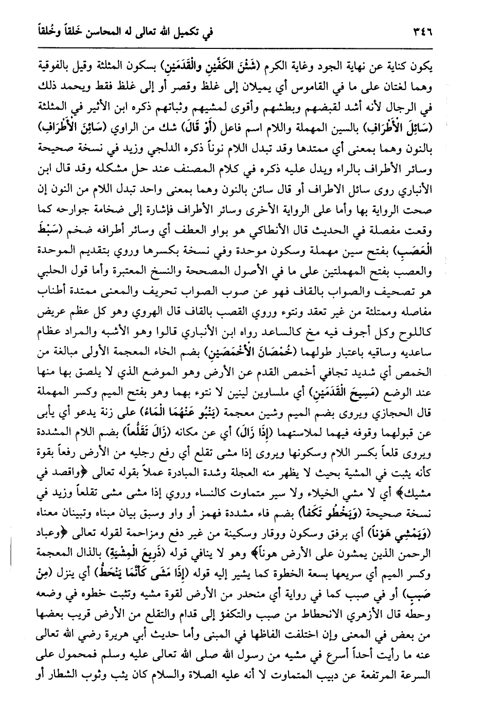 يكون كناية عن نهاية الجود وغاية الكرم (شئن الكفّين والقدمين) بسكون المثلثة وقيل بالفوقية وهما لغتان على ما في القاموس أي يميلان إلى غلظ وقصر أو إلى غلظ فقط ويحمد ذلك في الرجال لأنه أشد لقبضهم وبطشهم وأقوى لمشيهم وثباتهم ذكره ابن الأثير في المثلثة (سائل الأطراف) بالسين المهملة واللام اسم فاعل (أو قال) شك من الراوي (سائن الأطراف) بالنون وهما بمعنى أي ممتدها وقد تبدل اللام نونا ذكره الدلجي وزيد في نسخة صحيحة وسائر الأطراف بالراء ويدل عليه ذكره في كلام المصنف عند حل مشكله وقد قال ابن الأنباري روى سائل الاطراف أو قال سائن بالنون وهما بمعنى واحد تُبْدَلُ اللَّامُ مِنَ النُّونِ إِنْ صَحَّتِ الرِّوَايَةُ بِهَا وَأَمَّا عَلَى الرِّوَايَةِ الْأُخْرَى وَسَائِرُ الْأَطْرَافِ فإشارة إلى ضخامة جوارحه كما وقعت مفصلة في الحديث قال الأنطاكي هو بواو العطف أي وسائر أطرافه ضخم (سبط العصب) بفتح سين مهملة وسكون موحدة وفي نسخة بكسرها وروي بتقديم الموحدة والعصب بفتح المهملتين على ما في الأصول المصححة والنسخ المعتبرة وأما قول الحلبي هو تصحيف والصواب بالقاف فهو عن صوب الصواب تحريف والمعنى ممتدة أطناب مفاصله وممتلئة من غير تعقد ونتوء وروي القصب بالقاف قال الهروي وهو كل عظم عريض كاللوح وكل أجوف فيه مخ كالساعد رواه ابن الأنباري قالوا وهو الأشبه والمراد عظام ساعديه وساقيه باعتبار طولهما (خمصان الأخمصين) بضم الخاء المعجمة الأولى مبالغة من الخمص أي شديد تجافي أخمص القدم عن الأرض وهو الموضع الذي لا يلصق بها منها عند الوضع (مسيح القدمين) أي ملساوين لينين لا نتوء بهما وهو بفتح الميم وكسر المهملة قال الحجازي ويروى بضم الميم وشين معجمة (ينبو عنهما الماء) على زنة يدعو أي يأبى عن قبولهما وقوفه فيهما لملاستهما (إذا زال) أي عن مكانه (زال تقلّعا) بضم اللام المشددة ويروى قلعا بكسر اللام وسكونها ويروى إذا مشى تقلع أي رفع رجليه من الأرض رفعا بقوة كأنه يثبت في المشية بحيث لا يظهر منه العجلة وشدة المبادرة عملا بقوله تعالى وَاقْصِدْ فِي مَشْيِكَ أي لا مشي الخيلاء ولا سير متماوت كالنساء وروي إذا مشى مشى تقلعا وزيد في نسخة صحيحة (ويخطو تكفأ) بضم فاء مشددة فهمز أو واو وسبق بيان مبناه وتبينان معناه (ويمشي هونا) أي برفق وسكون ووقار وسكينة من غير دفع ومزاحمة لقوله تعالى وَعِبادُ الرَّحْمنِ الَّذِينَ يَمْشُونَ عَلَى الْأَرْضِ هَوْناً وهو لا ينافي قوله (ذريع المشية) بالذال المعجمة وكسر الميم أي سريعها بسعة الخطوة كما يشير إليه قوله (إذا مشى كأنّما ينحطّ) أي ينزل (من صبب) أو في صبب كما في رواية أي منحدر من الأرض لقوة مشيه وتثبت خطوه في وضعه وحطه قال الأزهري الانحطاط من صبب والتكفؤ إلى قدام والتقلع من الأرض قريب بعضها من بعض في المعنى وإن اختلفت الفاظها في المبنى وأما حديث أبي هريرة رضي الله تعالى عنه ما رأيت أحدا أسرع في مشيه من رسول الله صلى الله تعالى عليه وسلم فمحمول على السرعة المرتفعة عن دبيب المتماوت لا أنه عليه الصلاة والسلام كان يثب وثوب الشطار أو