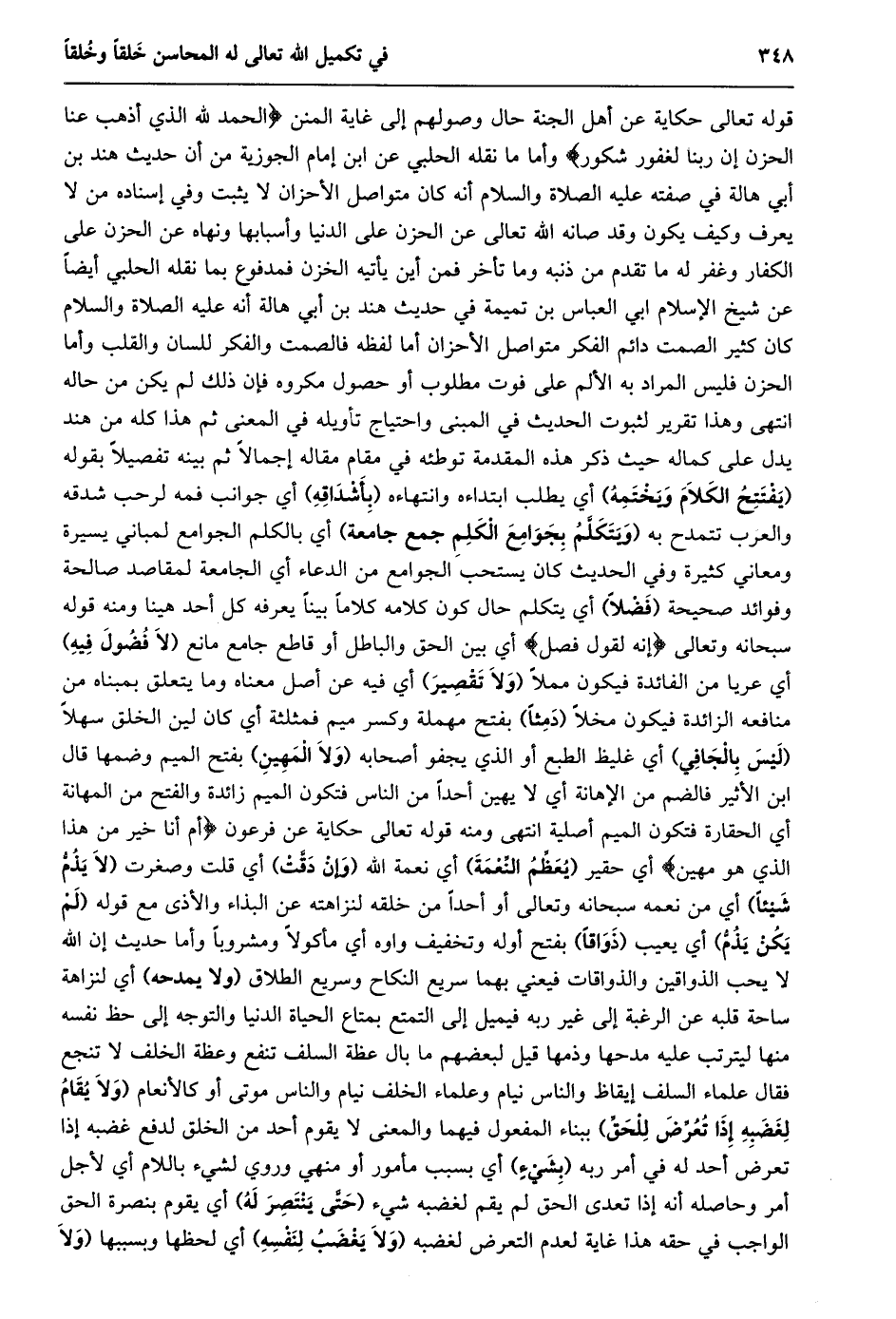 قوله تعالى حكاية عن أهل الجنة حال وصولهم إلى غاية المنن الْحَمْدُ لِلَّهِ الَّذِي أَذْهَبَ عَنَّا الْحَزَنَ إِنَّ رَبَّنا لَغَفُورٌ شَكُورٌ وأما ما نقله الحلبي عن ابن إمام الجوزية من أن حديث هند بن أبي هالة في صفته عليه الصلاة والسلام أنه كان متواصل الأحزان لا يثبت وفي إسناده من لا يعرف وكيف يكون وقد صانه الله تعالى عن الحزن على الدنيا وأسبابها ونهاه عن الحزن على الكفار وغفر لَهُ مَا تَقَدَّمَ مِنْ ذَنْبِهِ وَمَا تَأَخَّرَ فمن أين يأتيه الخزن فمدفوع بما نقله الحلبي أيضا عن شيخ الإسلام ابي العباس بن تميمة في حديث هند بن أبي هالة أنه عليه الصلاة والسلام كان كثير الصمت دائم الفكر متواصل الأحزان أما لفظه فالصمت والفكر للسان والقلب وأما الحزن فليس المراد به الألم على فوت مطلوب أو حصول مكروه فإن ذلك لم يكن من حاله انتهى وهذا تقرير لثبوت الحديث في المبنى واحتياج تأويله في المعنى ثم هذا كله من هند يدل على كماله حيث ذكر هذه المقدمة توطئه في مقام مقاله إجمالا ثم بينه تفصيلا بقوله (يفتتح الكلام ويختمه) أي يطلب ابتداءه وانتهاءه (بأشداقه) أي جوانب فمه لرحب شدقه والعرب تتمدح به (ويتكلّم بجوامع الكلم جمع جامعة) أي بالكلم الجوامع لمباني يسيرة ومعاني كثيرة وفي الحديث كان يستحب الجوامع من الدعاء أي الجامعة لمقاصد صالحة وفوائد صحيحة (فضلا) أي يتكلم حال كون كلامه كلاما بينا يعرفه كل أحد هينا ومنه قوله سبحانه وتعالى إِنَّهُ لَقَوْلٌ فَصْلٌ أي بين الحق والباطل أو قاطع جامع مانع (لا فضول فيه) أي عريا من الفائدة فيكون مملا (ولا تقصير) أي فيه عن أصل معناه وما يتعلق بمبناه من منافعه الزائدة فيكون مخلا (دمثا) بفتح مهملة وكسر ميم فمثلثة أي كان لين الخلق سهلا (ليس بالجافي) أي غليظ الطبع أو الذي يجفو أصحابه (ولا المهين) بفتح الميم وضمها قال ابن الأثير فالضم من الإهانة أي لا يهين أحدا من الناس فتكون الميم زائدة والفتح من المهانة أي الحقارة فتكون الميم أصلية انتهى ومنه قوله تعالى حكاية عن فرعون أَمْ أَنَا خَيْرٌ مِنْ هذَا الَّذِي هُوَ مَهِينٌ أي حقير (يعظّم النّعمة) أي نعمة الله (وإن دقّت) أي قلت وصغرت (لا يذمّ شيئا) أي من نعمه سبحانه وتعالى أو أحدا من خلقه لنزاهته عن البذاء والأذى مع قوله (لم يكن يذمّ) أي يعيب (ذواقا) بفتح أوله وتخفيف واوه أي مأكولا ومشروبا وأما حديث إن الله لا يحب الذواقين والذواقات فيعني بهما سريع النكاح وسريع الطلاق (ولا يمدحه) أي لنزاهة ساحة قلبه عن الرغبة إلى غير ربه فيميل إلى التمتع بمتاع الحياة الدنيا والتوجه إلى حظ نفسه منها ليترتب عليه مدحها وذمها قيل لبعضهم ما بال عظة السلف تنفع وعظة الخلف لا تنجع فقال علماء السلف إيقاظ والناس نيام وعلماء الخلف نيام والناس موتى أو كالأنعام (ولا يقام لغضبه إذا تعرّض للحقّ) ببناء المفعول فيهما والمعنى لا يقوم أحد من الخلق لدفع غضبه إذا تعرض أحد له في أمر ربه (بشيء) أي بسبب مأمور أو منهي وروي لشيء باللام أي لأجل أمر وحاصله أنه إذا تعدى الحق لم يقم لغضبه شيء (حتّى ينتصر له) أي يقوم بنصرة الحق الواجب في حقه هذا غاية لعدم التعرض لغضبه (ولا يغضب لنفسه) أي لحظها وبسببها (ولا
