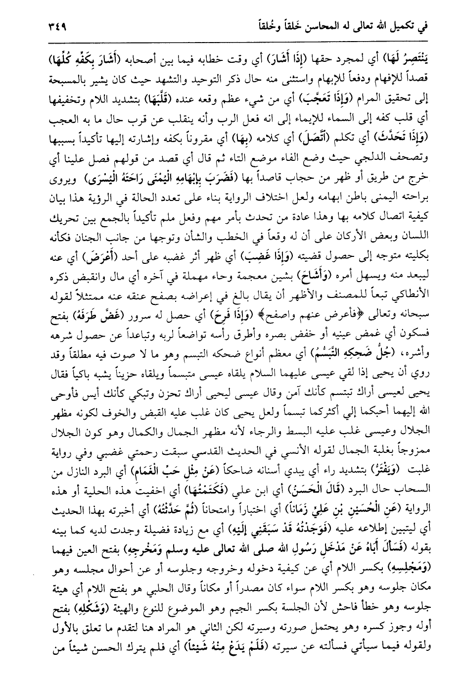 ينتصر لها) أي لمجرد حقها (إذا أشار) أي وقت خطابه فيما بين أصحابه (أشار بكفّه كلّها) قصدا للإفهام ودفعا للإبهام واستثنى منه حال ذكر التوحيد والتشهد حيث كان يشير بالمسبحة إلى تحقيق المرام (وإذا تعجّب) أي من شيء عظم وقعه عنده (قلّبها) بتشديد اللام وتخفيفها أي قلب كفه إلى السماء للإيماء إلى انه فعل الرب وأنه ينقلب عن قرب حال ما به العجب (وإذا تحدّث) أي تكلم (اتّصل) أي كلامه (بها) أي مقرونا بكفه وإشارته إليها تأكيدا بسببها وتصحف الدلجي حيث وضع الفاء موضع التاء ثم قال أي قصد من قولهم فصل علينا أي خرج من طريق أو ظهر من حجاب قاصدا بها (فضرب بإبهامه اليمنى راحته اليسرى) ويروى براحته اليمنى باطن ابهامه ولعل اختلاف الرواية بناء على تعدد الحالة في الرؤية هذا بيان كيفية اتصال كلامه بها وهذا عادة من تحدث بأمر مهم وفعل ملم تأكيدا بالجمع بين تحريك اللسان وبعض الأركان على أن له وقعا في الخطب والشأن وتوجها من جانب الجنان فكأنه بكليته متوجه إلى حصول قضيته (وإذا غضب) أي ظهر أثر غضبه على أحد (أعرض) أي عنه ليبعد منه ويسهل أمره (وأشاح) بشين معجمة وحاء مهملة في آخره أي مال وانقبض ذكره الأنطاكي تبعا للمصنف والأظهر أن يقال بالغ في إعراضه بصفح عنقه عنه ممتثلا لقوله سبحانه وتعالى فَأَعْرِضْ عَنْهُمْ وَاصْفَحْ (وإذا فرح) أي حصل له سرور (غضّ طرفه) بفتح فسكون أي غمض عينيه أو خفض بصره وأطرق رأسه تواضعا لربه وتباعدا عن حصول شرهه وأشره، (جلّ ضحكه التّبسّم) أي معظم أنواع ضحكه التبسم وهو ما لا صوت فيه مطلقا وقد روي أن يحيى إذا لقي عيسى عليهما السلام يلقاه عيسى متبسما ويلقاه حزينا يشبه باكيا فقال يحيى لعيسى أراك تبتسم كأنك آمن وقال عيسى ليحيى أراك تحزن وتبكي كأنك أيس فأوحى الله إليهما أحبكما إلي أكثركما تبسما ولعل يحيى كان غلب عليه القبض والخوف لكونه مظهر الجلال وعيسى غلب عليه البسط والرجاء لأنه مظهر الجمال والكمال وهو كون الجلال ممزوجا بغلبة الجمال لقوله الأنسي في الحديث القدسي سبقت رحمتي غضبي وفي رواية غلبت (ويفترّ) بتشديد راء أي يبدي أسنانه ضاحكا (عن مثل حبّ الغمام) أي البرد النازل من السحاب حال البرد (قال الحسن) أي ابن علي (فكتمتها) أي اخفيت هذه الحلية أو هذه الرواية (عن الحسين بن عليّ زمانا) أي اختبارا وامتحانا (ثمّ حدّثته) أي أخبرته بهذا الحديث أي ليتبين إطلاعه عليه (فوجدته قد سبقني إليه) أي مع زيادة فضيلة وجدت لديه كما بينه بقوله (فَسَأَلَ أَبَاهُ عَنْ مَدْخَلِ رَسُولِ اللَّهِ صَلَّى الله تعالى عليه وسلم ومخرجه) بفتح العين فيهما (ومجلسه) بكسر اللام أي عن كيفية دخوله وخروجه وجلوسه أو عن أحوال مجلسه وهو مكان جلوسه وهو بكسر اللام سواء كان مصدرا أو مكانا وقال الحلبي هو بفتح اللام أي هيئة جلوسه وهو خطأ فاحش لأن الجلسة بكسر الجيم وهو الموضوع للنوع والهيئة (وشكله) بفتح أوله وجوز كسره وهو يحتمل صورته وسيرته لكن الثاني هو المراد هنا لتقدم ما تعلق بالأول ولقوله فيما سيأتي فسألته عن سيرته (فلم يدع منه شيئا) أي فلم يترك الحسن شيئا من