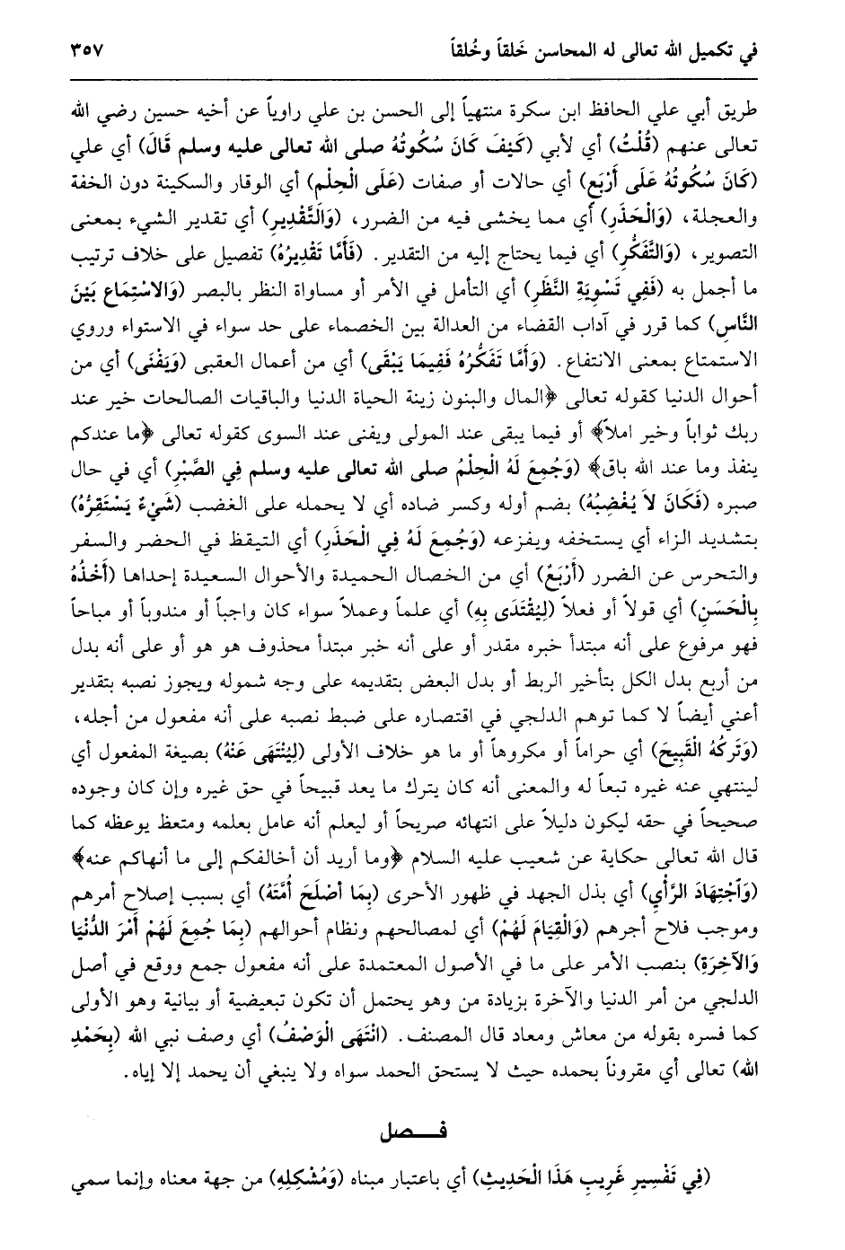 طريق أبي علي الحافظ ابن سكرة منتهيا إلى الحسن بن علي راويا عن أخيه حسين رضي الله تعالى عنهم (قلت) أي لأبي (كيف كان سكوته صلى الله تعالى عليه وسلم قال) أي علي (كان سكوته على أربع) أي حالات أو صفات (على الحلم) أي الوقار والسكينة دون الخفة والعجلة، (والحذر) أي مما يخشى فيه من الضرر، (والتّقدير) أي تقدير الشيء بمعنى التصوير، (والتّفكّر) أي فيما يحتاج إليه من التقدير. (فأمّا تقديره) تفصيل على خلاف ترتيب ما أجمل به (ففي تسوية النّظر) أي التأمل في الأمر أو مساواة النظر بالبصر (والاستماع بين النّاس) كما قرر في آداب القضاء من العدالة بين الخصماء على حد سواء في الاستواء وروي الاستمتاع بمعنى الانتفاع. (وأمّا تفكّره ففيما يبقى) أي من أعمال العقبى (ويفنى) أي من أحوال الدنيا كقوله تعالى الْمالُ وَالْبَنُونَ زِينَةُ الْحَياةِ الدُّنْيا وَالْباقِياتُ الصَّالِحاتُ خَيْرٌ عِنْدَ رَبِّكَ ثَواباً وَخَيْرٌ أَمَلًا أو فيما يبقى عند المولى ويفنى عند السوى كقوله تعالى ما عِنْدَكُمْ يَنْفَدُ وَما عِنْدَ اللَّهِ باقٍ (وجمع له الحلم صلى الله تعالى عليه وسلم في الصّبر) أي في حال صبره (فكان لا يغضبه) بضم أوله وكسر ضاده أي لا يحمله على الغضب (شيء يستقرّه) بتشديد الزاء أي يستخفه ويفزعه (وجمع له في الحذر) أي التيقظ في الحضر والسفر والتحرس عن الضرر (أربع) أي من الخصال الحميدة والأحوال السعيدة إحداها (أخذه بالحسن) أي قولا أو فعلا (ليقتدى به) أي علما وعملا سواء كان واجبا أو مندوبا أو مباحا فهو مرفوع على أنه مبتدأ خبره مقدر أو على أنه خبر مبتدأ محذوف هو هو أو على أنه بدل من أربع بدل الكل بتأخير الربط أو بدل البعض بتقديمه على وجه شموله ويجوز نصبه بتقدير أعني أيضا لا كما توهم الدلجي في اقتصاره على ضبط نصبه على أنه مفعول من أجله، (وتركه القبيح) أي حراما أو مكروها أو ما هو خلاف الأولى (لينتهى عنه) بصيغة المفعول أي لينتهي عنه غيره تبعا له والمعنى أنه كان يترك ما يعد قبيحا في حق غيره وإن كان وجوده صحيحا في حقه ليكون دليلا على انتهائه صريحا أو ليعلم أنه عامل بعلمه ومتعظ يوعظه كما قال الله تعالى حكاية عن شعيب عليه السلام وَما أُرِيدُ أَنْ أُخالِفَكُمْ إِلى مَا أَنْهاكُمْ عَنْهُ (واجتهاد الرّأي) أي بذل الجهد في ظهور الأحرى (بما أصلح أمّته) أي بسبب إصلاح أمرهم وموجب فلاح أجرهم (والقيام لهم) أي لمصالحهم ونظام أحوالهم (بما جمع لهم أمر الدّنيا والآخرة) بنصب الأمر على ما في الأصول المعتمدة على أنه مفعول جمع ووقع في أصل الدلجي من أمر الدنيا والآخرة بزيادة من وهو يحتمل أن تكون تبعيضية أو بيانية وهو الأولى كما فسره بقوله من معاش ومعاد قال المصنف. (انتهى الوصف) أي وصف نبي الله (بحمد الله) تعالى أي مقرونا بحمده حيث لا يستحق الحمد سواه ولا ينبغي أن يحمد إلا إياه.