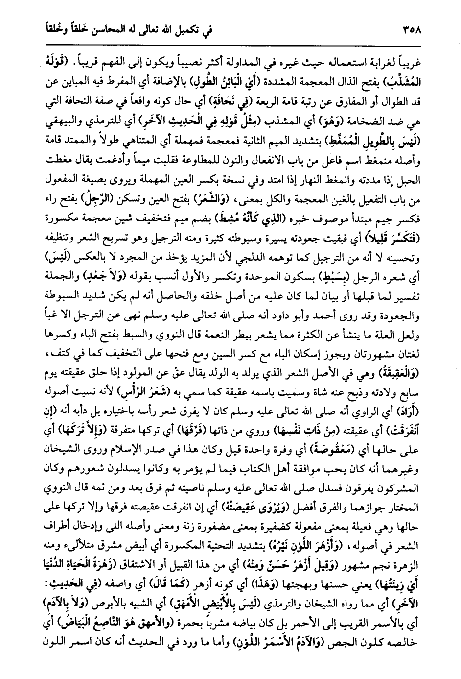 غريبا لغرابة استعماله حيث غيره في المداولة أكثر نصيبا ويكون إلى الفهم قريبا. (قوله المشذّب) بفتح الذال المعجمة المشددة (أي البائن الطّول) بالإضافة أي المفرط فيه المباين عن قد الطوال أو المفارق عن رتبة قامة الربعة (في نحافة) أي حال كونه واقعا في صفة النحافة التي هي ضد الضخامة (وهو) أي المشذب (مثل قوله في الحديث الآخر) أي للترمذي والبيهقي (ليس بالطّويل الممغّط) بتشديد الميم الثانية فمعجمة فمهملة أي المتناهي طولا والممتد قامة وأصله منمغط اسم فاعل من باب الانفعال والنون للمطاوعة فقلبت ميما وأدغمت يقال مغطت الحبل إذا مددته وانمغط النهار إذا امتد وفي نسخة بكسر العين المهملة ويروى بصيغة المفعول من باب التفعيل بالغين المعجمة والكل بمعنى، (والشّعر) بفتح العين وتسكن (الرّجل) بفتح راء فكسر جيم مبتدأ موصوف خبره (الذي كأنّه مشط) بضم ميم فتخفيف شين معجمة مكسورة (فتكسّر قليلا) أي فبقيت جعودته يسيرة وسبوطته كثيرة ومنه الترجيل وهو تسريح الشعر وتنظيفه وتحسينه لا أنه من الترجيل كما توهمه الدلجي لأن المزيد يؤخذ من المجرد لا بالعكس (ليس) أي شعره الرجل (بسبط) بسكون الموحدة وتكسر والأول أنسب بقوله (ولا جعد) والجملة تفسير لما قبلها أؤ بيان لما كان عليه من أصل خلقه والحاصل أنه لم يكن شديد السبوطة والجعودة وقد روى أحمد وأبو داود أنه صلى الله تعالى عليه وسلم نهى عن الترجل الا غبا ولعل العلة ما ينشأ عن الكثرة مما يشعر ببطر النعمة قال النووي والسبط بفتح الباء وكسرها لغتان مشهورتان ويجوز إسكان الباء مع كسر السين ومع فتحها على التخفيف كما في كتف، (والعقيقة) وهي في الأصل الشعر الذي يولد به الولد يقال عقّ عن المولود إذا حلق عقيقته يوم سابع ولادته وذبح عنه شاة وسميت باسمه عقيقة كما سمي به (شعر الرّأس) لأنه نسيت أصوله (أراد) أي الراوي أنه صلى الله تعالى عليه وسلم كان لا يفرق شعر رأسه باختياره بل دأبه أنه (إن انفرقت) أي عقيقته (من ذات نفسها) وروي من ذاتها (فرّقها) أي تركها متفرقة (وإلّا تركها) أي على حالها أي (معقوصة) أي وفرة واحدة قيل وكان هذا في صدر الإسلام وروى الشيخان وغيرهما أنه كان يحب موافقة أهل الكتاب فيما لم يؤمر به وكانوا يسدلون شعورهم وكان المشركون يفرقون فسدل صلى الله تعالى عليه وسلم ناصيته ثم فرق بعد ومن ثمه قال النووي المختار جوازهما والفرق أفضل (ويروى عقيصته) أي إن انفرقت عقيصته فرقها وإلا تركها على حالها وهي فعيلة بمعنى مفعولة كضفيرة بمعنى مضفورة زنة ومعنى وأصله اللى وإدخال أطراف الشعر في أصوله، (وأزهر اللّون نيّره) بتشديد التحتية المكسورة أي أبيض مشرق متلألىء ومنه الزهرة نجم مشهور (وقيل أزهر حسن ومنه) أي من هذا القبيل أو الاشتقاق (زهرة الحياة الدّنيا أي زينتها) يعني حسنها وبهجتها (وهذا) أي كونه أزهر (كما قال) أي واصفه (في الحديث: