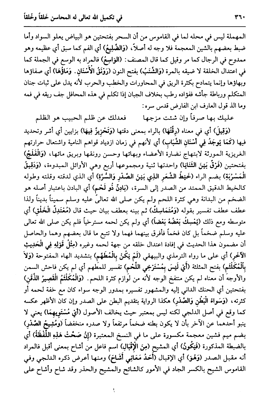 المهملة ليس في محله لما في القاموس من أن السحر بفتحتين هو البياض يعلو السواد وأما ضبط بعضهم بالشين المعجمة فلا وجه له أصلا، (والضّليع) أي الفم كما سبق أي عظيمه وهو ممدوح في الرجال كما مر وقيل كما قال المصنف: (الواسع) فالمراد به الوسع في الجملة كما في اعتدال الخلقة لا ضيقه بالمرة (والشّنب) بفتح النون (رونق الأسنان. وماؤها) أي صفاؤها وبهاؤها وإنما يتمادح بكثرة الريق في المحاورات والخطب والحرب لأنه يدل على ثبات جنان المتكلم ورباطة جأشه ففؤاده رطب بخلاف الجبان إذا تكلم في هذه المحافل جف ريقه في فمه وما الذ قول العارف ابن الفارض قدس سره: