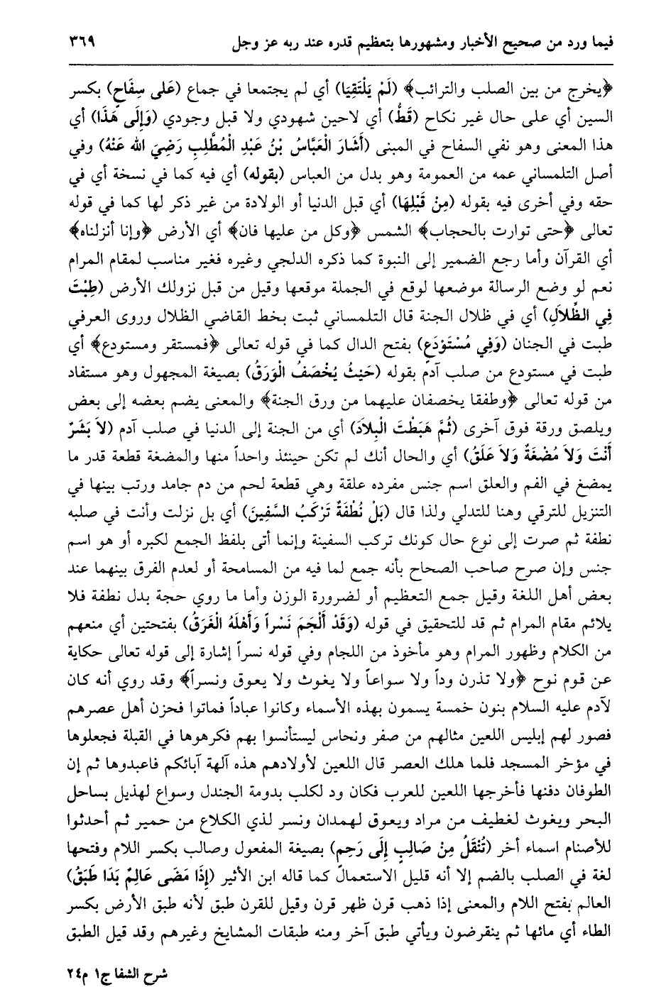 يَخْرُجُ مِنْ بَيْنِ الصُّلْبِ وَالتَّرائِبِ (لم يلتقيا) أي لم يجتمعا في جماع (على سفاح) بكسر السين أي على حال غير نكاح (قطّ) أي لاحين شهودي ولا قبل وجودي (وإلى هذا) أي هذا المعنى وهو نفي السفاح في المبنى (أَشَارَ الْعَبَّاسُ بْنُ عَبْدِ الْمُطَّلِبِ رَضِيَ اللَّهُ عنه) وفي أصل التلمساني عمه من العمومة وهو بدل من العباس (بقوله) أي فيه كما في نسخة أي في حقه وفي أخرى فيه بقوله (من قبلها) أي قبل الدنيا أو الولادة من غير ذكر لها كما في قوله تعالى حَتَّى تَوارَتْ بِالْحِجابِ الشمس كُلُّ مَنْ عَلَيْها فانٍ أي الأرض إِنَّا أَنْزَلْناهُ أي القرآن وأما رجع الضمير إلى النبوة كما ذكره الدلجي وغيره فغير مناسب لمقام المرام نعم لو وضع الرسالة موضعها لوقع في الجملة موقعها وقيل من قبل نزولك الأرض (طبت في الظّلال) أي في ظلال الجنة قال التلمساني ثبت بخط القاضي الظلال وروى العرفي طبت في الجنان (وفي مستودع) بفتح الدال كما في قوله تعالى فَمُسْتَقَرٌّ وَمُسْتَوْدَعٌ أي طبت في مستودع من صلب آدم بقوله (حيث يخصف الورق) بصيغة المجهول وهو مستفاد من قوله تعالى وَطَفِقا يَخْصِفانِ عَلَيْهِما مِنْ وَرَقِ الْجَنَّةِ والمعنى يضم بعضه إلى بعض ويلصق ورقة فوق آخرى (ثمّ هبطت البلاد) أي من الجنة إلى الدنيا في صلب آدم (لَا بَشَرٌ أَنْتَ وَلَا مُضْغَةٌ وَلَا عَلَقُ) أي والحال أنك لم تكن حينئذ واحدا منها والمضغة قطعة قدر ما يمضغ في الفم والعلق اسم جنس مفرده علقة وهي قطعة لحم من دم جامد ورتب بينها في التنزيل للترقي وهنا للتدلي ولذا قال (بل نطفة تركب السّفين) أي بل نزلت وأنت في صلبه نطفة ثم صرت إلى نوع حال كونك تركب السفينة وإنما أتى بلفظ الجمع لكبره أو هو اسم جنس وإن صرح صاحب الصحاح بأنه جمع لما فيه من المسامحة أو لعدم الفرق بينهما عند بعض أهل اللغة وقيل جمع التعظيم أو لضرورة الوزن وأما ما روي حجة بدل نطفة فلا يلائم مقام المرام ثم قد للتحقيق في قوله (وقد ألجم نسرا وأهله الغرق) بفتحتين أي منعهم من الكلام وظهور المرام وهو مأخوذ من اللجام وفي قوله نسرا إشارة إلى قوله تعالى حكاية عن قوم نوح وَلا تَذَرُنَّ وَدًّا وَلا سُواعاً وَلا يَغُوثَ وَيَعُوقَ وَنَسْراً وقد روي أنه كان لآدم عليه السلام بنون خمسة يسمون بهذه الأسماء وكانوا عبادا فماتوا فحزن أهل عصرهم فصور لهم إبليس اللعين مثالهم من صفر ونحاس ليستأنسوا بهم فكرهوها في القبلة فجعلوها في مؤخر المسجد فلما هلك العصر قال اللعين لأولادهم هذه آلهة آبائكم فاعبدوها ثم إن الطوفان دفنها فأخرجها اللعين للعرب فكان ود لكلب بدومة الجندل وسواع لهذيل بساحل البحر ويغوث لغطيف من مراد ويعوق لهمدان ونسر لذي الكلاع من حمير ثم أحدثوا للأصنام اسماء أخر (تنقل من صالب إلى رحم) بصيغة المفعول وصالب بكسر اللام وفتحها لغة في الصلب بالضم إلا أنه قليل الاستعمال كما قاله ابن الأثير (إذا مضى عالم بدا طبق) العالم بفتح اللام والمعنى إذا ذهب قرن ظهر قرن وقيل للقرن طبق لأنه طبق الأرض بكسر الطاء أي مائها ثم ينقرضون ويأتي طبق آخر ومنه طبقات المشايخ وغيرهم وقد قيل الطبق