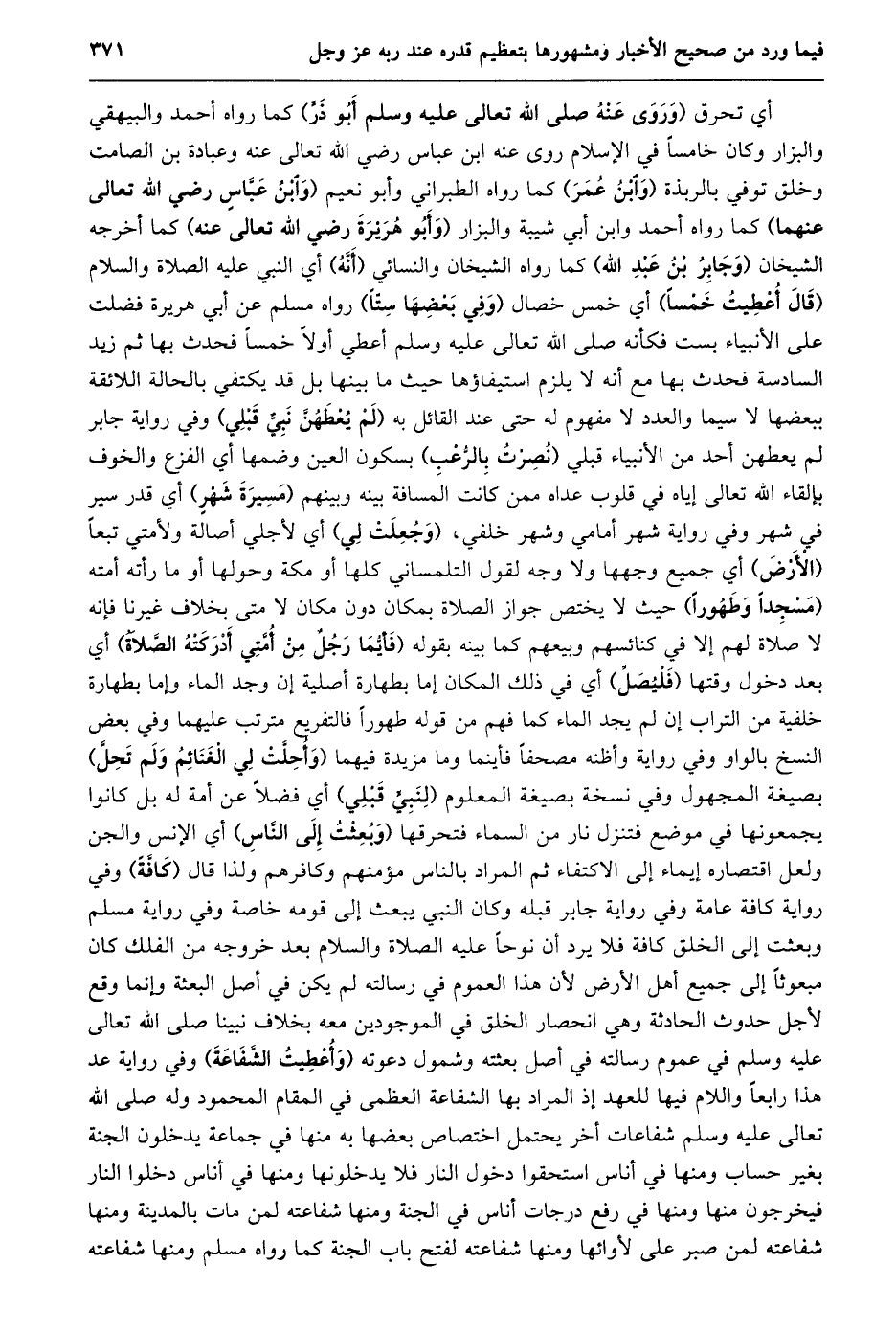 أي تحرق (وروى عنه صلى الله تعالى عليه وسلم أبو ذرّ) كما رواه أحمد والبيهقي والبزار وكان خامسا في الإسلام روى عنه ابن عباس رضي الله تعالى عنه وعبادة بن الصامت وخلق توفي بالربذة (وابن عمر) كما رواه الطبراني وأبو نعيم (وابن عبّاس رضي الله تعالى عنهما) كما رواه أحمد وابن أبي شيبة والبزار (وأبو هريرة رضي الله تعالى عنه) كما أخرجه الشيخان (وجابر بن عبد الله) كما رواه الشيخان والنسائي (أنّه) أي النبي عليه الصلاة والسلام (قال أعطيت خمسا) أي خمس خصال (وفي بعضها ستّا) رواه مسلم عن أبي هريرة فضلت على الأنبياء بست فكأنه صلى الله تعالى عليه وسلم أعطي أولا خمسا فحدث بها ثم زيد السادسة فحدث بها مع أنه لا يلزم استيفاؤها حيث ما بينها بل قد يكتفي بالحالة اللائقة ببعضها لا سيما والعدد لا مفهوم له حتى عند القائل به (لم يعطهنّ نبيّ قبلي) وفي رواية جابر لم يعطهن أحد من الأنبياء قبلي (نصرت بالرّعب) بسكون العين وضمها أي الفزع والخوف بإلقاء الله تعالى إياه في قلوب عداه ممن كانت المسافة بينه وبينهم (مسيرة شهر) أي قدر سير في شهر وفي رواية شهر أمامي وشهر خلفي، (وجعلت لي) أي لأجلي أصالة ولأمتي تبعا (الأرض) أي جميع وجهها ولا وجه لقول التلمساني كلها أو مكة وحولها أو ما رأته أمته (مسجدا وطهورا) حيث لا يختص جواز الصلاة بمكان دون مكان لا متى بخلاف غيرنا فإنه لا صلاة لهم إلا في كنائسهم وبيعهم كما بينه بقوله (فأيّما رجل من أمّتي أدركته الصّلاة) أي بعد دخول وقتها (فليصلّ) أي في ذلك المكان إما بطهارة أصلية إن وجد الماء وإما بطهارة خلفية من التراب إن لم يجد الماء كما فهم من قوله طهورا فالتفريع مترتب عليهما وفي بعض النسخ بالواو وفي رواية وأظنه مصحفا فأينما وما مزيدة فيهما (وأحلّت لي الغنائم ولم تحلّ) بصيغة المجهول وفي نسخة بصيغة المعلوم (لنبيّ قبلي) أي فضلا عن أمة له بل كانوا يجمعونها في موضع فتنزل نار من السماء فتحرقها (وبعثت إلى النّاس) أي الإنس والجن ولعل اقتصاره إيماء إلى الاكتفاء ثم المراد بالناس مؤمنهم وكافرهم ولذا قال (كافّة) وفي رواية كافة عامة وفي رواية جابر قبله وكان النبي يبعث إلى قومه خاصة وفي رواية مسلم وبعثت إلى الخلق كافة فلا يرد أن نوحا عليه الصلاة والسلام بعد خروجه من الفلك كان مبعوثا إلى جميع أهل الأرض لأن هذا العموم في رسالته لم يكن في أصل البعثة وإنما وقع لأجل حدوث الحادثة وهي انحصار الخلق في الموجودين معه بخلاف نبينا صلى الله تعالى عليه وسلم في عموم رسالته في أصل بعثته وشمول دعوته (وأعطيت الشّفاعة) وفي رواية عد هذا رابعا واللام فيها للعهد إذ المراد بها الشفاعة العظمى في المقام المحمود وله صلى الله تعالى عليه وسلم شفاعات أخر يحتمل اختصاص بعضها به منها في جماعة يدخلون الجنة بغير حساب ومنها في أناس استحقوا دخول النار فلا يدخلونها ومنها في أناس دخلوا النار فيخرجون منها ومنها في رفع درجات أناس في الجنة ومنها شفاعته لمن مات بالمدينة ومنها شفاعته لمن صبر على لأوائها ومنها شفاعته لفتح باب الجنة كما رواه مسلم ومنها شفاعته