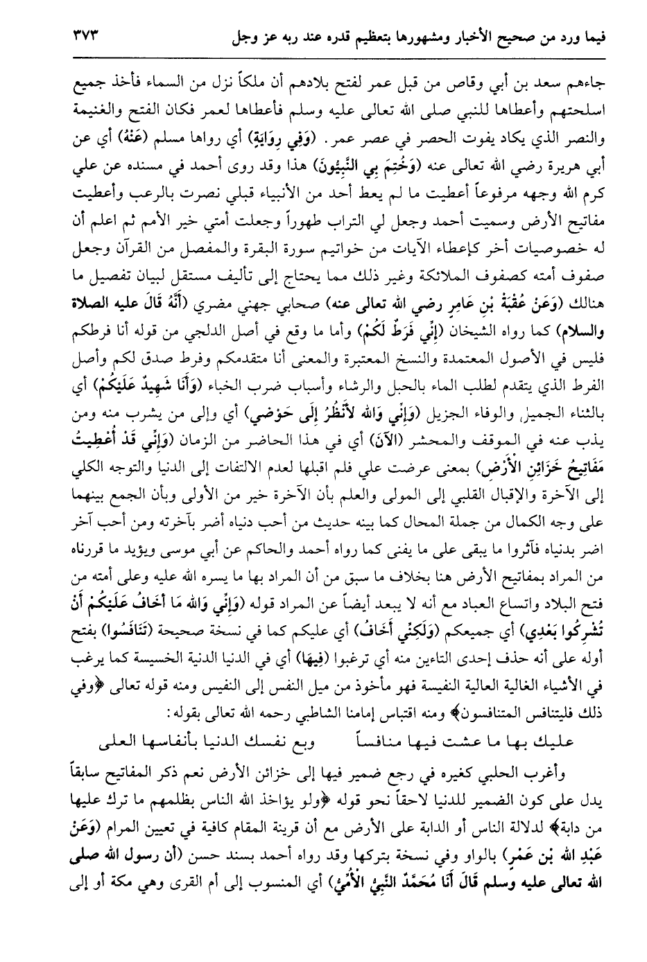جاءهم سعد بن أبي وقاص من قبل عمر لفتح بلادهم أن ملكا نزل من السماء فأخذ جميع اسلحتهم وأعطاها للنبي صلى الله تعالى عليه وسلم فأعطاها لعمر فكان الفتح والغنيمة والنصر الذي يكاد يفوت الحصر في عصر عمر. (وفي رواية) أي رواها مسلم (عنه) أي عن أبي هريرة رضي الله تعالى عنه (وختم بي النّبيّون) هذا وقد روى أحمد في مسنده عن علي كرم الله وجهه مرفوعا أعطيت ما لم يعط أحد من الأنبياء قبلي نصرت بالرعب وأعطيت مفاتيح الأرض وسميت أحمد وجعل لي التراب طهورا وجعلت أمتي خير الأمم ثم اعلم أن له خصوصيات أخر كإعطاء الآيات من خواتيم سورة البقرة والمفصل من القرآن وجعل صفوف أمته كصفوف الملائكة وغير ذلك مما يحتاج إلى تأليف مستقل لبيان تفصيل ما هنالك (وعن عقبة بن عامر رضي الله تعالى عنه) صحابي جهني مضري (أنّه قال عليه الصلاة والسلام) كما رواه الشيخان (إنّي فرط لكم) وأما ما وقع في أصل الدلجي من قوله أنا فرطكم فليس في الأصول المعتمدة والنسخ المعتبرة والمعنى أنا متقدمكم وفرط صدق لكم وأصل الفرط الذي يتقدم لطلب الماء بالحبل والرشاء وأسباب ضرب الخباء (وأنا شهيد عليكم) أي بالثناء الجميل والوفاء الجزيل (وإنّي والله لأنظر إلى حوضي) أي وإلى من يشرب منه ومن يذب عنه في الموقف والمحشر (الآن) أي في هذا الحاضر من الزمان (وإنّي قد أعطيت مفاتيح خزائن الأرض) بمعنى عرضت علي فلم اقبلها لعدم الالتفات إلى الدنيا والتوجه الكلي إلى الآخرة والإقبال القلبي إلى المولى والعلم بأن الآخرة خير من الأولى وبأن الجمع بينهما على وجه الكمال من جملة المحال كما بينه حديث من أحب دنياه أضر بآخرته ومن أحب آخر اضر بدنياه فآثروا ما يبقى على ما يفنى كما رواه أحمد والحاكم عن أبي موسى ويؤيد ما قررناه من المراد بمفاتيح الأرض هنا بخلاف ما سبق من أن المراد بها ما يسره الله عليه وعلى أمته من فتح البلاد واتساع العباد مع أنه لا يبعد أيضا عن المراد قوله (وَإِنِّي وَاللَّهِ مَا أَخَافُ عَلَيْكُمْ أَنْ تُشْرِكُوا بعدي) أي جميعكم (ولكنّي أخاف) أي عليكم كما في نسخة صحيحة (تنافسوا) بفتح أوله على أنه حذف إحدى التاءين منه أي ترغبوا (فيها) أي في الدنيا الدنية الخسيسة كما يرغب في الأشياء الغالية العالية النفيسة فهو مأخوذ من ميل النفس إلى النفيس ومنه قوله تعالى وَفِي ذلِكَ فَلْيَتَنافَسِ الْمُتَنافِسُونَ ومنه اقتباس إمامنا الشاطبي رحمه الله تعالى بقوله: