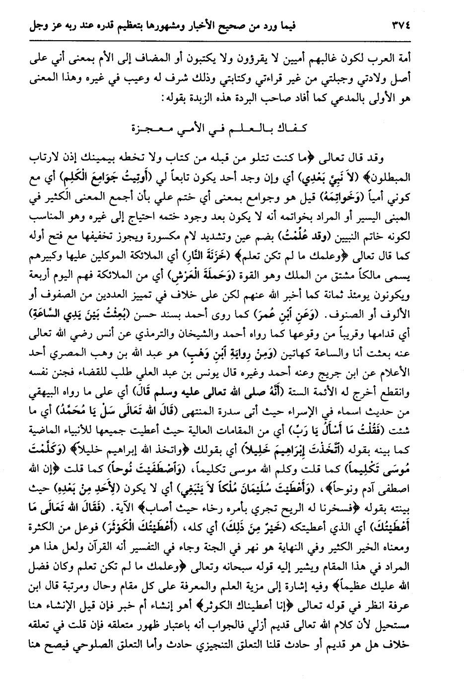 أمة العرب لكون غالبهم أميين لا يقرؤون ولا يكتبون أو المضاف إلى الأم بمعنى أني على أصل ولادتي وجبلتي من غير قراءتي وكتابتي وذلك شرف له وعيب في غيره وهذا المعنى هو الأولى بالمدعي كما أفاد صاحب البردة هذه الزبدة بقوله: