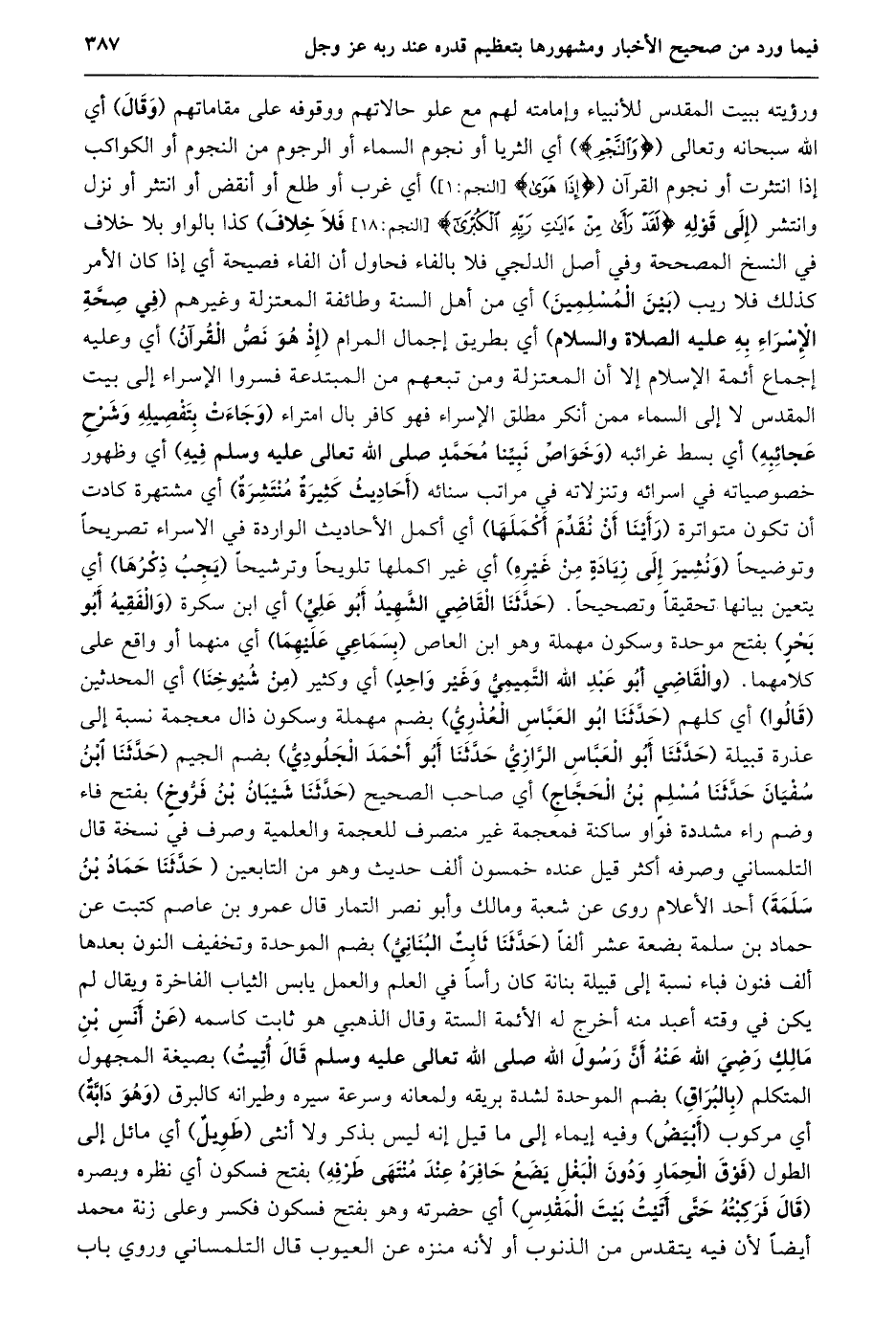ورؤيته ببيت المقدس للأنبياء وإمامته لهم مع علو حالاتهم ووقوفه على مقاماتهم (وقال) أي الله سبحانه وتعالى (وَالنَّجْمِ) أي الثريا أو نجوم السماء أو الرجوم من النجوم أو الكواكب إذا انتثرت أو نجوم القرآن (إِذا هَوى [النجم: 1] ) أي غرب أو طلع أو أنقض أو انتثر أو نزل وانتشر (إِلَى قَوْلِهِ لَقَدْ رَأى مِنْ آياتِ رَبِّهِ الْكُبْرى [النجم: 18] فلا خلاف) كذا بالواو بلا خلاف في النسخ المصححة وفي أصل الدلجي فلا بالفاء فحاول أن الفاء فصيحة أي إذا كان الأمر كذلك فلا ريب (بين المسلمين) أي من أهل السنة وطائفة المعتزلة وغيرهم (في صحّة الإسراء به عليه الصلاة والسلام) أي بطريق إجمال المرام (إذ هو نصّ القرآن) أي وعليه إجماع أئمة الإسلام إلا أن المعتزلة ومن تبعهم من المبتدعة فسروا الإسراء إلى بيت المقدس لا إلى السماء ممن أنكر مطلق الإسراء فهو كافر بال امتراء (وجاءت بتفصيله وشرح عجائبه) أي بسط غرائبه (وخواصّ نبيّنا محمّد صلى الله تعالى عليه وسلم فيه) أي وظهور خصوصياته في اسرائه وتنزلاته في مراتب سنائه (أحاديث كثيرة منتشرة) أي مشتهرة كادت أن تكون متواترة (رأينا أن نقدّم أكملها) أي أكمل الأحاديث الواردة في الاسراء تصريحا وتوضيحا (ونشير إلى زيادة من غيره) أي غير اكملها تلويحا وترشيحا (يجب ذكرها) أي يتعين بيانها تحقيقا وتصحيحا. (حدّثنا القاضي الشّهيد أبو عليّ) أي ابن سكرة (والفقيه أبو بحر) بفتح موحدة وسكون مهملة وهو ابن العاص (بسماعي عليهما) أي منهما أو واقع على كلامهما. (وَالْقَاضِي أَبُو عَبْدِ اللَّهِ التَّمِيمِيُّ وَغَيْرُ وَاحِدٍ) أي وكثير (من شيوخنا) أي المحدثين (قالوا) أي كلهم (حدّثنا أبو العبّاس العذريّ) بضم مهملة وسكون ذال معجمة نسبة إلى عذرة قبيلة (حَدَّثَنَا أَبُو الْعَبَّاسِ الرَّازِيُّ حَدَّثَنَا أَبُو أَحْمَدَ الجلوديّ) بضم الجيم (حَدَّثَنَا ابْنُ سُفْيَانَ حَدَّثَنَا مُسْلِمُ بْنُ الْحَجَّاجِ) أي صاحب الصحيح (حدّثنا شيبان بن فرّوخ) بفتح فاء وضم راء مشددة فواو ساكنة فمعجمة غير منصرف للعجمة والعلمية وصرف في نسخة قال التلمساني وصرفه أكثر قيل عنده خمسون ألف حديث وهو من التابعين (حدّثنا حماد بن سلمة) أحد الأعلام روى عن شعبة ومالك وأبو نصر التمار قال عمرو بن عاصم كتبت عن حماد بن سلمة بضعة عشر ألفا (حدّثنا ثابت البنانيّ) بضم الموحدة وتخفيف النون بعدها ألف فنون فباء نسبة إلى قبيلة بنانة كان رأسا في العلم والعمل يابس الثياب الفاخرة ويقال لم يكن في وقته أعبد منه أخرج له الأئمة الستة وقال الذهبي هو ثابت كاسمه (عَنْ أَنَسِ بْنِ مَالِكٍ رَضِيَ اللَّهُ عَنْهُ أنّ رسول الله صلى الله تعالى عليه وسلم قال أتيت) بصيغة المجهول المتكلم (بالبراق) بضم الموحدة لشدة بريقه ولمعانه وسرعة سيره وطيرانه كالبرق (وهو دابّة) أي مركوب (أبيض) وفيه إيماء إلى ما قيل إنه ليس بذكر ولا أنثى (طويل) أي مائل إلى الطول (فَوْقَ الْحِمَارِ وَدُونَ الْبَغْلِ يَضَعُ حَافِرَهُ عِنْدَ منتهى طرفه) بفتح فسكون أي نظره وبصره (قال فركبته حتّى أتيت بيت المقدس) أي حضرته وهو بفتح فسكون فكسر وعلى زنة محمد أيضا لأن فيه يتقدس من الذنوب أو لأنه منزه عن العيوب قال التلمساني وروي باب