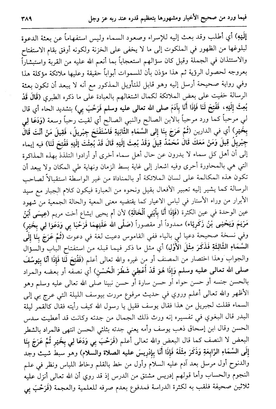 إليه) أي أطلب وقد بعث إليه للإسراء وصعود السماء وليس استفهاما عن بعثة الدعوة لبلوغها من الظهور في الملكوت إلى ما لا يخفى على الخزنة ولكونه أوفق بقام الاستفتاح والاستئذان في الجملة وقيل كان سؤالهم استعجابا بما أنعم الله عليه من القربة واستبشارا بعروجه لحصول الرؤية ثم هذا مؤذن بأن للسموات أبوابا حقيقة وعليها ملائكة مؤكلة هذا وفي رواية صحيحة أرسل إليه وهو قابل للتأويل المذكور مع أنه لا يبعد أن تكون بعثة الرسالة خفيت على بعض الملائكة لكمال اشتغالهم بالعبادة على ما ذكره الطبري (قَالَ قَدْ بُعِثَ إِلَيْهِ، فَفُتِحَ لَنَا فَإِذَا أنا بآدم صلى الله تعالى عليه وسلم فرحّب بي) بتشديد الحاء أي قال لي مرحبا كما ورد مرحبا بالابن الصالح والنبي الصالح أي لقيت رحبا وسعة (ودعا لي بخير) أي في الدارين (ثُمَّ عُرِجَ بِنَا إِلَى السَّمَاءِ الثَّانِيَةِ فَاسْتَفْتَحَ جِبْرِيلُ، فَقِيلَ مَنْ أَنْتَ قَالَ جِبْرِيلُ قِيلَ وَمَنْ مَعَكَ قَالَ مُحَمَّدٌ قِيلَ وَقَدْ بُعِثَ إليه قال قد بعثت إليه ففتح لنا) فيه إيماء إلى أن أهل كل سماء لا يدرون عن حال أهل سماء أخرى أو أرادوا التلذذ بهذه المذاكرة التي هي بالمحاورة أحرى وفيه اشعار إلى غاية بسط الزمان ونهاية طي المكان ولا يبعد أن تكون هذه المكالمة على لسان الملائكة أو بالمناداة من غير الواسطة استقبالا لصاحب الرسالة كما يشير إليه تعبير الأفعال بقيل ونحوه من العبارة فيكون كلام الجبار مع سيد الأبرار من وراء الأستار في لباس الاعيار كما يقتضيه معنى المعية والحالة الجمعية من شهود عين الوحدة في عين الكثرة (فإذا أنا بابني الخالة) لأن أم يحيى ايشاع أخت مريم (عيسى ابن مريم ويحيى بن زكريّاء) ممدودا أو مقصورا (صَلَّى اللَّهُ عَلَيْهِمَا فَرَحَّبَا بِي وَدَعَوَا لِي بخير) وفي نسخة صحيحة دعيا لي بالياء ففي القاموس دعيت لغة في دعوت (ثُمَّ عُرِجَ بِنَا إِلَى السَّمَاءِ الثَّالِثَةِ فَذَكَرَ مثل الأوّل) أي مثل ما ذكر فيما قبله من استفتاح الباب والسؤال والجواب وهذا اختصار من المصنف أو من غيره والله تعالى أعلم (فَفُتِحَ لَنَا فَإِذَا أَنَا بِيُوسُفَ صَلَّى اللَّهُ تعالى عَلَيْهِ وَسَلَّمَ وَإِذَا هُوَ قَدْ أُعْطِيَ شَطْرَ الحسن) أي نصفه أو بعضه والمراد بالحسن جنسه أو حسن حواء أو حسن سارة أو حسن نبينا صلى الله تعالى عليه وسلم وهو الأظهر والله تعالى أعلم وروي في حديث مرفوع مررت بيوسف الليلة التي عرج بي إلى السماء فقلت لجبريل من هذا فقال يوسف فقيل يا رسول الله كيف رأيته فقال كالقمر ليلة البدر قال البغوي في تفسيره إنه ورث ذلك الجمال من جدته وكانت قد أعطيت سدس الحسن وقال ابن إسحاق ذهب يوسف وأمه يعني جدته بثلثي الحسن انتهى فالمراد بالشطر البعض لا النصف كما قال البعض والله تعالى أعلم (فَرَحَّبَ بِي وَدَعَا لِي بِخَيْرٍ ثُمَّ عُرِجَ بِنَا إِلَى السَّمَاءِ الرَّابِعَةِ وَذَكَرَ مِثْلَهُ فَإِذَا أنا بإدريس عليه الصلاة والسلام) وهو سبط شيث وجد والدنوح أول مرسل بعد آدم عليه السلام وأول من خط بالقلم وخاط اللباس ونظر في علم النجوم والحساب وأما قولهم إدريس مشتق من الدرس إذ قد روي أن الله تعالى أنزل عليه ثلاثين صحيفة فلقب به لكثرة الدراسة فمدفوع بعدم صرفه للعلمية والعجمة (فرحّب بي