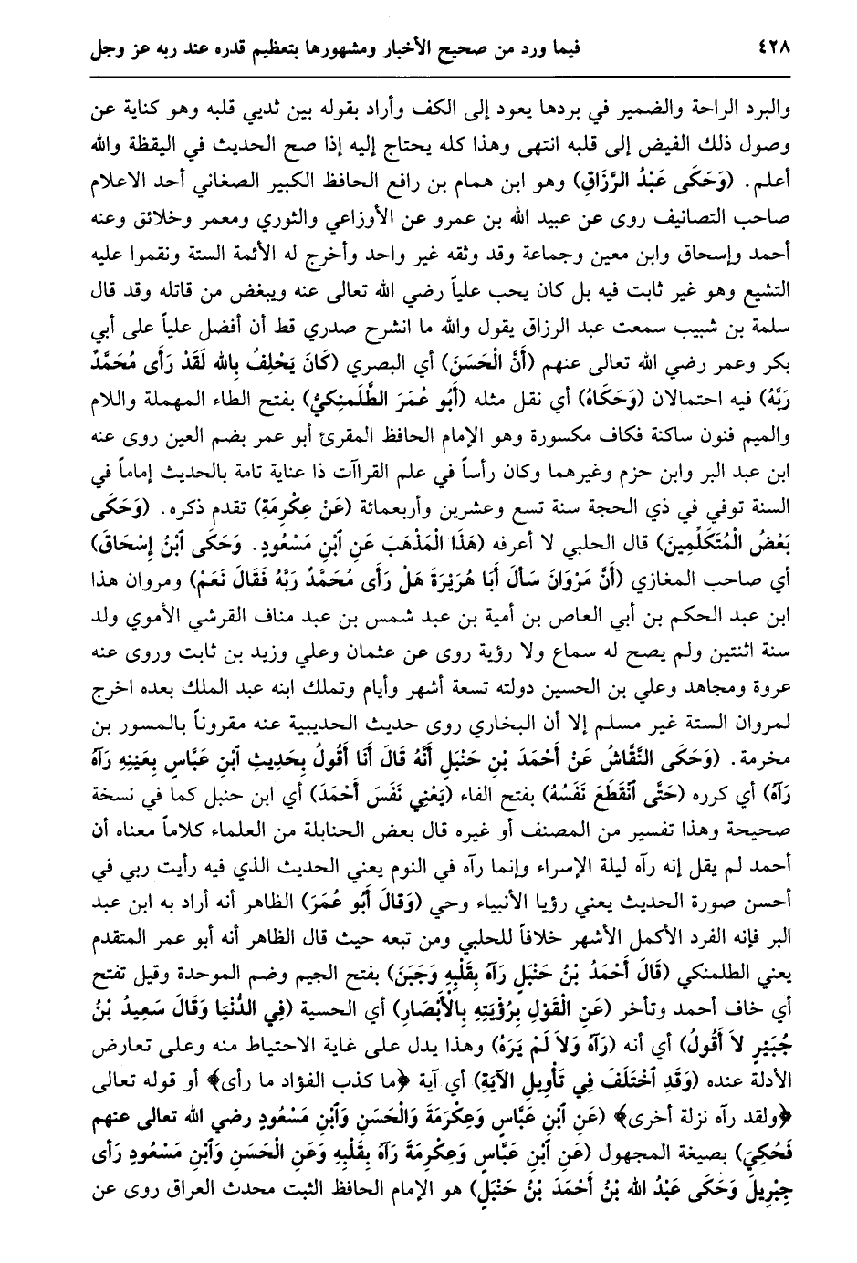 والبرد الراحة والضمير في بردها يعود إلى الكف وأراد بقوله بين ثديي قلبه وهو كناية عن وصول ذلك الفيض إلى قلبه انتهى وهذا كله يحتاج إليه إذا صح الحديث في اليقظة والله أعلم. (وحكى عبد الرّزاق) وهو ابن همام بن رافع الحافظ الكبير الصغاني أحد الاعلام صاحب التصانيف روى عن عبيد الله بن عمرو عن الأوزاعي والثوري ومعمر وخلائق وعنه أحمد وإسحاق وابن معين وجماعة وقد وثقه غير واحد وأخرج له الأئمة الستة ونقموا عليه التشيع وهو غير ثابت فيه بل كان يحب عليا رضي الله تعالى عنه ويبغض من قاتله وقد قال سلمة بن شبيب سمعت عبد الرزاق يقول والله ما انشرح صدري قط أن أفضل عليا على أبي بكر وعمر رضي الله تعالى عنهم (أنّ الحسن) أي البصري (كَانَ يَحْلِفُ بِاللَّهِ لَقَدْ رَأَى مُحَمَّدٌ رَبَّهُ) فيه احتمالان (وحكاه) أي نقل مثله (أبو عمر الطّلمنكيّ) بفتح الطاء المهملة واللام والميم فنون ساكنة فكاف مكسورة وهو الإمام الحافظ المقرئ أبو عمر بضم العين روى عنه ابن عبد البر وابن حزم وغيرهما وكان رأسا في علم القراآت ذا عناية تامة بالحديث إماما في السنة توفي في ذي الحجة سنة تسع وعشرين وأربعمائة (عن عكرمة) تقدم ذكره. (وحكى بعض المتكلّمين) قال الحلبي لا أعرفه (هَذَا الْمَذْهَبَ عَنِ ابْنِ مَسْعُودٍ. وَحَكَى ابْنُ إسحاق) أي صاحب المغازي (أَنَّ مَرْوَانَ سَأَلَ أَبَا هُرَيْرَةَ هَلْ رَأَى محمّد ربّه فقال نعم) ومروان هذا ابن عبد الحكم بن أبي العاص بن أمية بن عبد شمس بن عبد مناف القرشي الأموي ولد سنة اثنتين ولم يصح له سماع ولا رؤية روى عن عثمان وعلي وزيد بن ثابت وروى عنه عروة ومجاهد وعلي بن الحسين دولته تسعة أشهر وأيام وتملك ابنه عبد الملك بعده اخرج لمروان الستة غير مسلم إلا أن البخاري روى حديث الحديبية عنه مقرونا بالمسور بن مخرمة. (وَحَكَى النَّقَّاشُ عَنْ أَحْمَدَ بْنِ حَنْبَلٍ أَنَّهُ قَالَ أَنَا أَقُولُ بِحَدِيثِ ابْنِ عَبَّاسٍ بِعَيْنِهِ رآه رآه) أي كرره (حتّى انقطع نفسه) بفتح الفاء (يعني نفس أحمد) أي ابن حنبل كما في نسخة صحيحة وهذا تفسير من المصنف أو غيره قال بعض الحنابلة من العلماء كلاما معناه أن أحمد لم يقل إنه رآه ليلة الإسراء وإنما رآه في النوم يعني الحديث الذي فيه رأيت ربي في أحسن صورة الحديث يعني رؤيا الأنبياء وحي (وقال أبو عمر) الظاهر أنه أراد به ابن عبد البر فإنه الفرد الأكمل الأشهر خلافا للحلبي ومن تبعه حيث قال الظاهر أنه أبو عمر المتقدم يعني الطلمنكي (قَالَ أَحْمَدُ بْنُ حَنْبَلٍ رَآهُ بِقَلْبِهِ وَجَبُنَ) بفتح الجيم وضم الموحدة وقيل تفتح أي خاف أحمد وتأخر (عن القول برؤيته بالأبصار) أي الحسية (في الدّنيا وقال سعيد بن جبير لا أقول) أي أنه (رآه ولا لم يره) وهذا يدل على غاية الاحتياط منه وعلى تعارض الأدلة عنده (وقد اختلف في تأويل الآية) أي آية ما كَذَبَ الْفُؤادُ ما رَأى أو قوله تعالى وَلَقَدْ رَآهُ نَزْلَةً أُخْرى (عَنِ ابْنِ عَبَّاسٍ وَعِكْرِمَةَ وَالْحَسَنِ وَابْنِ مَسْعُودٍ رضي الله تعالى عنهم فحكي) بصيغة المجهول (عَنِ ابْنِ عَبَّاسٍ وَعِكْرِمَةَ رَآهُ بِقَلْبِهِ وَعَنِ الْحَسَنِ وَابْنِ مَسْعُودٍ رَأَى جِبْرِيلَ وَحَكَى عَبْدُ الله بن أحمد بن حنبل) هو الإمام الحافظ الثبت محدث العراق روى عن