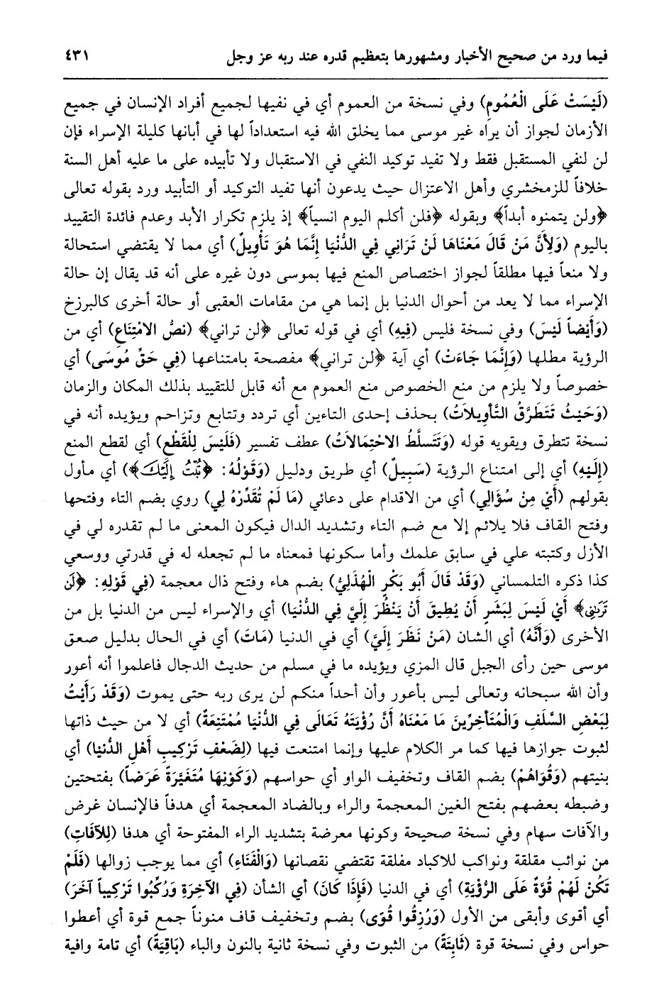 (ليست على العموم) وفي نسخة من العموم أي في نفيها لجميع أفراد الإنسان في جميع الأزمان لجواز أن يراه غير موسى مما يخلق الله فيه استعدادا لها في أبانها كليلة الإسراء فإن لن لنفي المستقبل فقط ولا تفيد توكيد النفي في الاستقبال ولا تأبيده على ما عليه أهل السنة خلافا للزمخشري وأهل الاعتزال حيث يدعون أنها تفيد التوكيد أو التأبيد ورد بقوله تعالى وَلَنْ يَتَمَنَّوْهُ أَبَداً وبقوله فَلَنْ أُكَلِّمَ الْيَوْمَ إِنْسِيًّا إذ يلزم تكرار الأبد وعدم فائدة التقييد باليوم (وَلِأَنَّ مَنْ قَالَ مَعْنَاهَا لَنْ تَرَانِي فِي الدّنيا إنّما هو تأويل) أي مما لا يقتضي استحالة ولا منعا فيها مطلقا لجواز اختصاص المنع فيها بموسى دون غيره على أنه قد يقال إن حالة الإسراء مما لا يعد من أحوال الدنيا بل إنما هي من مقامات العقبى أو حالة أخرى كالبرزخ (وأيضا ليس) وفي نسخة فليس (فيه) أي في قوله تعالى لَنْ تَرانِي (نصّ الامتناع) أي من الرؤية مطلها (وإنّما جاءت) أي آية لَنْ تَرانِي مفصحة بامتناعها (في حقّ موسى) أي خصوصا ولا يلزم من منع الخصوص منع العموم مع أنه قابل للتقييد بذلك المكان والزمان (وحيث تتطرّق التّأويلات) بحذف إحدى التاءين أي تردد وتتابع وتزاحم ويؤيده أنه في نسخة تتطرق ويقويه قوله (وتتسلّط الاحتمالات) عطف تفسير (فليس للقطع) أي لقطع المنع (إليه) أي إلى امتناع الرؤية (سبيل) أي طريق ودليل (وقوله: تُبْتُ إِلَيْكَ) أي مأول بقولهم (أي من سؤالي) أي من الاقدام على دعائي (ما لم تقدّره لي) روي بضم التاء وفتحها وفتح القاف فلا يلائم إلا مع ضم التاء وتشديد الدال فيكون المعنى ما لم تقدره لي في الأزل وكتبته علي في سابق علمك وأما سكونها فمعناه ما لم تجعله له في قدرتي ووسعي كذا ذكره التلمساني (وقد قال أبو بكر الهذليّ) بضم هاء وفتح ذال معجمة (فِي قَوْلِهِ: لَنْ تَرانِي أَيْ لَيْسَ لِبَشَرٍ أَنْ يُطِيقَ أَنْ يَنْظُرَ إِلَيَّ فِي الدُّنْيَا) أي والإسراء ليس من الدنيا بل من الأخرى (وأنّه) أي الشان (من نظر إليّ) أي في الدنيا (مات) أي في الحال بدليل صعق موسى حين رأى الجبل قال المزي ويؤيده ما في مسلم من حديث الدجال فاعلموا أنه أعور وأن الله سبحانه وتعالى ليس بأعور وأن أحدا منكم لن يرى ربه حتى يموت (وَقَدْ رَأَيْتُ لِبَعْضِ السَّلَفِ وَالْمُتَأَخِّرِينَ مَا مَعْنَاهُ أنّ رؤيته تعالى في الدّنيا ممتنعة) أي لا من حيث ذاتها لثبوت جوازها فيها كما مر الكلام عليها وإنما امتنعت فيها (لضعف تركيب أهل الدّنيا) أي بنيتهم (وقواهم) بضم القاف وتخفيف الواو أي حواسهم (وكونها متغيّرة عرضا) بفتحتين وضبطه بعضهم بفتح الغين المعجمة والراء وبالضاد المعجمة أي هدفا فالإنسان غرض والآفات سهام وفي نسخة صحيحة وكونها معرضة بتشديد الراء المفتوحة أي هدفا (للآفات) من نوائب مقلقة ونواكب للاكباد مفلقة تقتضي نقصانها (والفناء) أي مما يوجب زوالها (فلم تكن لهم قوّة على الرّؤية) أي في الدنيا (فإذا كان) أي الشأن (في الآخرة وركّبوا تركيبا آخر) أي أقوى وأبقى من الأول (ورزقوا قوى) بضم وتخفيف قاف منونا جمع قوة أي أعطوا حواس وفي نسخة قوة (ثابتة) من الثبوت وفي نسخة ثانية بالنون والباء (باقية) أي تامة وافية