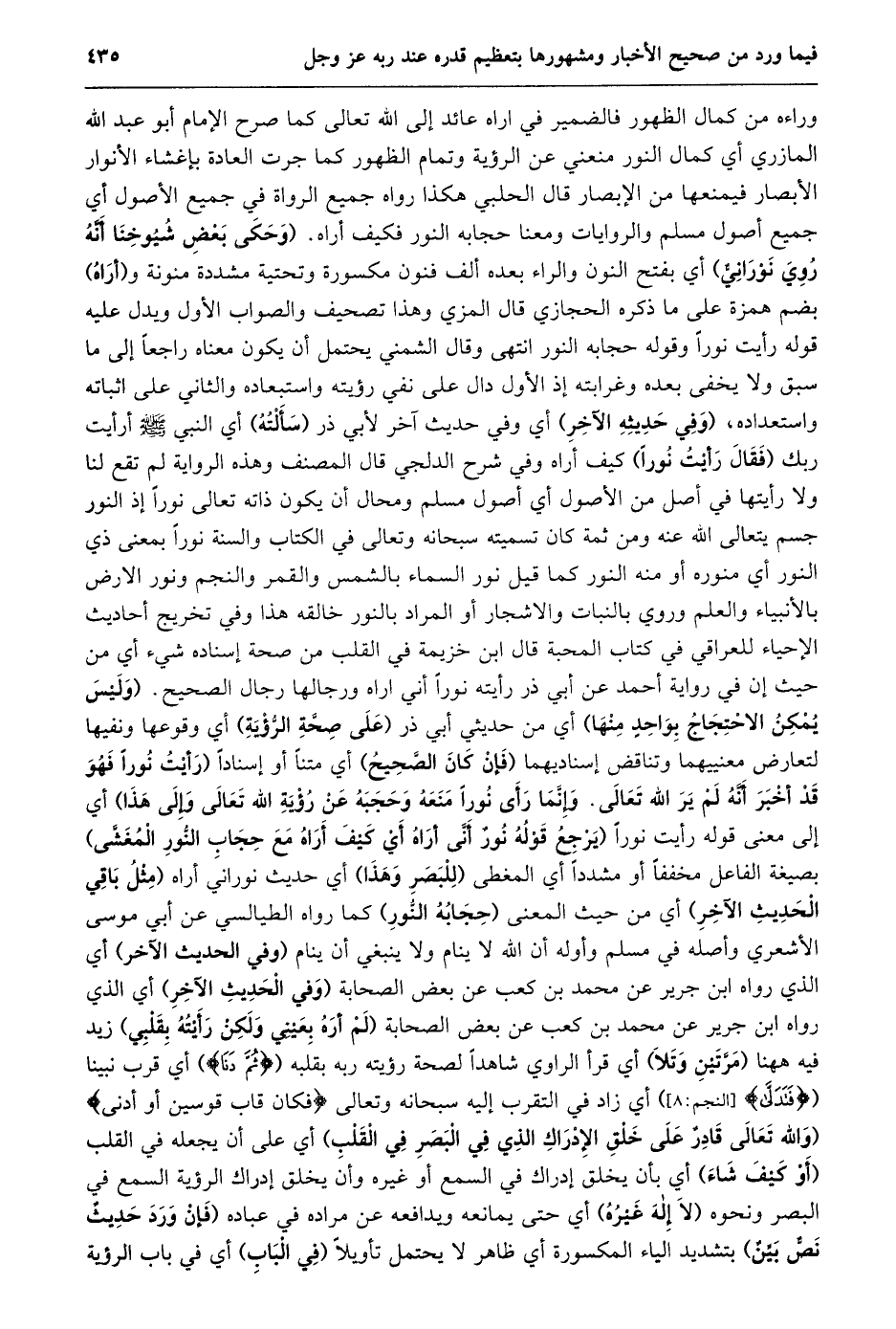 وراءه من كمال الظهور فالضمير في اراه عائد إلى الله تعالى كما صرح الإمام أبو عبد الله المازري أي كمال النور منعني عن الرؤية وتمام الظهور كما جرت العادة بإغشاء الأنوار الأبصار فيمنعها من الإبصار قال الحلبي هكذا رواه جميع الرواة في جميع الأصول أي جميع أصول مسلم والروايات ومعنا حجابه النور فكيف أَرَاهُ. (وَحَكَى بَعْضُ شُيُوخِنَا أَنَّهُ رُوِيَ نُورَانِيٌّ) أي بفتح النون والراء بعده ألف فنون مكسورة وتحتية مشددة منونة و (أراه) بضم همزة على ما ذكره الحجازي قال المزي وهذا تصحيف والصواب الأول ويدل عليه قوله رأيت نورا وقوله حجابه النور انتهى وقال الشمني يحتمل أن يكون معناه راجعا إلى ما سبق ولا يخفى بعده وغرابته إذ الأول دال على نفي رؤيته واستبعاده والثاني على اثباته واستعداده، (وفي حديثه الآخر) أي وفي حديث آخر لأبي ذر (سألته) أي النبي صلى الله عليه وسلّم أرأيت ربك (فقال رأيت نورا) كيف أراه وفي شرح الدلجي قال المصنف وهذه الرواية لم تقع لنا ولا رأيتها في أصل من الأصول أي أصول مسلم ومحال أن يكون ذاته تعالى نورا إذ النور جسم يتعالى الله عنه ومن ثمة كان تسميته سبحانه وتعالى في الكتاب والسنة نورا بمعنى ذي النور أي منوره أو منه النور كما قيل نور السماء بالشمس والقمر والنجم ونور الارض بالأنبياء والعلم وروي بالنبات والاشجار أو المراد بالنور خالقه هذا وفي تخريج أحاديث الإحياء للعراقي في كتاب المحبة قال ابن خزيمة في القلب من صحة إسناده شيء أي من حيث إن في رواية أحمد عن أبي ذر رأيته نورا أني اراه ورجالها رجال الصحيح. (وليس يمكن الاحتجاج بواحد منها) أي من حديثي أبي ذر (على صحّة الرّؤية) أي وقوعها ونفيها لتعارض معنييهما وتناقض إسناديهما (فإن كان الصّحيح) أي متنا أو إسنادا (رَأَيْتُ نُورًا فَهُوَ قَدْ أَخْبَرَ أَنَّهُ لَمْ ير الله تعالى. وَإِنَّمَا رَأَى نُورًا مَنَعَهُ وَحَجَبَهُ عَنْ رُؤْيَةِ الله تعالى وإلى هذا) أي إلى معنى قوله رأيت نورا (يرجع قوله نور أنّى أَرَاهُ أَيْ كَيْفَ أَرَاهُ مَعَ حِجَابِ النُّورِ المغشّى) بصيغة الفاعل مخففا أو مشددا أي المغطى (للبصر وهذا) أي حديث نوراني أراه (مثل باقي الحديث الآخر) أي من حيث المعنى (حجابه النّور) كما رواه الطيالسي عن أبي موسى الأشعري وأصله في مسلم وأوله أن الله لا ينام ولا ينبغي أن ينام (وفي الحديث الآخر) أي الذي رواه ابن جرير عن محمد بن كعب عن بعض الصحابة (وفي الحديث الآخر) أي الذي رواه ابن جرير عن محمد بن كعب عن بعض الصحابة (لم أره بعيني ولكن رأيته بقلبي) زيد فيه ههنا (مرّتين وتلا) أي قرأ الراوي شاهدا لصحة رؤيته ربه بقلبه (ثُمَّ دَنا) أي قرب نبينا (فَتَدَلَّى [النجم: 8] ) أي زاد في التقرب إليه سبحانه وتعالى فَكانَ قابَ قَوْسَيْنِ أَوْ أَدْنى (والله تعالى قَادِرٌ عَلَى خَلْقِ الْإِدْرَاكِ الَّذِي فِي الْبَصَرِ في القلب) أي على أن يجعله في القلب (أو كيف شاء) أي بأن يخلق إدراك في السمع أو غيره وأن يخلق إدراك الرؤية السمع في البصر ونحوه (لا إله غيره) أي حتى يمانعه ويدافعه عن مراده في عباده (فإن ورد حديث نصّ بيّن) بتشديد الياء المكسورة أي ظاهر لا يحتمل تأويلا (في الباب) أي في باب الرؤية