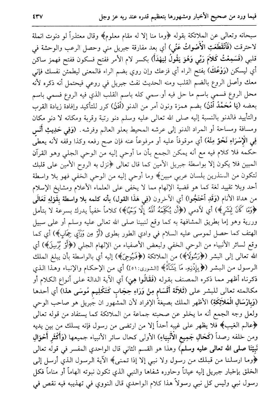 سبحانه وتعالى عن الملائكة بقوله وَما مِنَّا إِلَّا لَهُ مَقامٌ مَعْلُومٌ وقال معتذرا لو دنوت انملة لاحترقت (فانقطعت الأصوات عنّي) أي بعد مفارقة جبريل مني وحصل الرعب والوحشة في قلبي (فسمعت كلام ربّي وهو يقول ليهدأ) بكسر لام الأمر ففتح فسكون ففتح فهمز ساكن أي ليسكن (روعك) بفتح الراء أي فزعك وإن روي بضم الراء فالمعنى ليطمئن نفسك فإني معك وأصل الروع بالضم القلب ومنه الحديث نفث جبريل في روعي فيحتمل أنه ذكره لأنه محل الروع فسمي باسم ما حل فيه أو سمي كله باسم القلب الذي فيه الروع فسمي باسم بعضه (يا محمّد ادن) بضم همزة ونون أمر من الدنو (ادن) كرر للتأكيد وإفادة زيادة القرب والتأييد فالدنو بالنسبة إليه صلى الله تعالى عليه وسلم دنو رتبة وقربة ومكانه لا دنو مكان ومسافة ومساحة أو المراد الدنو إلى عرشه المحيط بعلو العالم وفرشه. (وَفِي حَدِيثِ أَنَسٍ فِي الْإِسْرَاءِ نَحْوٌ مِنْهُ) أي موقوفا عليه أو مرفوعا عنه فإن صح رفعه وكذا وقفه لأنه يعطى حكمه فلا كلام فيه مع أنه يمكن الجمع بأن ما أوحي إليه من الوحي الجلي وهو القرآن المبين فلا يكون إلا بواسطة جبريل الأمين كما قال تعالى نَزَلَ بِهِ الرُّوحُ الْأَمِينُ عَلى قَلْبِكَ لِتَكُونَ مِنَ الْمُنْذِرِينَ بِلِسانٍ عَرَبِيٍّ مُبِينٍ وما أوحي إليه من الوحي الخفي فهو بلا واسطة أحد وبلا تقييد لغة كما هو قضية الإلهام مما لا يخفى على العلماء الأعلام ومشايخ الإسلام من هداة الأنام (وقد احتجّوا) أي الآخرون (في هذا القول) بأنه كلمه بلا واسطة بقوله تعالى وَما كانَ لِبَشَرٍ) أي لآدمي (أَنْ يُكَلِّمَهُ اللَّهُ إِلَّا وَحْياً) كلاما خفيا يدرك بسرعة لا بتأمل وروية وهو إما بطريق المشافهة به كما وقع لنبينا صلى الله تعالى عليه وسلم أو على سبيل الهتف كما حصل لموسى عليه السلام في وادي الطور بطوى (أَوْ مِنْ وَراءِ حِجابٍ) أي كما وقع لسائر الأنبياء من الوحي الخفي ولبعض الأصفياء من الإلهام الجلي (أَوْ يُرْسِلَ) أي الله تعالى إلى البشر (رَسُولًا) من الملائكة (فَيُوحِيَ) إليه أي بالواسطة بأن يبلغ الملك الرسول من البشر (بِإِذْنِهِ ما يَشاءُ [الشورى: 51] ) أي من الإحكام والإنباء وهذا الذي ذكرناه أظهر مما ذكره المصنف بقوله (فقالوا هي) أي الآية الدالة على أنواع الكلام أو مكالمته تعالى للبشر على (ثَلَاثَةُ أَقْسَامٍ مِنْ وَرَاءِ حِجَابٍ كَتَكْلِيمِ مُوسَى هذا) أي أحدها (وبارسال الملائكة) الأظهر الملك بصيغة الإفراد لأن المشهور ان جبريل هو صاحب الوحي ولعل وجه الجمع أنه ما يخلو عن صحبته جماعة من الملائكة كما يستفاد من قوله تعالى عالِمُ الْغَيْبِ فَلَا يُظْهِرُ عَلَى غَيْبِهِ أَحَدًا إلا من ارتضى من رسول فإنه يسلك من بين يديه ومن خلفه رصدا (كحال جميع الأنبياء) الأولى كحال سائر الأنبياء جميعها (وأكثر أحوال نبيّنا صلى الله تعالى عليه وسلم) وهذا هو القسم الثاني قال الواحدي المفسر في قَوْلِهِ تَعَالَى وَما أَرْسَلْنا مِنْ قَبْلِكَ مِنْ رَسُولٍ وَلا نَبِيٍّ إِلَّا إِذا تَمَنَّى الآية الرسول الذي أرسل إلى الخلق بإخبار جبريل إليه عيانا وحاوره شفاها والنبي الذي تكون نبوته الهاما أو مناما فكل رسول نبي وليس كل نبي رسولا هذا كلام الواحدي قال النووي في تهذيبه فيه نقص في