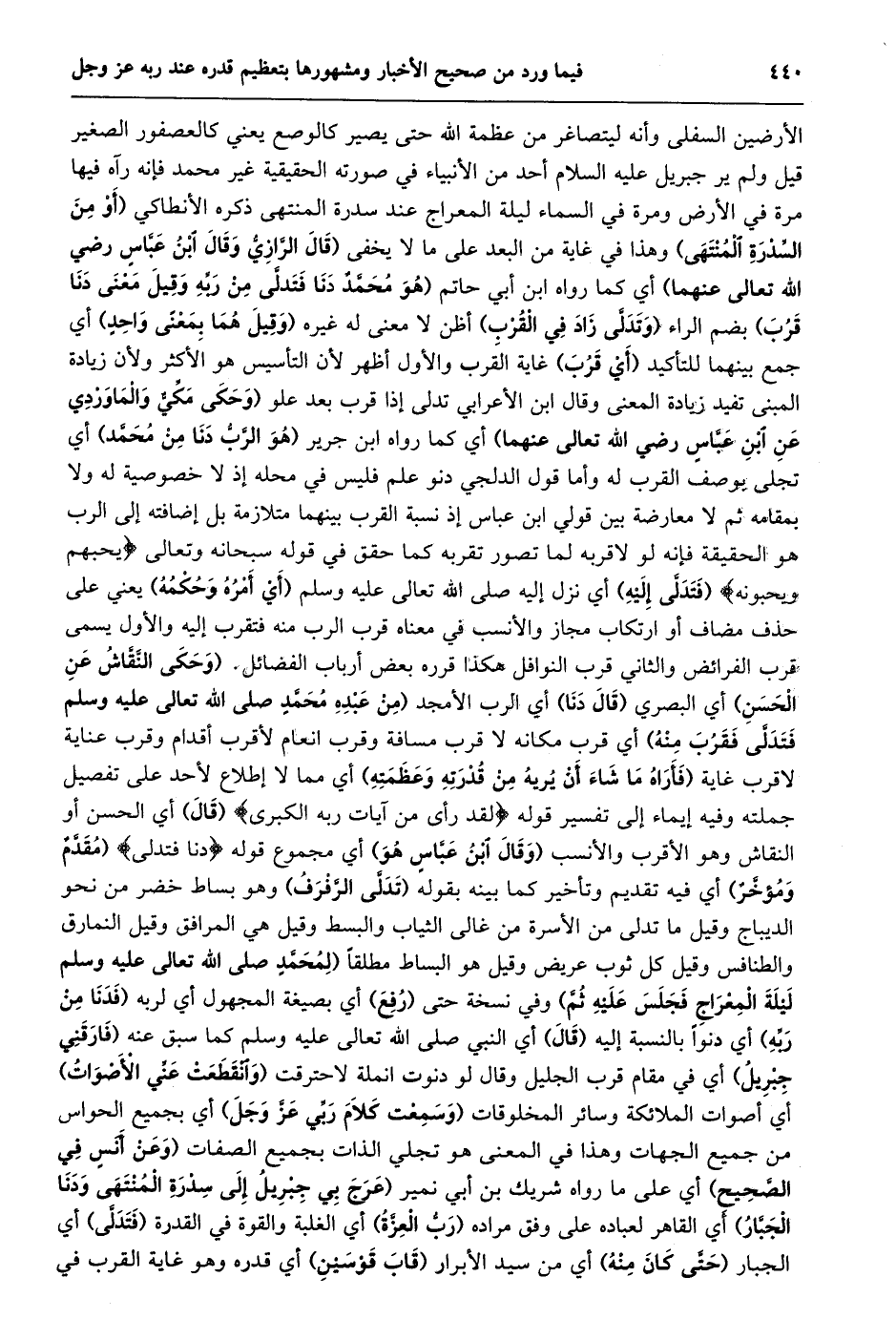 الأرضين السفلى وأنه ليتصاغر من عظمة الله حتى يصير كالوصع يعني كالعصفور الصغير قيل ولم ير جبريل عليه السلام أحد من الأنبياء في صورته الحقيقية غير محمد فإنه رآه فيها مرة في الأرض ومرة في السماء ليلة المعراج عند سدرة المنتهى ذكره الأنطاكي (أو من السّدرة المنتهى) وهذا في غاية من البعد على ما لا يخفى (قال الرّازيّ وقال ابن عبّاس رضي الله تعالى عنهما) أي كما رواه ابن أبي حاتم (هُوَ مُحَمَّدٌ دَنَا فَتَدَلَّى مِنْ رَبِّهِ وَقِيلَ معنى دنا قرب) بضم الراء (وتدلّى زاد في القرب) أظن لا معنى له غيره (وقيل هما بمعنى واحد) أي جمع بينهما للتأكيد (أي قرب) غاية القرب والأول أظهر لأن التأسيس هو الأكثر ولأن زيادة المبنى تفيد زيادة المعنى وقال ابن الأعرابي تدلى إذا قرب بعد علو (وحكى مكّيّ والماوردي عن ابن عبّاس رضي الله تعالى عنهما) أي كما رواه ابن جرير (هو الرّبّ دنا من محمّد) أي تجلى بوصف القرب له وأما قول الدلجي دنو علم فليس في محله إذ لا خصوصية له ولا بمقامه ثم لا معارضة بين قولي ابن عباس إذ نسبة القرب بينهما متلازمة بل إضافته إلى الرب هو الحقيقة فإنه لو لاقربه لما تصور تقربه كما حقق في قوله سبحانه وتعالى يُحِبُّهُمْ وَيُحِبُّونَهُ (فتدلّى إليه) أي نزل إليه صلى الله تعالى عليه وسلم (أي أمره وحكمه) يعني على حذف مضاف أو ارتكاب مجاز والأنسب في معناه قرب الرب منه فتقرب إليه والأول يسمى قرب الفرائض والثاني قرب النوافل هكذا قرره بعض أرباب الفضائل. (وحكى النّقّاش عن الحسن) أي البصري (قال دنا) أي الرب الأمجد (من عبده محمّد صلى الله تعالى عليه وسلم فتدلّى فقرب منه) أي قرب مكانه لا قرب مسافة وقرب انعام لأقرب أقدام وقرب عناية لا قرب غاية (فَأَرَاهُ مَا شَاءَ أَنْ يُرِيَهُ مِنْ قُدْرَتِهِ وعظمته) أي مما لا إطلاع لأحد على تفصيل جملته وفيه إيماء إلى تفسير قَوْلِهِ لَقَدْ رَأى مِنْ آياتِ رَبِّهِ الْكُبْرى (قال) أي الحسن أو النقاش وهو الأقرب والأنسب (وقال ابن عبّاس هو) أي مجموع قوله دَنا فَتَدَلَّى (مقدّم ومؤخّر) أي فيه تقديم وتأخير كما بينه بقوله (تدلّى الرّفرف) وهو بساط خضر من نحو الديباج وقيل ما تدلى من الأسرة من غالى الثياب والبسط وقيل هي المرافق وقيل النمارق والطنافس وقيل كل ثوب عريض وقيل هو البساط مطلقا (لمحمّد صلى الله تعالى عَلَيْهِ وَسَلَّمَ لَيْلَةَ الْمِعْرَاجِ فَجَلَسَ عَلَيْهِ ثُمَّ) وفي نسخة حتى (رفع) أي بصيغة المجهول أي لربه (فدنا من ربّه) أي دنوا بالنسبة إليه (قال) أي النبي صلى الله تعالى عليه وسلم كما سبق عنه (فارقني جبريل) أي في مقام قرب الجليل وقال لو دنوت انملة لاحترقت (وانقطعت عنّي الأصوات) أي أصوات الملائكة وسائر المخلوقات (وسمعت كلام ربّي عزّ وجل) أي بجميع الحواس من جميع الجهات وهذا في المعنى هو تجلي الذات بجميع الصفات (وعن أنس في الصّحيح) أي على ما رواه شريك بن أبي نمير (عَرَجَ بِي جِبْرِيلُ إِلَى سِدْرَةِ الْمُنْتَهَى وَدَنَا الجبّار) أي القاهر لعباده على وفق مراده (ربّ العزّة) أي الغلبة والقوة في القدرة (فتدلّى) أي الجبار (حتّى كان منه) أي من سيد الأبرار (قاب قوسين) أي قدره وهو غاية القرب في