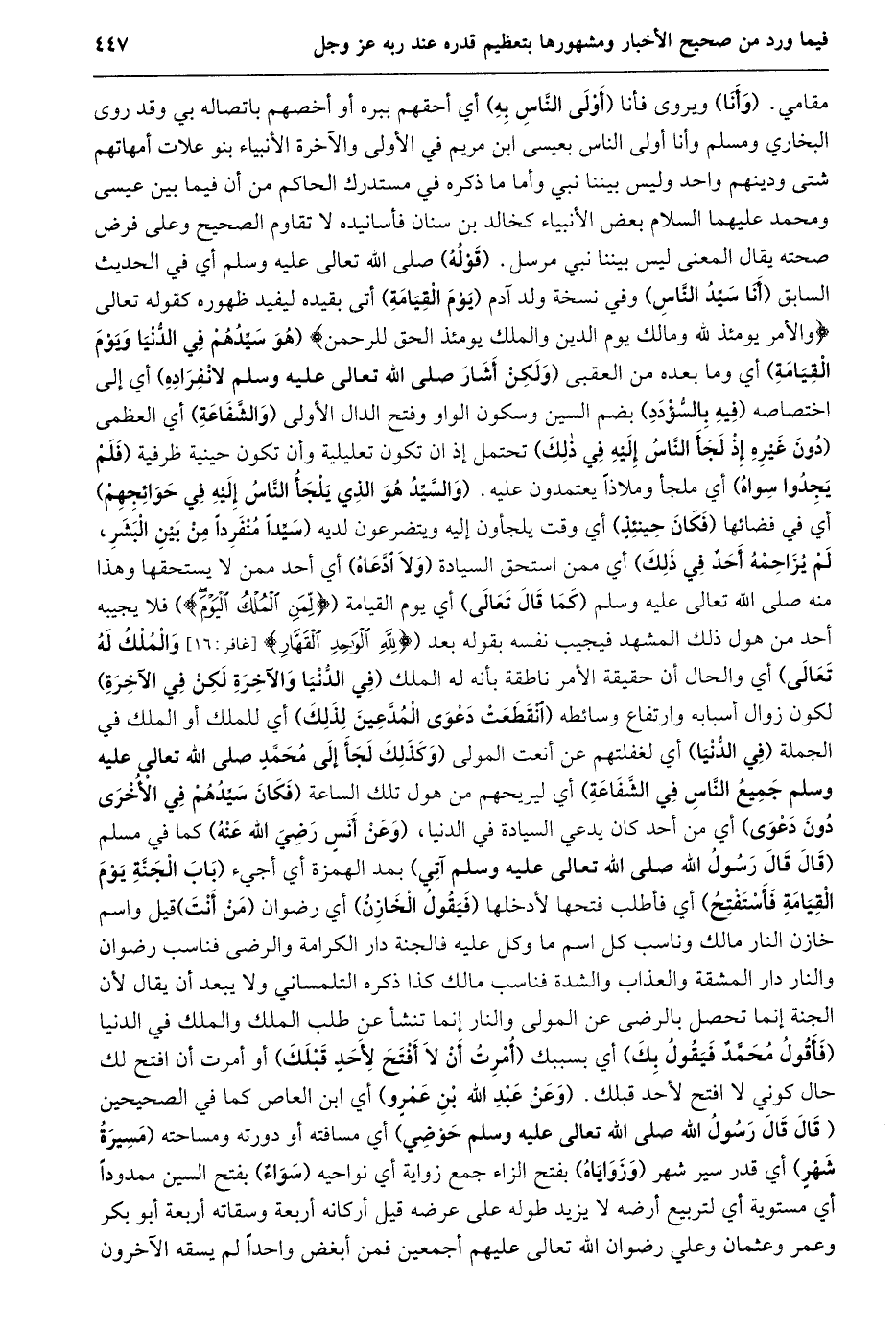 مقامي. (وأنا) ويروى فأنا (أولى النّاس به) أي أحقهم ببره أو أخصهم باتصاله بي وقد روى البخاري ومسلم وأنا أولى الناس بعيسى ابن مريم في الأولى والآخرة الأنبياء بنو علات أمهاتهم شتى ودينهم واحد وليس بيننا نبي وأما ما ذكره في مستدرك الحاكم من أن فيما بين عيسى ومحمد عليهما السلام بعض الأنبياء كخالد بن سنان فأسانيده لا تقاوم الصحيح وعلى فرض صحته يقال المعنى ليس بيننا نبي مرسل. (قوله) صلى الله تعالى عليه وسلم أي في الحديث السابق (أنا سيّد النّاس) وفي نسخة ولد آدم (يوم القيامة) أتى بقيده ليفيد ظهوره كقوله تعالى وَالْأَمْرُ يَوْمَئِذٍ لِلَّهِ ومالِكِ يَوْمِ الدِّينِ والْمُلْكُ يَوْمَئِذٍ الْحَقُّ لِلرَّحْمنِ (هو سيّدهم في الدّنيا ويوم القيامة) أي وما بعده من العقبى (ولكن أشار صلى الله تعالى عليه وسلم لانفراده) أي إلى اختصاصه (فيه بالسّؤدد) بضم السين وسكون الواو وفتح الدال الأولى (والشّفاعة) أي العظمى (دُونَ غَيْرِهِ إِذْ لَجَأَ النَّاسُ إِلَيْهِ فِي ذلك) تحتمل إذ ان تكون تعليلية وأن تكون حينية ظرفية (فلم يجدوا سواه) أي ملجأ وملاذا يعتمدون عليه. (وَالسَّيِّدُ هُوَ الَّذِي يَلْجَأُ النَّاسُ إِلَيْهِ فِي حوائجهم) أي في فضائها (فكان حينئذ) أي وقت يلجأون إليه ويتضرعون لديه (سَيِّدًا مُنْفَرِدًا مِنْ بَيْنِ الْبَشَرِ، لَمْ يُزَاحِمْهُ أحد في ذلك) أي ممن استحق السيادة (ولا ادّعاه) أي أحد ممن لا يستحقها وهذا منه صلى الله تعالى عليه وسلم (كما قال تعالى) أي يوم القيامة (لِمَنِ الْمُلْكُ الْيَوْمَ) فلا يجيبه أحد من هول ذلك المشهد فيجيب نفسه بقوله بعد (لِلَّهِ الْواحِدِ الْقَهَّارِ [غَافِرٍ: 16] وَالْمُلْكُ لَهُ تَعَالَى) أي والحال أن حقيقة الأمر ناطقة بأنه له الملك (في الدّنيا والآخرة لكن في الآخرة) لكون زوال أسبابه وارتفاع وسائطه (انقطعت دعوى المدّعين لذلك) أي للملك أو الملك في الجملة (في الدّنيا) أي لغفلتهم عن أنعت المولى (وكذلك لجأ إلى محمّد صلى الله تعالى عليه وسلم جميع النّاس في الشّفاعة) أي ليريحهم من هول تلك الساعة (فكان سيّدهم في الأخرى دون دعوى) أي من أحد كان يدعي السيادة في الدنيا، (وعن أنس رضي الله عنه) كما في مسلم (قال قال رسول الله صلى الله تعالى عليه وسلم آتي) بمد الهمزة أي أجيء (باب الجنّة يوم القيامة فأستفتح) أي فأطلب فتحها لأدخلها (فيقول الخازن) أي رضوان (من أنت) قيل واسم خازن النار مالك وناسب كل اسم ما وكل عليه فالجنة دار الكرامة والرضى فناسب رضوان والنار دار المشقة والعذاب والشدة فناسب مالك كذا ذكره التلمساني ولا يبعد أن يقال لأن الجنة إنما تحصل بالرضى عن المولى والنار إنما تنشأ عن طلب الملك والملك في الدنيا (فأقول محمّد فيقول بك) أي بسببك (أمرت أنه لا أفتح لأحد قبلك) أو أمرت أن افتح لك حال كوني لا أَفْتَحَ لِأَحَدٍ قَبْلَكَ. (وَعَنْ عَبْدِ اللَّهِ بْنِ عمرو) أي ابن العاص كما في الصحيحين (قال قال رسول الله صلى الله تعالى عليه وسلم حوضي) أي مسافته أو دورته ومساحته (مسيرة شهر) أي قدر سير شهر (وزواياه) بفتح الزاء جمع زواية أي نواحيه (سواء) بفتح السين ممدودا أي مستوية أي لتربيع أرضه لا يزيد طوله على عرضه قيل أركانه أربعة وسقاته أربعة أبو بكر وعمر وعثمان وعلي رضوان الله تعالى عليهم أجمعين فمن أبغض واحدا لم يسقه الآخرون