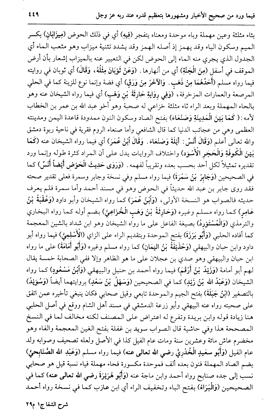 بثاء مثلثة وعين مهملة وباء موحدة ومعناه يتفجر (فيه) أي في ذلك الحوض (ميزابان) بكسر الميم وسكون الياء وقد يهمز إذ أصله الهمز وقد يشدد تثنية ميزاب وهو مثعب الماء أي الجدول الذي يجري منه الماء إلى الحوض لكن في التعبير عنه بالميزاب إشعار بأن أرض الموقف في أسفل (من الجنّة) أي من أنهارها. (وعن ثوبان مثله، وقال) أي ثوبان في روايته فيما رواه مسلم (أحدهما من ذهب. والآخر من ورق) أي فضة وإنما نوع للزينة كما في الحلي المرصعة والعمارات المزخرفة، (وفي رواية حارثة بن وهب) أي فيما رواه الشيخان عنه وهو بالحاء المهملة وبعد الراء ثاء مثلثة خزاعي له صحبة وهو أخو عبد الله بن عمر بن الخطاب لأمه: (كما بين المدينة وصنعاء) بفتح الصاد وسكون النون ممدودة قاعدة اليمن ومدينته العظمى وهي من عجائب الدنيا كما قال الشافعي وأما صنعاء الروم فقرية في ناحية ربوة دمشق والله تعالى أعلم (وَقَالَ أَنَسٌ: أَيْلَةُ وَصَنْعَاءُ. وَقَالَ ابْنُ عُمَرَ) أي فيما رواه الشيخان عنه (كما بين الكوفة والحجر الأسود) واختلاف الروايات يدل على أن المراد كثرة طوله وإنما ورد تقديره تمثيلا لكل أحد بحسب بعده وتقريبا لفهمه. (وروى حديث الحوض أيضا أنس) كما في الصحيحين (وجابر بن سمرة) فيما رواه مسلم وفي نسخة وجابر وسمرة فعلى تقدير صحته فقد روى جابر بن عبد الله حديثا في الحوض وهو في مسند أحمد وأما سمرة فلم يعرف حديثه فالصواب هو النسخة الأولى، (وابن عمر) كما رواه الشيخان وأبو داود (وعقبة بن عامر) كما رواه مسلم وغيره (وحارثة بن وهب الخزاعيّ) بضم أوله كما رواه البخاري والترمذي (والمستورد) بصيغة الفاعل على ما رواه الشيخان وهو ابن شداد بالشين المعجمة كما أفاده الحلبي (وأبو برزة) بفتح الموحدة وبتقديم الراء على الزاي (الأسلميّ) فيما رواه أبو داود وابن حبان والبيهقي (وحذيفة بن اليمان) كما رواه مسلم وغيره (وأبو أمامة) على ما رواه ابن حبان والبيهقي وهو صدي بن عجلان على ما هو الظاهر وإلا ففي الصحابة خمسة يقال لهم أبو أمامة (وزيد بن أرقم) فيما رواه أحمد بن حنبل والبيهقي (وابن مسعود) كما رواه الشيخان (وعبد الله بن زيد) كما في الصحيحين (وسهل بن سعد) بروايتهما أيضا (وسويد) بالتصغير (ابن جبلة) بفتح الجيم والموحدة تابعي وقيل صحابي فكان ينبغي تأخيره عمن اتفق على صحبته رواه عنه البيهقي وأبو زرعة الدمشقي في مسند أهل الشام ووقع في أصل الحلبي هنا زيادة قوله وابن بريدة وتفرع له اعتراض على المصنف لكنه مخالف لما في النسخ المصححة هذا وفي حاشية قال الصواب سويد بن غفلة بفتح الغين المعجمة والفاء وهو مخضرم عاش مائة وعشرين سنة ومات عام الفيل كذا في الأصل ولعله تصحيف وصوابه ولد عام الفيل (وأبو سعيد الخدريّ رضي الله تعالى عنه) فيما رواه مسلم (وعبد الله الصّنابحيّ) بضم الصاد المهملة فنون بعده ألف فموحدة مكسورة فحاء مهملة فياء نسبة قيل هو صحابي نسب إلى جده صنابح رواه أحمد وابن ماجة عنه (وأبو هريرة رضي الله تعالى عنه) كما في الصحيحين (والبراء) بفتح الباء وتخفيف الراء أي ابن عازب كما في نسخة رواه أحمد