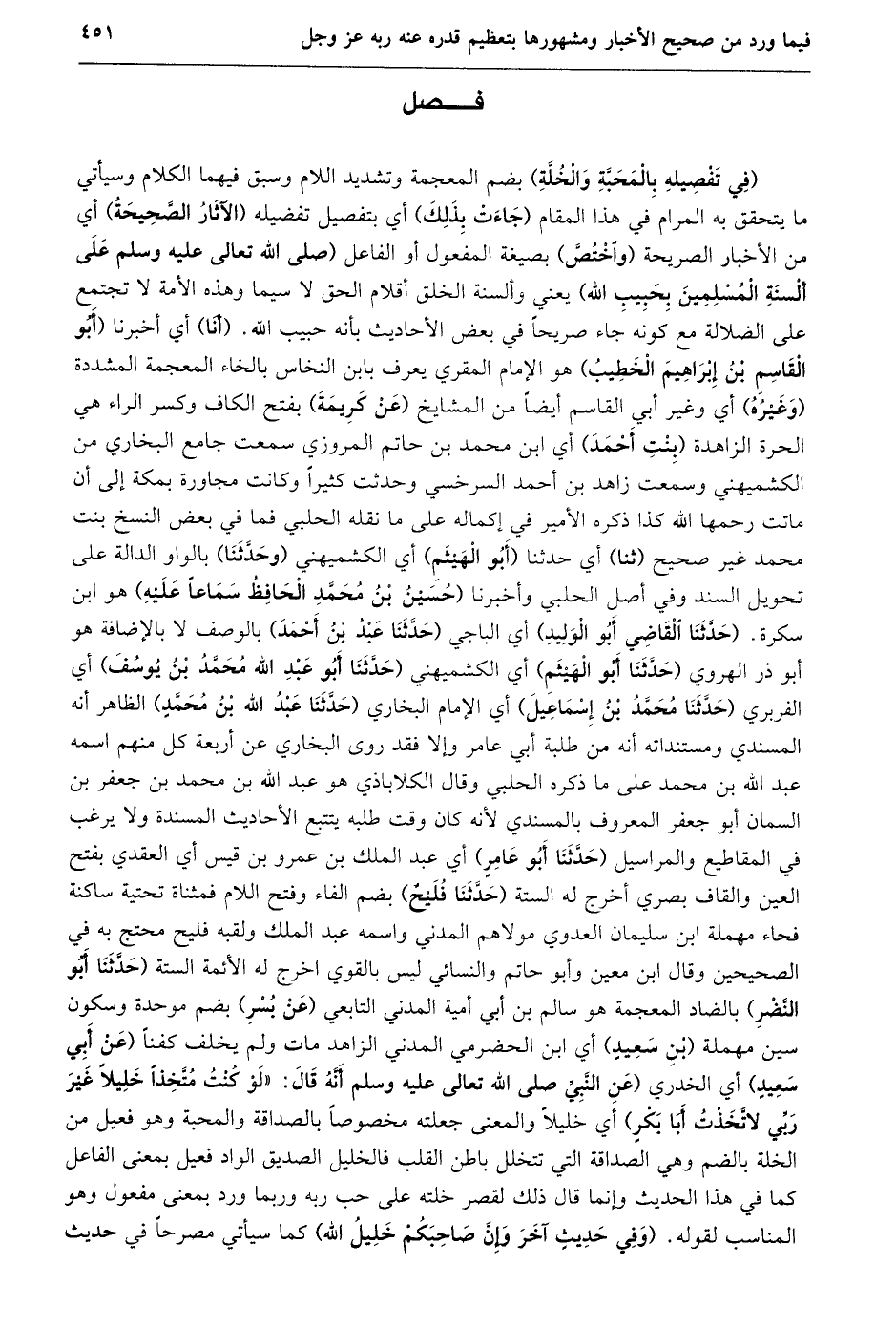 (في تفصيله بالمحبّة والخلّة) بضم المعجمة وتشديد اللام وسبق فيهما الكلام وسيأتي ما يتحقق به المرام في هذا المقام (جاءت بذلك) أي بتفصيل تفضيله (الآثار الصّحيحة) أي من الأخبار الصريحة (واختصّ بصيغة المفعول أو الفاعل (صلى الله تعالى عليه وسلم على ألسنة المسلمين بحبيب الله) يعني وألسنة الخلق أقلام الحق لا سيما وهذه الأمة لا تجتمع على الضلالة مع كونه جاء صريحا في بعض الأحاديث بأنه حبيب الله. (أنا) أي أخبرنا (أبو القاسم بن إبراهيم الخطيب) هو الإمام المقري يعرف بابن النخاس بالخاء المعجمة المشددة (وغيره) أي وغير أبي القاسم أيضا من المشايخ (عن كريمة) بفتح الكاف وكسر الراء هي الحرة الزاهدة (بنت أحمد) أي ابن محمد بن حاتم المروزي سمعت جامع البخاري من الكشميهني وسمعت زاهد بن أحمد السرخسي وحدثت كثيرا وكانت مجاورة بمكة إلى أن ماتت رحمها الله كذا ذكره الأمير في إكماله على ما نقله الحلبي فما في بعض النسخ بنت محمد غير صحيح (ثنا) أي حدثنا (أبو الهيثم) أي الكشميهني (وحدّثنا) بالواو الدالة على تحويل السند وفي أصل الحلبي وأخبرنا (حسين بن محمّد الحافظ سماعا عليه) هو ابن سكرة. (حدّثنا القاضي أبو الوليد) أي الباجي (حدّثنا عبد بن أحمد) بالوصف لا بالإضافة هو أبو ذر الهروي (حدّثنا أبو الهيثم) أي الكشميهني (حَدَّثَنَا أَبُو عَبْدِ اللَّهِ مُحَمَّدُ بْنُ يُوسُفَ) أي الفربري (حدّثنا محمّد بن إسماعيل) أي الإمام البخاري (حدّثنا عبد الله بن محمّد) الظاهر أنه المسندي ومستنداته أنه من طلبة أبي عامر وإلا فقد روى البخاري عن أربعة كل منهم اسمه عبد الله بن محمد على ما ذكره الحلبي وقال الكلاباذي هو عبد الله بن محمد بن جعفر بن السمان أبو جعفر المعروف بالمسندي لأنه كان وقت طلبه يتتبع الأحاديث المسندة ولا يرغب في المقاطيع والمراسيل (حدّثنا أبو عامر) أي عبد الملك بن عمرو بن قيس أي العقدي بفتح العين والقاف بصري أخرج له الستة (حدّثنا فليح) بضم الفاء وفتح اللام فمثناة تحتية ساكنة فحاء مهملة ابن سليمان العدوي مولاهم المدني واسمه عبد الملك ولقبه فليح محتج به في الصحيحين وقال ابن معين وأبو حاتم والنسائي ليس بالقوي اخرج له الأئمة الستة (حدّثنا أبو النّضر) بالضاد المعجمة هو سالم بن أبي أمية المدني التابعي (عن بسر) بضم موحدة وسكون سين مهملة (بن سعيد) أي ابن الحضرمي المدني الزاهد مات ولم يخلف كفنا (عن أبي سعيد) أي الخدري (عن النّبيّ صلى الله تعالى عَلَيْهِ وَسَلَّمَ أَنَّهُ قَالَ: «لَوْ كُنْتُ مُتَّخِذًا خليلا غير ربّي لاتّخذت أبا بكر) أي خليلا والمعنى جعلته مخصوصا بالصداقة والمحبة وهو فعيل من الخلة بالضم وهي الصداقة التي تتخلل باطن القلب فالخليل الصديق الواد فعيل بمعنى الفاعل كما في هذا الحديث وإنما قال ذلك لقصر خلته على حب ربه وربما ورد بمعنى مفعول وهو المناسب لقوله. (وَفِي حَدِيثٍ آخَرَ وَإِنَّ صَاحِبَكُمْ خَلِيلُ اللَّهِ) كما سيأتي مصرحا في حديث