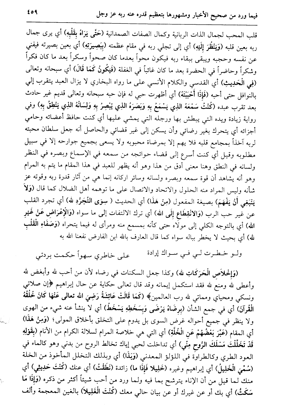 قلب المحب لجمال الذات الربانية وكمال الصفات الصمدانية (حتّى يراه بقلبه) أي يرى جمال ربه بعين قلبه (وينظر إليه) أي إلى تجلي ربه في مقام عظمته (ببصيرته) أي بعين بصيرته فيفني عن نفسه وحجبه ويبقى ببقاء ربه فيكون محوا بعد ما كان صحوا وسكرا بعد ما كان فكرا وشكرا وحاضرا في الحضرة بعد ما كان غائبا في الغفلة (فيكون كما قال) أي سبحانه وتعالى (في الحديث) أي القدسي والكلام الأنسي على ما رواه البخاري لا يزال العبد يتقرب إلي بالنوافل حتى أحبه (فإذا أحببته) أي أظهرت حبي له فإن حبه سبحانه وتعالى قديم غير حادث بعد تقرب عبده (كُنْتُ سَمْعَهُ الَّذِي يَسْمَعُ بِهِ وَبَصَرَهُ الَّذِي يبصر به ولسانه الذي ينطق به) وفي رواية زيادة ويده التي يبطش بها ورجله التي يمشي عليها أي كنت حافظ أعضائه وحامي أجزائه أي يتحرك بغير رضائي وأن يسكن إلى غير قضائي والحاصل أنه جعل سلطان محبته لربه آخذا بمجامع قلبه فلا يهم إلا بمرضاة محبوبه ولا يسعى بجميع جوارحه إلا في سبيل مطلوبه وقيل أي كنت أسرع إلى قضاء حوائجه من سمعه في الإسماع وبصره في النظر ولسانه في النطق وهنا معنى أدق من هذا وهو أنه يظهر للعبد في هذا المقام ما يتم به المرام وهو أنه يشاهد أن قوة سمعه وبصره ولسانه وسائر اركانه إنما هي من آثار قدرة ربه وقوته عز شأنه وليس المراد منه الحلول والاتحاد والاتصال على ما توهمه أهل الضلال كما قال (ولا ينبغي أن يفهم) بصيغة المفعول (من هذا) أي الحديث (سوى التّجرّد لله) أي تجرد القلب عن غير حب الرب (والانقطاع إلى الله) أي ترك الالتفات إلى ما سواه (والإعراض عن غير الله) أي بالتوجه الكلي إلى مولاه حتى كأنه بمسمع منه ومرأى له فيما يتحراه (وصفاء القلب لله) أي بحيث لا يخطر بباله سواه كما قال العارف بالله ابن الفارض نفعنا الله به