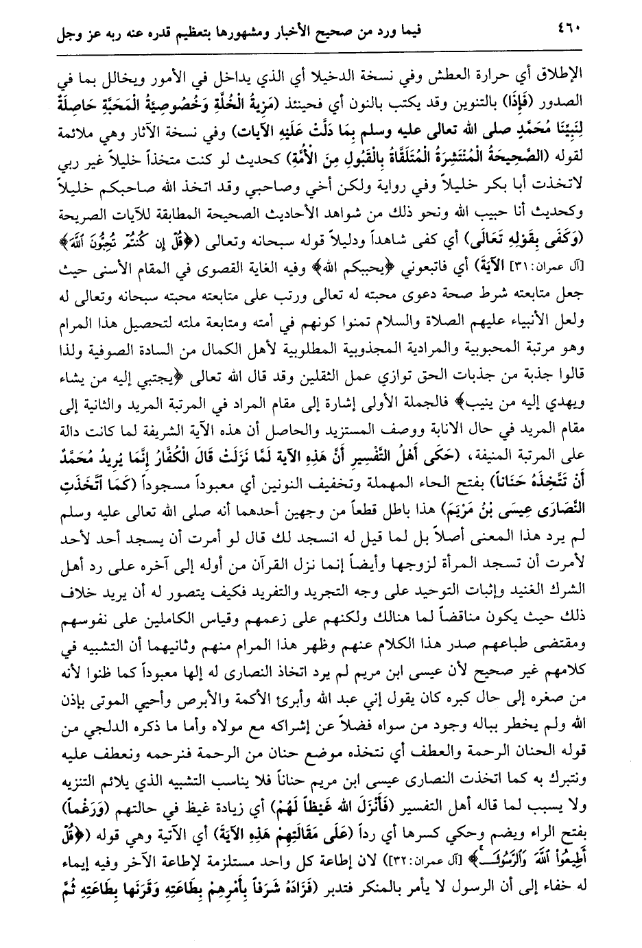 الإطلاق أي حرارة العطش وفي نسخة الدخيلا أي الذي يداخل في الأمور ويخالل بما في الصدور (فإذا) بالتنوين وقد يكتب بالنون أي فحينئذ (مزية الخلّة وخصوصيّة المحبّة حاصلة لنبيّنا محمّد صلى الله تعالى عليه وسلم بما دلّت عليه الآيات) وفي نسخة الآثار وهي ملائمة لقوله (الصّحيحة المنتشرة المتلقّاة بالقبول من الأمّة) كحديث لَوْ كُنْتُ مُتَّخِذًا خَلِيلًا غَيْرَ رَبِّي لَاتَّخَذْتُ أبا بكر خليلا وفي رواية ولكن أخي وصاحبي وقد اتخذ الله صاحبكم خليلا وكحديث أنا حبيب الله ونحو ذلك من شواهد الأحاديث الصحيحة المطابقة للآيات الصريحة (وكفى بقوله تعالى) أي كفى شاهدا ودليلا قوله سبحانه وتعالى (قُلْ إِنْ كُنْتُمْ تُحِبُّونَ اللَّهَ [آلِ عِمْرَانَ: 31] الآية) أي فاتبعوني يُحْبِبْكُمُ اللَّهُ وفيه الغاية القصوى في المقام الأسنى حيث جعل متابعته شرط صحة دعوى محبته له تعالى ورتب على متابعته محبته سبحانه وتعالى له ولعل الأنبياء عليهم الصلاة والسلام تمنوا كونهم في أمته ومتابعة ملته لتحصيل هذا المرام وهو مرتبة المحبوبية والمرادية المجذوبية المطلوبية لأهل الكمال من السادة الصوفية ولذا قالوا جذبة من جذبات الحق توازي عمل الثقلين وقد قال الله تعالى يَجْتَبِي إِلَيْهِ مَنْ يَشاءُ وَيَهْدِي إِلَيْهِ مَنْ يُنِيبُ فالجملة الأولى إشارة إلى مقام المراد في المرتبة المريد والثانية إلى مقام المريد في حال الانابة ووصف المستزيد والحاصل أن هذه الآية الشريفة لما كانت دالة على المرتبة المنيفة، (حَكَى أَهْلُ التَّفْسِيرِ أَنَّ هَذِهِ الْآيَةَ لَمَّا نَزَلَتْ قَالَ الْكُفَّارُ إِنَّمَا يُرِيدُ مُحَمَّدٌ أَنْ تتّخذه حنانا) بفتح الحاء المهملة وتخفيف النونين أي معبودا مسجودا (كما اتّخذت النّصارى عيسى بن مريم) هذا باطل قطعا من وجهين أحدهما أنه صلى الله تعالى عليه وسلم لم يرد هذا المعنى أصلا بل لما قيل له انسجد لك قال لو أمرت أن يسجد أحد لأحد لأمرت أن تسجد المرأة لزوجها وأيضا إنما نزل القرآن من أوله إلى آخره على رد أهل الشرك الغنيد وإثبات التوحيد على وجه التجريد والتفريد فكيف يتصور له أن يريد خلاف ذلك حيث يكون مناقضا لما هنالك ولكنهم على زعمهم وقياس الكاملين على نفوسهم ومقتضى طباعهم صدر هذا الكلام عنهم وظهر هذا المرام منهم وثانيهما أن التشبيه في كلامهم غير صحيح لأن عيسى ابن مريم لم يرد اتخاذ النصارى له إلها معبودا كما ظنوا لأنه من صغره إلى حال كبره كان يقول إني عبد الله وأبرئ الأكمة والأبرص وأحيي الموتى بإذن الله ولم يخطر بباله وجود من سواه فضلا عن إشراكه مع مولاه وأما ما ذكره الدلجي من قوله الحنان الرحمة والعطف أي نتخذه موضع حنان من الرحمة فنرحمه ونعطف عليه ونتبرك به كما اتخذت النصارى عيسى ابن مريم حنانا فلا يناسب التشبيه الذي يلائم التنزيه ولا يسبب لما قاله أهل التفسير (فأنزل الله غيظا لهم) أي زيادة غيظ في حالتهم (ورغما) بفتح الراء ويضم وحكي كسرها أي ردا (على مقالتهم هذه الآية) أي الآتية وهي قوله (قُلْ أَطِيعُوا اللَّهَ وَالرَّسُولَ [آل عمران: 32] ) لان إطاعة كل واحد مستلزمة لإطاعة الآخر وفيه إيماء له خفاء إلى أن الرسول لا يأمر بالمنكر فتدبر (فَزَادَهُ شَرَفًا بِأَمْرِهِمْ بِطَاعَتِهِ وَقَرْنِهَا بِطَاعَتِهِ ثُمَّ
