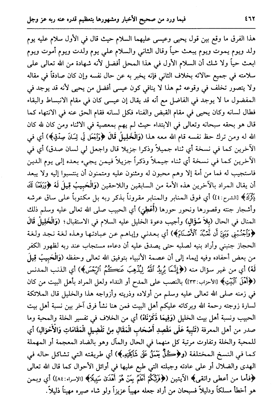 هذا الفرق ما وقع بين قول يحيى وعيسى عليهما السلام حيث قال في الأول سلام عليه يوم ولد ويوم يموت ويوم يبعث حيا وقال الثاني والسلام علي يوم ولدت ويوم أموت ويوم ابعث حيا ولا شك أن السلام الأول في هذا المحل أفضل لأنه شهادة من الله تعالى على سلامته في جميع حالاته بخلاف الثاني فإنه يخبر به عن حال نفسه وإن كان صادقا في مقاله ولا يتصور تخلف في وقوعه ثم هذا لا ينافي كون عيسى أفضل من يحيى لأنه قد يوجد في المفضول ما لا يوجد في الفاضل مع أنه قد يقال إن عيسى كان في مقام الانبساط والبقاء فطال لسانه وكان يحيى في مقام القبض والفناء فكل لسانه فقام الحق عنه في الانتهاء كما قال هو بحقه سبحانه وتعالى في الابتداء حيث لم يهم بمعصية في الاثناء ومن كان لله كان الله له ومن ترك حظ نفسه قام الله معه هذا (والخليل قال وَاجْعَلْ لِي لِسانَ صِدْقٍ) أي في الآخرين كما في نسخة أي ثناء جميلا وذكرا جزيلا قال واجعل لي لسان صدق) أي في الآخرين كما في نسخة أي ثناء جميلا وذكرا جزيلا فيمن يجيء بعده إلى يوم الدين فاستجيب له فما من أمة إلا وهم محبون له ومثنون عليه ومتمنون أن ينتسبوا إليه ولا يبعد أن يقال المراد بالآخرين هذه الأمة من السابقين واللاحقين (وَالْحَبِيبُ قِيلَ لَهُ وَرَفَعْنا لَكَ ذِكْرَكَ [الشَّرْحِ: 4] ) أي فوق المنابر والمنابر مقرونا بذكر ربه بل مكتوبا على ساق عرشه وأشجار جنته وقصورها ونحور حورها (أعطي) أي الحبيب صلى الله تعالى عليه وسلم ذلك المنال في الحال (بلا سؤال) وأجيب دعوة الخليل عليه السلام في الاستقبال؛ (وَالْخَلِيلُ قَالَ وَاجْنُبْنِي وَبَنِيَّ أَنْ نَعْبُدَ الْأَصْنامَ) أي بعدني وإياهم عن عبادتها وهذه لغة نجد ولغة الحجاز جنبني وأراد بنيه لصلبه حتى يصدق عليه أن دعاءه مستجاب عند ربه لظهور الكفر من بعض أحفاده وفيه إيماء إلى أن عصمة الأنبياء بتوفيق الله تعالى وحفظه (والحبيب قيل له) أي من غير سؤال منه (إِنَّما يُرِيدُ اللَّهُ لِيُذْهِبَ عَنْكُمُ الرِّجْسَ) أي الذنب المدنس (أَهْلَ الْبَيْتِ [الأحزاب: 33] ) بالنصب على المدح أو النداء ولعل المراد بأهل البيت من كان في زمنه صلى الله تعالى عليه وسلم من أولاده وذريته وأزواجه هذا والخليل قال الملائكة لسارة زوجته رحمة الله وبركاته عليكم أهل البيت فمن هنا نشأ فرق آخر بين نسبة أهل بيت الحبيب ونسبة أهل بيت الخليل (وفيما ذكرناه) أي من الخلاف في تفسير الخلة والمحبة وما صدر من أهل المعرفة (تنبيه على مقصد أصحاب المقال من تفضيل المقامات والأحوال) أي للمحبة والخلة وتفاوت مرتبة كل منهما في الحال والمآل وهو بالضاد المعجمة أو المهملة كما في النسخ المختلفة (وكُلٌّ يَعْمَلُ عَلى شاكِلَتِهِ) أي طريقته التي تشاكل حاله في الهدى والضلال أو على عادته وجبلته التي طبع عليها في أوائل الأحوال كما قال الله تعالى فَأَمَّا مَنْ أَعْطى وَاتَّقى الآيتين (فَرَبُّكُمْ أَعْلَمُ بِمَنْ هُوَ أَهْدى سَبِيلًا [الْإِسْرَاءِ: 84] ) أي وبمن هو أخطأ مسلكا ودليلا فسبحان من أراد جعله مهيبا عزيزا ولو شاء صيره مهينا ذليلا.