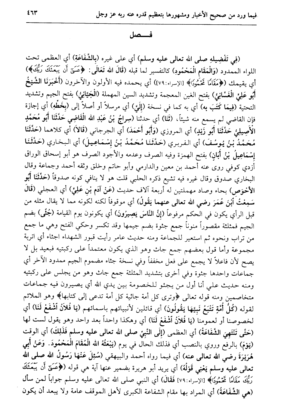 (في تفضيله صلى الله تعالى عليه وسلم) أي على غيره (بالشّفاعة) أي العظمى تحت اللواء الممدود (والمقام المحمود) كالتفسير لما قبله (قَالَ اللَّهُ تَعَالَى: عَسى أَنْ يَبْعَثَكَ رَبُّكَ) أي يقيمك (مَقاماً مَحْمُوداً [الإسراء: 79] ) أي يحمده فيه الأولون والآخرون (أخبرنا الشّيخ أبو عليّ الغسّانيّ) بفتح الغين المعجمة وتشديد السين المهملة (الجيّانيّ) بفتح الجيم وتشديد التحتية (فيما كتب به) أي به كما في نسخة (إليّ) أي مرسلا أو أصلا إلى (بخطّه) أي إجازة فإن القاضي لم يسمع منه شيئا، (ثنا) أي حَدَّثَنَا (سِرَاجُ بْنُ عَبْدِ اللَّهِ الْقَاضِي حَدَّثَنَا أبو محمّد الأصيليّ حدّثنا أبو زيد) أي المروزي (وأبو أحمد) أي الجرجاني (قالا) أي كلاهما (حدّثنا محمّد بن يوسف) أي الفربري (حدّثنا محمّد بن إسماعيل) أي البخاري (حدّثنا إسماعيل بن أبان) بفتح الهمزة وفيه الصرف وعدمه والأجود الصرف هو أبو إسحاق الوراق أزدي كوفي روى عنه أحمد بن معين والدارمي وأبو حاتم وخلق وثقه أحمد وجماعة وقال البخاري صدوق وقال غيره فيه تشيع ذكره الحلبي قلت هو لا ينافي كونه صدوقا (حدّثنا أبو الأحوص) بحاء وصاد مهملتين له أربعة آلاف حديث (عن آدم بن عليّ) أي العجلي (قال سمعت ابن عمر رضي الله تعالى عنهما يقول) أي موقوفا لكنه لكونه مما لا يقال مثله من قبل الرأي يكون في الحكم مرفوعا (إنّ النّاس يصيرون) أي يكونون يوم القيامة (جثى) بضم الجيم فمثلثة مقصورا منونا جمع جثوة بضم جيمها وقد تكسر وحكي الفتح وهي ما جمع من تراب ونحوه ثم استعير للجماعة ومنه حديث عامر رأيت قبور الشهداء اجثاء أي اتربة مجموعة وأما قول بعضهم جمع جاث وهو الذي يكون معتمدا على ركبتيه فبعيد بل لا يصح لأن فاعلا لا يجمع لعى فعل مخففا وفي نسخة جثاء مضموم الجيم ممدود الآخر أي جماعات واحدها جثوة وفي أخرى بتشديد المثلثة جمع جاث وهو من يجلس على ركبتيه ومنه حديث علي أنا أول من يجثو للخصومة بين يدي الله أي يصيرون فيه جماعات متخاصمين ومنه قوله تعالى وَتَرى كُلَّ أُمَّةٍ جاثِيَةً كُلُّ أُمَّةٍ تُدْعى إِلى كِتابِهَا وهو الملائم لقوله (كلّ أمّة تتبع نبيّها يقولون) أي قائلين لأنبيائهم باسمائهم (يا فلان اشفع لنا) أي لخصوصنا أو لعمومنا (يا فلان اشفع لنا) أي وهكذا واحدا بعد واحد وهو يقول لست لها (حتّى تنتهي الشّفاعة) أي العظمى (إلى النّبيّ صلى الله تعالى عليه وسلم فذلك) أي الوقت (يوم) بالرفع وروي بالنصب أي فذلك الحال في يَوْمُ (يَبْعَثُهُ اللَّهُ الْمَقَامَ الْمَحْمُودَ. وَعَنْ أَبِي هريرة رضي الله تعالى عنه) أي فيما رواه أحمد والبيهقي (سئل عنها رسول الله صلى الله تعالى عليه وسلم يعني قوله) أي يريد أبو هريرة بضمير عنها آية هي قَوْلَهُ (عَسى أَنْ يَبْعَثَكَ رَبُّكَ مَقاماً مَحْمُوداً [الإسراء: 79] فقال) أي النبي صلى الله تعالى عليه وسلم جوابا لمن سأل (هي الشّفاعة) أي المراد بها مقام الشفاعة الكبرى لأهل الموقف عامة ولا يبعد أن يكون