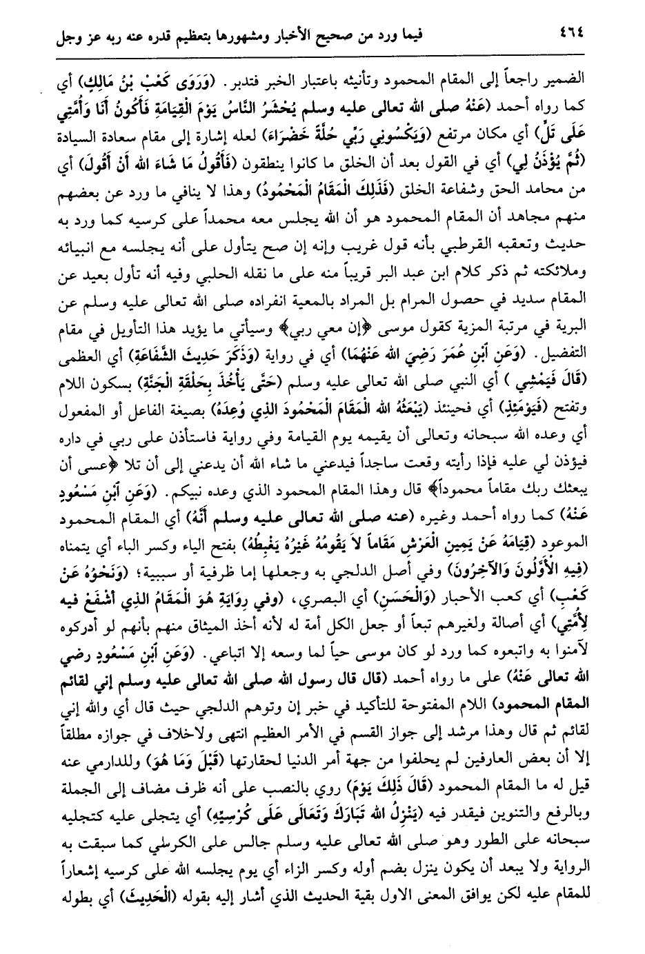 الضمير راجعا إلى المقام المحمود وتأنيثه باعتبار الخبر فتدبر. (وروى كعب بن مالك) أي كما رواه أحمد (عنه صلى الله تعالى عَلَيْهِ وَسَلَّمَ يُحْشَرُ النَّاسُ يَوْمَ الْقِيَامَةِ فَأَكُونُ أنا وأمّتي على تلّ) أي مكان مرتفع (ويكسوني ربّي حلّة خضراء) لعله إشارة إلى مقام سعادة السيادة (ثمّ يؤذن لي) أي في القول بعد أن الخلق ما كانوا ينطقون (فأقول ما شاء الله أن أقول) أي من محامد الحق وشفاعة الخلق (فذلك المقام المحمود) وهذا لا ينافي ما ورد عن بعضهم منهم مجاهد أن المقام المحمود هو أن الله يجلس معه محمدا على كرسيه كما ورد به حديث وتعقبه القرطبي بأنه قول غريب وإنه إن صح يتأول على أنه يجلسه مع انبيائه وملائكته ثم ذكر كلام ابن عبد البر قريبا منه على ما نقله الحلبي وفيه أنه تأول بعيد عن المقام سديد في حصول المرام بل المراد بالمعية انفراده صلى الله تعالى عليه وسلم عن البرية في مرتبة المزية كقول موسى إِنَّ مَعِي رَبِّي وسيأتي ما يؤيد هذا التأويل في مقام التفضيل. (وعن ابن عمر رضي الله عنهما) أي في رواية (وذكر حديث الشّفاعة) أي العظمى (قال فيمشي) أي النبي صلى الله تعالى عليه وسلم (حتّى يأخذ بحلقة الجنّة) بسكون اللام وتفتح (فيومئذ) أي فحينئذ (يبعثه الله المقام المحمود الذي وعده) بصيغة الفاعل أو المفعول أي وعده الله سبحانه وتعالى أن يقيمه يوم القيامة وفي رواية فاستأذن على ربي في داره فيؤذن لي عليه فإذا رأيته وقعت ساجدا فيدعني ما شاء الله أن يدعني إلى أن تلا عَسى أَنْ يَبْعَثَكَ رَبُّكَ مَقاماً مَحْمُوداً قال وهذا المقام المحمود الذي وعده نبيكم. (وعن ابن مسعود عنه) كما رواه أحمد وغيره (عنه صلى الله تعالى عليه وسلم أنّه) أي المقام المحمود الموعود (قِيَامُهُ عَنْ يَمِينِ الْعَرْشِ مَقَامًا لَا يَقُومُهُ غيره يغبطه) بفتح الياء وكسر الباء أي يتمناه (فيه الأوّلون والآخرون) وفي أصل الدلجي به وجعلها إما ظرفية أو سببية؛ (ونحوه عن كعب) أي كعب الأحبار (والحسن) أي البصري، (وفي رواية هو المقام الذي أشفع فيه لأمّتي) أي أصالة ولغيرهم تبعا أو جعل الكل أمة له لأنه أخذ الميثاق منهم بأنهم لو أدركوه لآمنوا به واتبعوه كما ورد لو كان موسى حيا لما وسعه إلا اتباعي. (وعن ابن مسعود رضي الله تعالى عنه) على ما رواه أحمد (قال قال رسول الله صلى الله تعالى عليه وسلم إني لقائم المقام المحمود) اللام المفتوحة للتأكيد في خبر إن وتوهم الدلجي حيث قال أي والله إني لقائم ثم قال وهذا مرشد إلى جواز القسم في الأمر العظيم انتهى ولا خلاف في جوازه مطلقا إلا أن بعض العارفين لم يحلفوا من جهة أمر الدنيا لحقارتها (قبل وما هو) وللدارمي عنه قيل له ما المقام المحمود (قال ذلك يوم) روي بالنصب على أنه ظرف مضاف إلى الجملة وبالرفع والتنوين فيقدر فيه (ينزل الله تبارك وتعالى على كرسيّه) أي يتجلى عليه كتجليه سبحانه على الطور وهو صلى الله تعالى عليه وسلم جالس على الكرسي كما سبقت به الرواية ولا يبعد أن يكون ينزل بضم أوله وكسر الزاء أي يوم يجلسه الله على كرسيه إشعارا للمقام عليه لكن يوافق المعنى الاول بقية الحديث الذي أشار إليه بقوله (الحديث) أي بطوله
