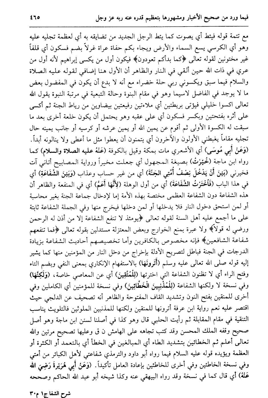 (وعن أبي موسى) أي الأشعري مات بمكة وقيل بالكوفة (عنه عليه الصلاة والسلام) كما رواه ابن ماجة (خيّرت) بصيغة المجهول أي جعلت مخيرا ورواية المصابيح أتاني آت فخيرني (بين أن يدخل نصف أمّتي الجنّة) أي من غير حساب وعذاب (وبين الشّفاعة) أي في هذا الباب (فاخترت الشّفاعة) أي من أول الوهلة (لأنّها أعمّ) أي في المنفعة والظاهر أن هذه الشفاعة دون الشفاعة العظمى مختصة بهذه الأمة إما لإدخال جماعة الجنة بغير محاسبة أو لمن استحق دخول النار فلا يدخلها أو لمن دخلها فيخرج منها وفي الجملة الشفاعة ثابتة على ما أجمع عليه أهل السنة لقوله تعالى يَوْمَئِذٍ لا تَنْفَعُ الشَّفاعَةُ إِلَّا مَنْ أَذِنَ لَهُ الرَّحْمنُ وَرَضِيَ لَهُ قَوْلًا ولا عبرة بمنع الخوارج وبعض المعتزلة مستدلين بقوله تعالى فَما تَنْفَعُهُمْ شَفاعَةُ الشَّافِعِينَ فإنه مخصوص بالكافرين وأما تخصيصهم أحاديث الشفاعة بزيادة الدرجات في الجنة فباطل لتصريح الأدلة بإخراج من دخل النار من المؤمنين منها كما يشير إليه قوله صلى الله تعالى عليه وسلم (أترونها) بالاستفهام الإنكاري بمعنى النفي وبضم التاء وفتح الراء أي لا تظنون الشفاعة التي اخترتها (للمتّقين) أي عن المعاصي خاصة، (ولكنّها) وفي نسخة لا ولكنها الشفاعة (للمذنبين الخطّائين) وفي نسخة للمؤمنين أي الكاملين وفي أخرى للمنقين بفتح النون وتشديد القاف المفتوحة والظاهر أنه تصحيف عن الدلجي حيث اقتصر عليه نعم رواية ابن عرفة أترونها للمنقين ولكنها للمذنبين الملوثين فالتلويث يناسب التنقية في مقام المقابلة ثم رأيت الحلبي قال وهو كذا في أصلنا لسنن ابن ماجة وهو أصل صحيح وقفه الملك المحسن وقد كتب تجاهه على الهامش ن ق وعليها تصحيح مرتين والله تعالى أعلم ثم الخطائين بتشديد الطاء أي المبالغين في الخطأ أي بالتعمد أو الكثرة أو العظمة ويؤيده قوله عليه السلام فيما رواه أبو داود والترمذي شفاعتي لأهل الكبائر من أمتي وفي نسخة الخاطئين وفي أخرى للخاطئين بإعادة العامل تأكيدا. (وعن أبي هريرة رضي الله عنه) أي قال كما في نسخة وقد رواه البيهقي عنه وكذا شيخه أبو عبد الله الحاكم وصححه