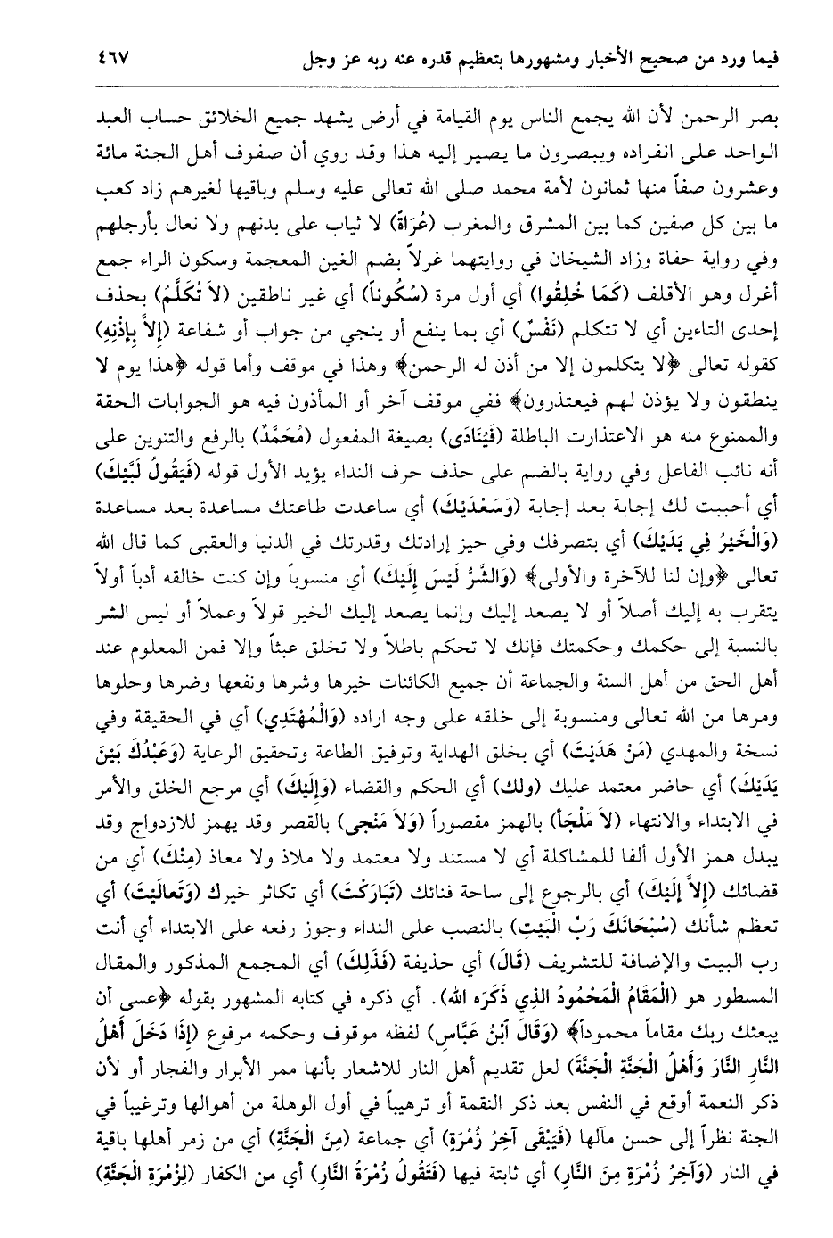 بصر الرحمن لأن الله يجمع الناس يوم القيامة في أرض يشهد جميع الخلائق حساب العبد الواحد على انفراده ويبصرون ما يصير إليه هذا وقد روي أن صفوف أهل الجنة مائة وعشرون صفا منها ثمانون لأمة محمد صلى الله تعالى عليه وسلم وباقيها لغيرهم زاد كعب ما بين كل صفين كما بين المشرق والمغرب (عراة) لا ثياب على بدنهم ولا نعال بأرجلهم وفي رواية حفاة وزاد الشيخان في روايتهما غرلا بضم الغين المعجمة وسكون الراء جمع أغرل وهو الأقلف (كما خلقوا) أي أول مرة (سكونا) أي غير ناطقين (لا تكلّم) بحذف إحدى التاءين أي لا تتكلم (نفس) أي بما ينفع أو ينجي من جواب أو شفاعة (إلّا بإذنه) كقوله تعالى لا يَتَكَلَّمُونَ إِلَّا مَنْ أَذِنَ لَهُ الرَّحْمنُ وهذا في موقف وأما قوله هذا يَوْمُ لا يَنْطِقُونَ وَلا يُؤْذَنُ لَهُمْ فَيَعْتَذِرُونَ ففي موقف آخر أو المأذون فيه هو الجوابات الحقة والممنوع منه هو الاعتذارت الباطلة (فينادى) بصيغة المفعول (محمّد) بالرفع والتنوين على أنه نائب الفاعل وفي رواية بالضم على حذف حرف النداء يؤيد الأول قوله (فيقول لبّيك) أي أحببت لك إجابة بعد إجابة (وسعديك) أي ساعدت طاعتك مساعدة بعد مساعدة (والخير في يديك) أي بتصرفك وفي حيز إرادتك وقدرتك في الدنيا والعقبى كما قال الله تعالى وَإِنَّ لَنا لَلْآخِرَةَ وَالْأُولى (والشّرّ ليس إليك) أي منسوبا وإن كنت خالقه أدبا أولا يتقرب به إليك أصلا أو لا يصعد إليك وإنما يصعد إليك الخير قولا وعملا أو ليس الشر بالنسبة إلى حكمك وحكمتك فإنك لا تحكم باطلا ولا تخلق عبثا وإلا فمن المعلوم عند أهل الحق من أهل السنة والجماعة أن جميع الكائنات خيرها وشرها ونفعها وضرها وحلوها ومرها من الله تعالى ومنسوبة إلى خلقه على وجه اراده (والمهتدي) أي في الحقيقة وفي نسخة والمهدي (من هديت) أي بخلق الهداية وتوفيق الطاعة وتحقيق الرعاية (وعبدك بين يديك) أي حاضر معتمد عليك (ولك) أي الحكم والقضاء (وإليك) أي مرجع الخلق والأمر في الابتداء والانتهاء (لا ملجأ) بالهمز مقصورا (ولا منجى) بالقصر وقد يهمز للازدواج وقد يبدل همز الأول ألفا للمشاكلة أي لا مستند ولا معتمد ولا ملاذ ولا معاذ (منك) أي من قضائك (إلّا إليك) أي بالرجوع إلى ساحة فنائك (تباركت) أي تكاثر خيرك (وتعاليت) أي تعظم شأنك (سبحانك ربّ البيت) بالنصب على النداء وجوز رفعه على الابتداء أي أنت رب البيت والإضافة للتشريف (قال) أي حذيفة (فذلك) أي المجمع المذكور والمقال المسطور هو (المقام المحمود الذي ذكره الله) . أي ذكره في كتابه المشهور بقوله عَسى أَنْ يَبْعَثَكَ رَبُّكَ مَقاماً مَحْمُوداً (وقال ابن عبّاس) لفظه موقوف وحكمه مرفوع (إِذَا دَخَلَ أَهْلُ النَّارِ النَّارَ وَأَهْلُ الْجَنَّةِ الجنّة) لعل تقديم أهل النار للاشعار بأنها ممر الأبرار والفجار أو لأن ذكر النعمة أوقع في النفس بعد ذكر النقمة أو ترهيبا في أول الوهلة من أهوالها وترغيبا في الجنة نظرا إلى حسن مآلها (فيبقى آخر زمرة) أي جماعة (من الجنّة) أي من زمر أهلها باقية في النار (وآخر زمرة من النّار) أي ثابتة فيها (فتقول زمرة النّار) أي من الكفار (لزمرة الجنّة)