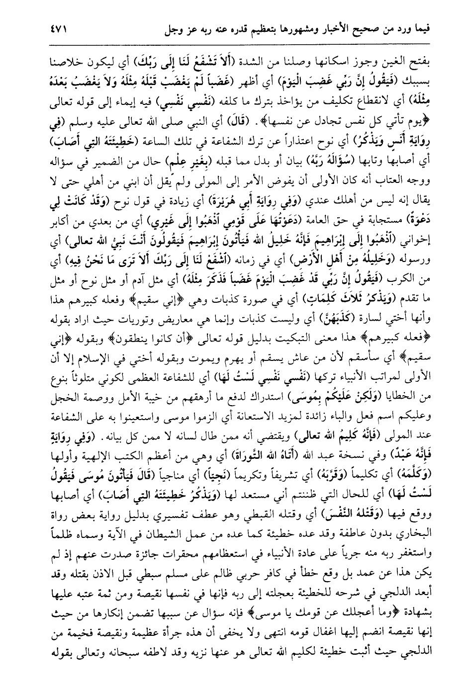 بفتح الغين وجوز اسكانها وصلنا من الشدة (ألا تشفع لنا إلى ربّك) أي ليكون خلاصنا بسببك (فيقول إنّ ربّي غضب اليوم) أي أظهر (غَضَبًا لَمْ يَغْضَبْ قَبْلَهُ مِثْلَهُ وَلَا يَغْضَبُ بعده مثله) أي لانقطاع تكليف من يؤاخذ بترك ما كلفه (نفسي نفسي) فيه إيماء إلى قوله تعالى يَوْمَ تَأْتِي كُلُّ نَفْسٍ تُجادِلُ عَنْ نَفْسِها. (قال) أي النبي صلى الله تعالى عليه وسلم (في رواية أنس ويذكر) أي نوح اعتذارا عن ترك الشفاعة في تلك الساعة (خطيئة التي أصاب) أي أصابها وتابها (سؤاله ربّه) بيان أو بدل مما قبله (بغير علم) حال من الضمير في سؤاله ووجه العتاب أنه كان الأولى أن يفوض الأمر إلى المولى ولم يقل أن ابني من أهلي حتى لا يقال إنه ليس من أهلك عندي (وفي رواية أبي هريرة) أي زيادة في قول نوح (وقد كانت لي دعوة) مستجابة في حق العامة (دعوتها على قومي اذهبوا إلى غيري) أي من بعدي من أكابر إخواني (اذْهَبُوا إِلَى إِبْرَاهِيمَ فَإِنَّهُ خَلِيلُ اللَّهِ فَيَأْتُونَ إبراهيم فيقولون أنت نبيّ الله تعالى) أي ورسوله (وخليله من أهل الأرض) أي في زمانه (اشْفَعْ لَنَا إِلَى رَبِّكَ أَلَا تَرَى مَا نحن فيه) أي من الكرب (فَيَقُولُ إِنَّ رَبِّي قَدْ غَضِبَ الْيَوْمَ غَضَبًا فذكر مثله) أي مثل آدم أو مثل نوح أو مثل ما تقدم (ويذكر ثلاث كلمات) أي في صورة كذبات وهي إِنِّي سَقِيمٌ وفعله كبيرهم هذا وأنها أختي لسارة (كذبهنّ) أي وليست كذبات وإنما هي معاريض وتوريات حيث اراد بقوله فَعَلَهُ كَبِيرُهُمْ هذا معنى التبكيت بدليل قوله تعالى إِنْ كانُوا يَنْطِقُونَ وبقوله إِنِّي سَقِيمٌ أي سأسقم لأن من عاش يسقم أو يهرم ويموت وبقوله أختي في الإسلام إلا أن الأولى لمراتب الأنبياء تركها (نفسي نفسي لست لها) أي للشفاعة العظمى لكوني متلوثا بنوع من الخطايا (ولكن عليكم بموسى) استدراك لدفع ما أرهقهم من خيبة الأمل ووصمة الخجل وعليكم اسم فعل والباء زائدة لمزيد الاستعانة أي الزموا موسى واستعينوا به على الشفاعة عند المولى (فإنّه كليم الله تعالى) ويقتضي أنه ممن طال لسانه لا ممن كل بيانه. (وفي رواية فإنّه عبد) وفي نسخة عبد الله (أتاه الله التّوراة) أي وهي من أعظم الكتب الإلهية وأولها (وكلّمه) أي تكليما (وقرّبه) أي تشريفا وتكريما (نجيّا) أي مناجيا (قال فيأتون موسى فيقول لست لها) أي للحال التي ظننتم أني مستعد لها (ويذكر خطيئته التي أصاب) أي أصابها ووقع فيها (وقتله النّفس) أي وقتله القبطي وهو عطف تفسيري بدليل رواية بعض رواة البخاري بدون عاطفة وقد عده خطيئة كما عده من عمل الشيطان في الآية وسماه ظلما واستغفر ربه منه جريا على عادة الأنبياء في استعظامهم محقرات جائزة صدرت عنهم إذ لم يكن هذا عن عمد بل وقع خطأ في كافر حربي ظالم على مسلم سبطي قبل الاذن بقتله وقد أبعد الدلجي في شرحه للخطيئة بعجلته إلى ربه فإنها في نفسها نقيصة ومن ثمة عتبه عليها بشهادة وَما أَعْجَلَكَ عَنْ قَوْمِكَ يا مُوسى فإنه سؤال عن سببها تضمن إنكارها من حيث إنها نقيصة انضم إليها اغفال قومه انتهى ولا يخفى أن هذه جرأة عظيمة ونقيصة فخيمة من الدلجي حيث أثبت خطيئة لكليم الله تعالى هو عنها نزيه وقد لاطفه سبحانه وتعالى بقوله
