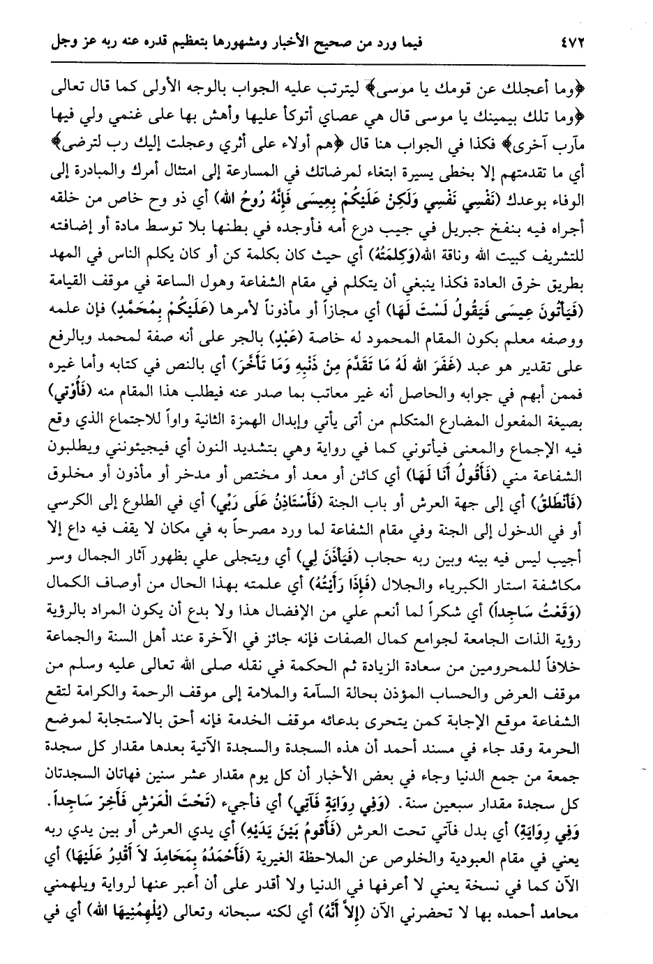 وَما أَعْجَلَكَ عَنْ قَوْمِكَ يا مُوسى ليترتب عليه الجواب بالوجه الأولى كما قال تعالى وَما تِلْكَ بِيَمِينِكَ يا مُوسى قالَ هِيَ عَصايَ أَتَوَكَّؤُا عَلَيْها وَأَهُشُّ بِها عَلى غَنَمِي وَلِيَ فِيها مَآرِبُ أُخْرى فكذا في الجواب هنا قال هُمْ أُولاءِ عَلى أَثَرِي وَعَجِلْتُ إِلَيْكَ رَبِّ لِتَرْضى أي ما تقدمتهم إلا بخطى يسيرة ابتغاء لمرضاتك في المسارعة إلى امتثال أمرك والمبادرة إلى الوفاء بوعدك (نَفْسِي نَفْسِي وَلَكِنْ عَلَيْكُمْ بِعِيسَى فَإِنَّهُ رُوحُ الله) أي ذو وح خاص من خلقه أجراه فيه بنفخ جبريل في جيب درع أمه فأوجده في بطنها بلا توسط مادة أو إضافته للتشريف كبيت الله وناقة الله (وكلمته) أي حيث كان بكلمة كن أو كان يكلم الناس في المهد بطريق خرق العادة فكذا ينبغي أن يتكلم في مقام الشفاعة وهول الساعة في موقف القيامة (فيأتون عيسى فيقول لست لها) أي مجازا أو مأذونا لأمرها (عليكم بمحمّد) فإن علمه ووصفه معلم بكون المقام المحمود له خاصة (عبد) بالجر على أنه صفة لمحمد وبالرفع على تقدير هو عَبْدٌ (غَفَرَ اللَّهُ لَهُ مَا تَقَدَّمَ مِنْ ذنبه وما تأخّر) أي بالنص في كتابه وأما غيره فممن أبهم في جوابه والحاصل أنه غير معاتب بما صدر عنه فيطلب هذا المقام منه (فأوتي) بصيغة المفعول المضارع المتكلم من أتى يأتي وإبدال الهمزة الثانية واوا للاجتماع الذي وقع فيه الإجماع والمعنى فيأتوني كما في رواية وهي بتشديد النون أي فيجيئونني ويطلبون الشفاعة مني (فأقول أنا لها) أي كائن أو معد أو مختص أو مدخر أو مأذون أو مخلوق (فأنطلق) أي إلى جهة العرش أو باب الجنة (فأستاذن على ربّي) أي في الطلوع إلى الكرسي أو في الدخول إلى الجنة وفي مقام الشفاعة لما ورد مصرحا به في مكان لا يقف فيه داع إلا أجيب ليس فيه بينه وبين ربه حجاب (فيأذن لي) أي ويتجلى علي بظهور آثار الجمال وسر مكاشفة استار الكبرياء والجلال (فإذا رأيته) أي علمته بهذا الحال من أوصاف الكمال (وقعت ساجدا) أي شكرا لما أنعم علي من الإفضال هذا ولا بدع أن يكون المراد بالرؤية رؤية الذات الجامعة لجوامع كمال الصفات فإنه جائز في الآخرة عند أهل السنة والجماعة خلافا للمحرومين من سعادة الزيادة ثم الحكمة في نقله صلى الله تعالى عليه وسلم من موقف العرض والحساب المؤذن بحالة السآمة والملامة إلى موقف الرحمة والكرامة لتقع الشفاعة موقع الإجابة كمن يتحرى بدعائه موقف الخدمة فإنه أحق بالاستجابة لموضع الحرمة وقد جاء في مسند أحمد أن هذه السجدة والسجدة والسجدة الآتية بعدها مقدار كل سجدة جمعة من جمع الدنيا وجاء في بعض الأخبار أن كل يوم مقدار عشر سنين فهاتان السجدتان كل سجدة مقدار سبعين سنة. (وفي رواية فآتي) أي فأجيء (تحت العرش فأخرّ ساجدا.