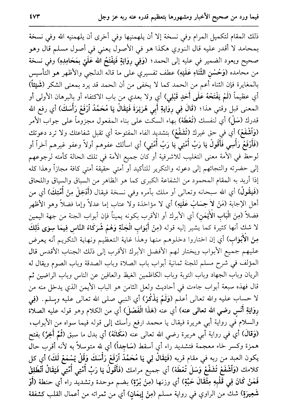 ذلك المقام لتكميل المرام وفي نسخة إلا أن يلهمنيها وفي أخرى أن يلهمنيه الله وفي نسخة بمحامد لا أقدر عليه قال النووي هكذا هو في الأصول يعني في أصول مسلم قال وهو صحيح ويعود الضمير في عليه إلى الحمد؛ (وفي رواية فيفتح الله عليّ بمحامده) وفي نسخة من محامده (وحسن الثّناء عليه) عطف تفسيري على ما قاله الدلجي والأظهر هو التأسيس بالمغايرة فإن الثناء أعم من الحمد كما لا يخفى من أن الحمد قد يرد بمعنى الشكر (شيئا) أي عظيما (لم يفتحه على أحد قبلي) أي ولا بعدي من باب الاكتفاء أو بالبرهان الأولى أو المعنى قبل وقتي هذا؛ (قَالَ فِي رِوَايَةِ أَبِي هُرَيْرَةَ فَيُقَالُ يَا محمّد ارفع رأسك) أي رفع الله قدرك (سل) أي لنفسك (تعطه) بهاء السكت على بناء المفعول مجزوما على جواب الأمر (واشفع) أي في حق غيرك (تشفّع) بتشديد الفاء المفتوحة أي تقبل شفاعتك ولا ترد دعوتك (فَأَرْفَعُ رَأْسِي فَأَقُولُ يَا رَبِّ أُمَّتِي يَا ربّ أمّتي) أي اسألك عفوهم أولا وعفو غيرهم آخرا أو لوحظ في الأمة معنى التغليب للاشرفية أو كان جميع الأمة في تلك الحالة كأمته لرجوعهم إلى حضرته والتجائهم إلى دعوته والتكرير للتأكيد أو أمتي حقيقة أمتي كافة مجازا وهذا كله إذا أريد به المقام المحمود من الشفاعة الكبرى كما هو الظاهر من السباق والسياق واللحاق (فيقول) أي الله سبحانه وتعالى أو ملك بأمره وفي نسخة فيقال (أدخل من أمّتك) أي من أهل الإجابة (من لا حساب عليه) أي لا مؤاخذة ولا عتاب إما عدلا وإما فضلا وهو الأظهر فضلا (من الباب الأيمن) أي الأبرك أو الأقرب بكونه يمينا فإن أبواب الجنة من جهة اليمين لا شك أنها كثيرة كما يشير إليه قوله (مِنْ أَبْوَابِ الْجَنَّةِ وَهُمْ شُرَكَاءُ النَّاسِ فِيمَا سوى ذلك من الأبواب) أي إن اختاروا دخلوهم منها وهذا غاية التعظيم ونهاية التكريم أنه يعرض عليهم جميع الأبواب ويختار لهم الأفضل الأبرك الأقرب إلى ذلك الجناب الأقدس قال المؤلف في شرح مسلم للجنة ثمانية أبواب باب الصلاة وباب الصدقة وباب الصوم ويقال له الريان وباب الجهاد وباب التوبة وباب الكاظمين الغيظ والعافين عن الناس وباب الراضين ثم قال فهذه سبعة أبواب جاءت في أحاديث ولعل الثامن هو الباب الأيمن الذي يدخل منه من لا حساب عليه والله تعالى أعلم (ولم يذكر) أي النبي صلى الله تعالى عليه وسلم. (في رواية أنس رضي الله تعالى عنه) أي عنه (هذا الفضل) أي من الكلام وهو قوله عليه الصلاة والسلام فِي رِوَايَةِ أَبِي هُرَيْرَةَ فَيُقَالُ يَا مُحَمَّدُ ارفع رأسك إلى قوله فيما سواه من الأبواب، (وقال) أي في رواية أبي هريرة رضي الله تعالى عنه (مكانه) أي بدل ما سبق (ثمّ أخرّ) بفتح همزة وكسر خاء معجمة فتشديد راء أي أسقط (ساجدا) أي لله متوسلا به لأنه أقرب حال يكون العبد من ربه في مقام قربه (فَيُقَالُ لِي يَا مُحَمَّدُ ارْفَعْ رَأْسَكَ وَقُلْ يسمع لك) أي كل كلامك (واشفع تشفّع وسل تعطه) أي جميع مرامك (فَأَقُولُ يَا رَبِّ أُمَّتِي أُمَّتِي فَيُقَالُ انْطَلِقْ فمن كان في قلبه مثقال حبّة) أي وزنها (من برّة) بضم موحدة وتشديد راء أي حنطة (أو شعيرة) شك من الراوي في رواية مسلم (من إيمان) أي من ثمراته من أعمال القلب كشفقة