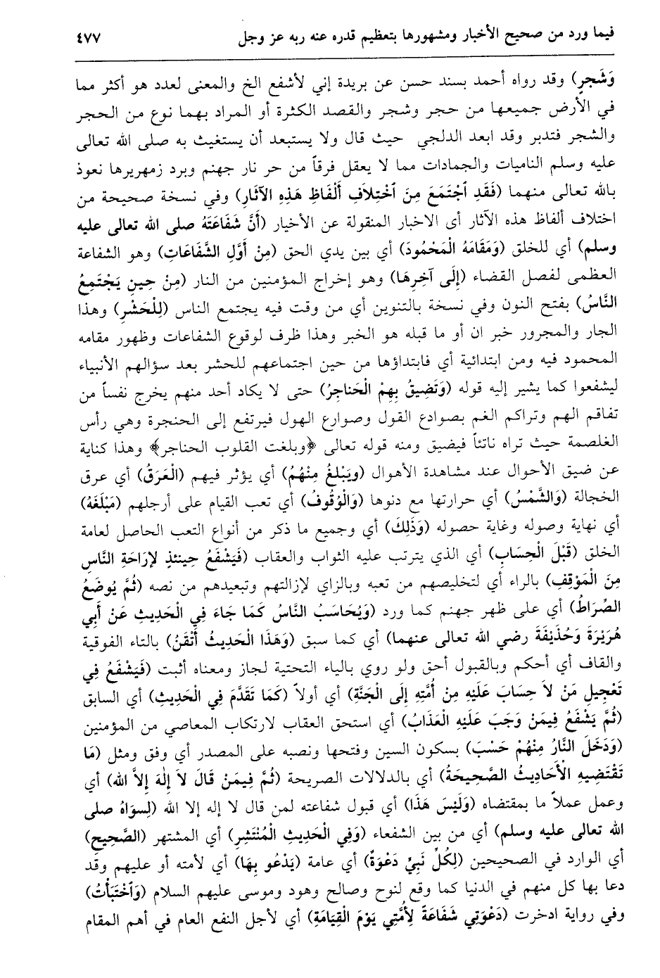 وشجر) وقد رواه أحمد بسند حسن عن بريدة إني لأشفع الخ والمعنى لعدد هو أكثر مما في الأرض جميعها من حجر وشجر والقصد الكثرة أو المراد بهما نوع من الحجر والشجر فتدبر وقد ابعد الدلجي حيث قال ولا يستبعد أن يستغيث به صلى الله تعالى عليه وسلم الناميات والجمادات مما لا يعقل فرقا من حر نار جهنم وبرد زمهريرها نعوذ بالله تعالى منهما (فَقَدِ اجْتَمَعَ مِنَ اخْتِلَافِ أَلْفَاظِ هَذِهِ الْآثَارِ) وفي نسخة صحيحة من اختلاف ألفاظ هذه الآثار أي الاخبار المنقولة عن الأخيار (أنّ شفاعته صلى الله تعالى عليه وسلم) أي للخلق (ومقامه المحمود) أي بين يدي الحق (من أوّل الشّفاعات) وهو الشفاعة العظمى لفصل القضاء (إلى آخرها) وهو إخراج المؤمنين من النار (من حين يجتمع النّاس) بفتح النون وفي نسخة بالتنوين أي من وقت فيه يجتمع الناس (للحشر) وهذا الجار والمجرور خبر ان أو ما قبله هو الخبر وهذا ظرف لوقوع الشفاعات وظهور مقامه المحمود فيه ومن ابتدائية أي فابتداؤها من حين اجتماعهم للحشر بعد سؤالهم الأنبياء ليشفعوا كما يشير إليه قوله (وتضيق بهم الحناجر) حتى لا يكاد أحد منهم يخرج نفسا من تفاقم الهم وتراكم الغم بصوادع القول وصوارع الهول فيرتفع إلى الحنجرة وهي رأس الغلصمة حيث تراه ناتئا فيضيق ومنه قوله تعالى وَبَلَغَتِ الْقُلُوبُ الْحَناجِرَ وهذا كناية عن ضيق الأحوال عند مشاهدة الأهوال (ويبلغ منهم) أي يؤثر فيهم (العرق) أي عرق الخجالة (والشّمس) أي حرارتها مع دنوها (والوقوف) أي تعب القيام على أرجلهم (مبلغه) أي نهاية وصوله وغاية حصوله (وذلك) أي وجميع ما ذكر من أنواع التعب الحاصل لعامة الخلق (قبل الحساب) أي الذي يترتب عليه الثواب والعقاب (فيشفع حينئذ لإراحة النّاس من الموقف) بالراء أي لتخليصهم من تعبه وبالزاي لإزالتهم وتبعيدهم من نصه (ثمّ يوضع الصّراط) أي على ظهر جهنم كما ورد (وَيُحَاسَبُ النَّاسُ كَمَا جَاءَ فِي الْحَدِيثِ عَنْ أبي هريرة وحذيفة رضي الله تعالى عنهما) أي كما سبق (وهذا الحديث أتقن) بالتاء الفوقية والقاف أي أحكم وبالقبول أحق ولو روي بالياء التحتية لجاز ومعناه أثبت (فَيُشَفَّعُ فِي تَعْجِيلِ مَنْ لَا حِسَابَ عَلَيْهِ من أمّته إلى الجنّة) أي أولا (كما تقدّم في الحديث) أي السابق (ثمّ يشفع فيمن وجب عليه العذاب) أي استحق العقاب لارتكاب المعاصي من المؤمنين (ودخل النّار منهم حسب) بسكون السين وفتحها ونصبه على المصدر أي وفق ومثل (ما تقتضيه الأحاديث الصّحيحة) أي بالدلالات الصريحة (ثُمَّ فِيمَنْ قَالَ لَا إِلَهَ إِلَّا اللَّهُ) أي وعمل عملا ما بمقتضاه (وليس هذا) أي قبول شفاعته لمن قال لا إله إلا الله (لسواه صلى الله تعالى عليه وسلم) أي من بين الشفعاء (وفي الحديث المنتشر) أي المشتهر (الصّحيح) أي الوارد في الصحيحين (لكلّ نبيّ دعوة) أي عامة (يدعو بها) أي لأمته أو عليهم وقد دعا بها كل منهم في الدنيا كما وقع لنوح وصالح وهود وموسى عليهم السلام (واختبأت) وفي رواية ادخرت (دعوتي شفاعة لأمّتي يوم القيامة) أي لأجل النفع العام في أهم المقام