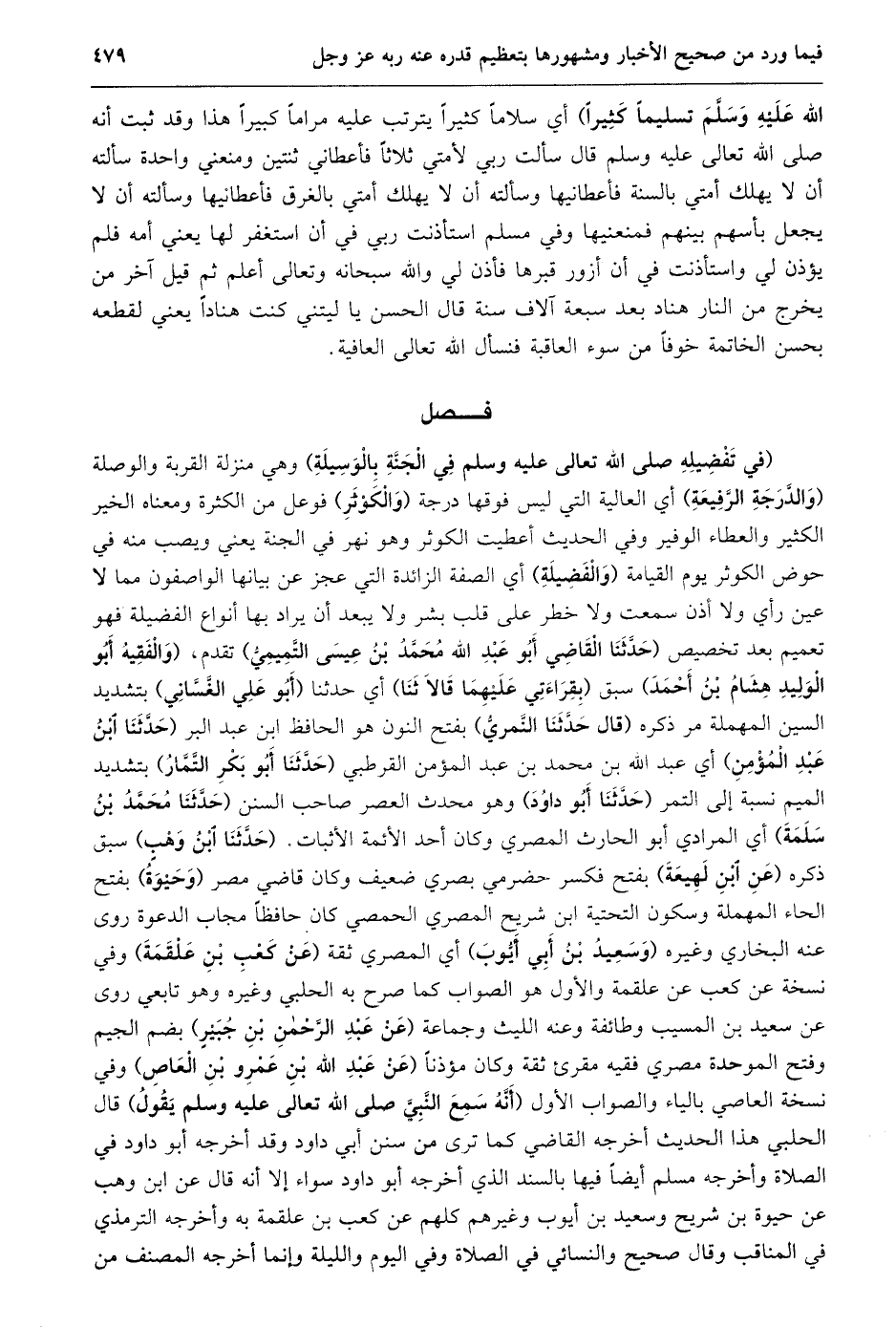 (في تفضيله صلى الله تعالى عليه وسلم في الجنّة بالوسيلة) وهي منزلة القربة والوصلة (والدّرجة الرّفيعة) أي العالية التي ليس فوقها درجة (والكوثر) فوعل من الكثرة ومعناه الخير الكثير والعطاء الوفير وفي الحديث أعطيت الكوثر وهو نهر في الجنة يعني ويصب منه في حوض الكوثر يوم القيامة (والفضيلة) أي الصفة الزائدة التي عجز عن بيانها الواصفون مما لا عين رأي ولا أذن سمعت ولا خطر على قلب بشر ولا يبعد أن يراد بها أنواع الفضيلة فهو تعميم بعد تخصيص (حَدَّثَنَا الْقَاضِي أَبُو عَبْدِ اللَّهِ مُحَمَّدُ بْنُ عيسى التّميميّ) تقدم، (والفقيه أبو الوليد هشام بن أحمد) سبق (بقراءتي عليهما قالا ثنا) أي حدثنا (أبو علي الغّسّاني) بتشديد السين المهملة مر ذكره (قال حدّثنا النّمريّ) بفتح النون هو الحافظ ابْنُ عَبْدِ الْبَرِّ (حَدَّثَنَا ابْنُ عَبْدِ الْمُؤْمِنِ) أي عبد الله بن محمد بن عبد المؤمن القرطبي (حدّثنا أبو بكر التّمّار) بتشديد الميم نسبة إلى التمر (حدّثنا أبو داود) وهو محدث العصر صاحب السنن (حدّثنا محمّد بن سلمة) أي المرادي أبو الحارث المصري وكان أحد الأئمة الأثبات. (حدّثنا ابن وهب) سبق ذكره (عن ابن لهيعة) بفتح فكسر حضرمي بصري ضعيف وكان قاضي مصر (وحيوة) بفتح الحاء المهملة وسكون التحتية ابن شريح المصري الحمصي كان حافظا مجاب الدعوة روى عنه البخاري وغيره (وسعيد بن أبي أيّوب) أي المصري ثقة (عن كعب بن علقمة) وفي نسخة عن كعب عن علقمة والأول هو الصواب كما صرح به الحلبي وغيره وهو تابعي روى عن سعيد بن المسيب وطائفة وعنه الليث وجماعة (عن عبد الرّحمن بن جبير) بضم الجيم وفتح الموحدة مصري فقيه مقرئ ثقة وكان مؤذنا (عَنْ عَبْدِ اللَّهِ بْنِ عَمْرِو بْنِ الْعَاصِ) وفي نسخة العاصي بالياء والصواب الأول (أنّه سمع النّبيّ صلى الله تعالى عليه وسلم يقول) قال الحلبي هذا الحديث أخرجه القاضي كما ترى من سنن أبي داود وقد أخرجه أبو داود في الصلاة وأخرجه مسلم أيضا فيها بالسند الذي أخرجه أبو داود سواء إلا أنه قال عن ابن وهب عن حيوة بن شريح وسعيد بن أيوب وغيرهم كلهم عن كعب بن علقمة به وأخرجه الترمذي في المناقب وقال صحيح والنسائي في الصلاة وفي اليوم والليلة وإنما أخرجه المصنف من