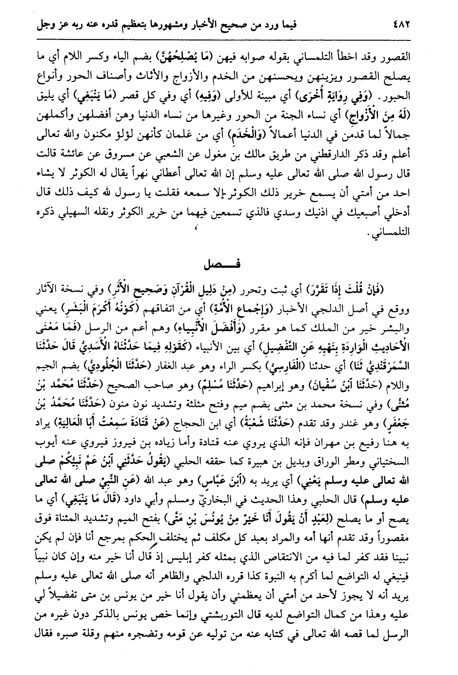 (فإن قلت إذا تقرّر) أي ثبت وتحرر (من دليل القرآن وصحيح الأثر) وفي نسخة الآثار ووقع في أصل الدلجي الأخبار (وإجماع الأمّة) أي من اتفاقهم (كونه أكرم البشر) يعني والبشر خير من الملك كما هو مقرر (وأفضل الأنبياء) وهم أعم من الرسل (فَمَا مَعْنَى الْأَحَادِيثِ الْوَارِدَةِ بِنَهْيِهِ عَنِ التَّفْضِيلِ) أي بين الأنبياء (كَقَوْلِهِ فِيمَا حَدَّثَنَاهُ الْأَسَدِيُّ قَالَ حَدَّثَنَا السَّمَرْقَنْدِيُّ ثنا) أي حدثنا (الفارسيّ) بكسر الراء وهو عبد الغفار (حدّثنا الجلوديّ) بضم الجيم واللام (حدّثنا ابن سفيان) وهو إبراهيم (حدّثنا مسلم) وهو صاحب الصحيح (حدّثنا محمّد بن مثنّى) وفي نسخة محمد بن مثنى بضم ميم وفتح مثلثة وتشديد نون منون (حدّثنا محمّد بن جعفر) وهو غندر وقد تقدم (حدّثنا شعبة) أي ابن الحجاج (عن قتادة سمعت أبا العالية) يراد به هنا رفيع بن مهران فإنه الذي يروي عنه قتادة وأما زياده بن فيروز فيروي عنه أيوب السختياني ومطر الوراق وبديل بن هبيرة كما حققه الحلبي (يَقُولُ حَدَّثَنِي ابْنُ عَمِّ نَبِيِّكُمْ صَلَّى اللَّهُ تعالى عليه وسلم يعني) أي يريد به (ابن عبّاس) وهو عبد الله (عن النّبيّ صلى الله تعالى عليه وسلم) قال الحلبي وهذا الحديث في البخاري ومسلم وأبي داود (قال ما ينبغي) أي ما يصح أو ما يصلح (لِعَبْدٍ أَنْ يَقُولَ أَنَا خَيْرٌ مِنْ يُونُسَ بن متّى) بفتح الميم وتشديد المثناة فوق مقصورا وقد تقدم أنها أمه والمراد بعبد كل مكلف ثم يختلف الحكم بمرجع أنا فإن لم يكن نبينا فقد كفر لما فيه من الانتقاص الذي بمثله كفر إبليس إذ قال أنا خير منه وإن كان نبيا فينبغي له التواضع لما أكرم به النبوة كذا قرره الدلجي والظاهر أنه صلى الله تعالى عليه وسلم يريد أنه لا يجوز لأحد من أمتي أن يعظمني وأن يَقُولَ أَنَا خَيْرٌ مِنْ يُونُسَ بْنِ مَتَّى تفضيلا لي عليه وهذا من كمال التواضع لديه قال التوربشتي وإنما خص يونس بالذكر دون غيره من الرسل لما قصه الله تعالى في كتابه عنه من توليه عن قومه وتضجره منهم وقلة صبره فقال