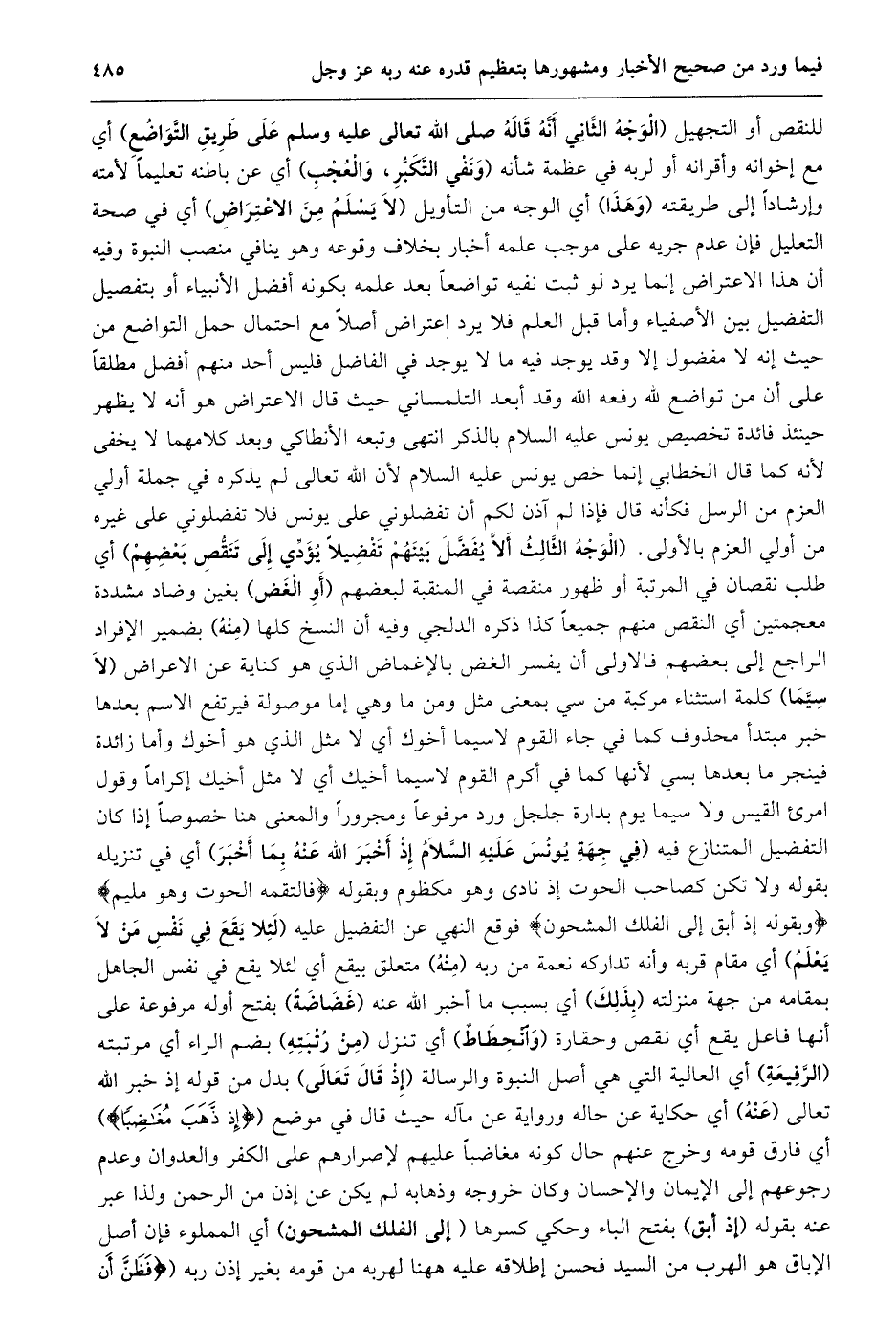 للنقص أو التجهيل (الوجه الثّاني أنّه قاله صلى الله تعالى عليه وسلم على طريق التّواضع) أي مع إخوانه وأقرانه أو لربه في عظمة شأنه (ونفي التّكبّر، والعجب) أي عن باطنه تعليما لأمته وإرشادا إلى طريقته (وهذا) أي الوجه من التأويل (لا يسلم من الاعتراض) أي في صحة التعليل فإن عدم جريه على موجب علمه أخبار بخلاف وقوعه وهو ينافي منصب النبوة وفيه أن هذا الاعتراض إنما يرد لو ثبت نفيه تواضعا بعد علمه بكونه أفضل الأنبياء أو بتفصيل التفضيل بين الأصفياء وأما قبل العلم فلا يرد اعتراض أصلا مع احتمال حمل التواضع من حيث إنه لا مفضول إلا وقد يوجد فيه ما لا يوجد في الفاضل فليس أحد منهم أفضل مطلقا على أن من تواضع لله رفعه الله وقد أبعد التلمساني حيث قال الاعتراض هو أنه لا يظهر حينئذ فائدة تخصيص يونس عليه السلام بالذكر انتهى وتبعه الأنطاكي وبعد كلامهما لا يخفى لأنه كما قال الخطابي إنما خص يونس عليه السلام لأن الله تعالى لم يذكره في جملة أولي العزم من الرسل فكأنه قال فإذا لم آذن لكم أن تفضلوني على يونس فلا تفضلوني على غيره من أولي العزم بالأولى. (الْوَجْهُ الثَّالِثُ أَلَّا يُفَضِّلَ بَيْنَهُمْ تَفْضِيلًا يُؤَدِّي إلى تنقّص بعضهم) أي طلب نقصان في المرتبة أو ظهور منقصة في المنقبة لبعضهم (أو الغض) بغين وضاد مشددة معجمتين أي النقص منهم جميعا كذا ذكره الدلجي وفيه أن النسخ كلها (منه) بضمير الإفراد الراجع إلى بعضهم فالاولى أن يفسر الغض بالإغماض الذي هو كناية عن الاعراض (لا سيّما) كلمة استثناء مركبة من سي بمعنى مثل ومن ما وهي إما موصولة فيرتفع الاسم بعدها خبر مبتدأ محذوف كما في جاء القوم لا سيما أخوك أي لا مثل الذي هو أخوك وأما زائدة فينجر ما بعدها بسي لأنها كما في أكرم القوم لا سيما أخيك أي لا مثل أخيك إكراما وقول امرئ القيس ولا سيما يوم بدارة جلجل ورد مرفوعا ومجرورا والمعنى هنا خصوصا إذا كان التفضيل المتنازع فيه (فِي جِهَةِ يُونُسَ عَلَيْهِ السَّلَامُ إِذْ أَخْبَرَ الله عنه بما أخبر) أي في تنزيله بقوله ولا تكن كصاحب الحوت إذ نادى وهو مكظوم وبقوله فَالْتَقَمَهُ الْحُوتُ وَهُوَ مُلِيمٌ وبقوله إِذْ أَبَقَ إِلَى الْفُلْكِ الْمَشْحُونِ